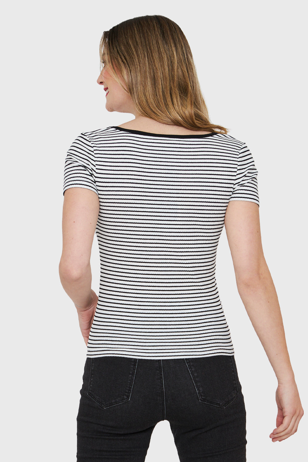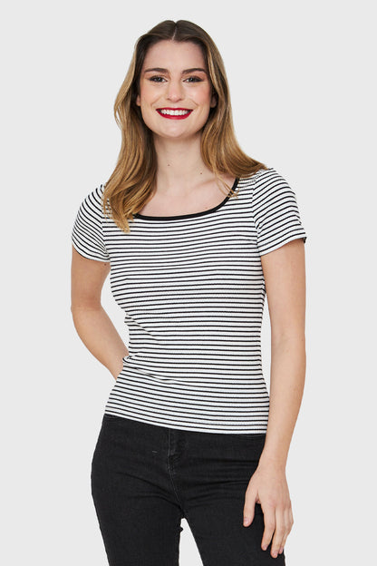 Características: Polera manga corta básica rayas. Escote cuadrado. Muy elasticada.