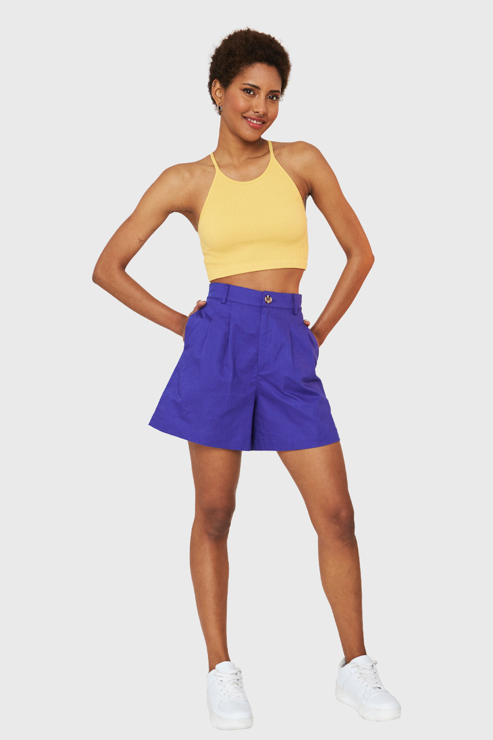 Características: Short tiro alto. Cierre y botón de ajuste. Pretina elasticada en la espalda y normal por delante. Presillas en la pretina. 4 bolsillos funcionales.