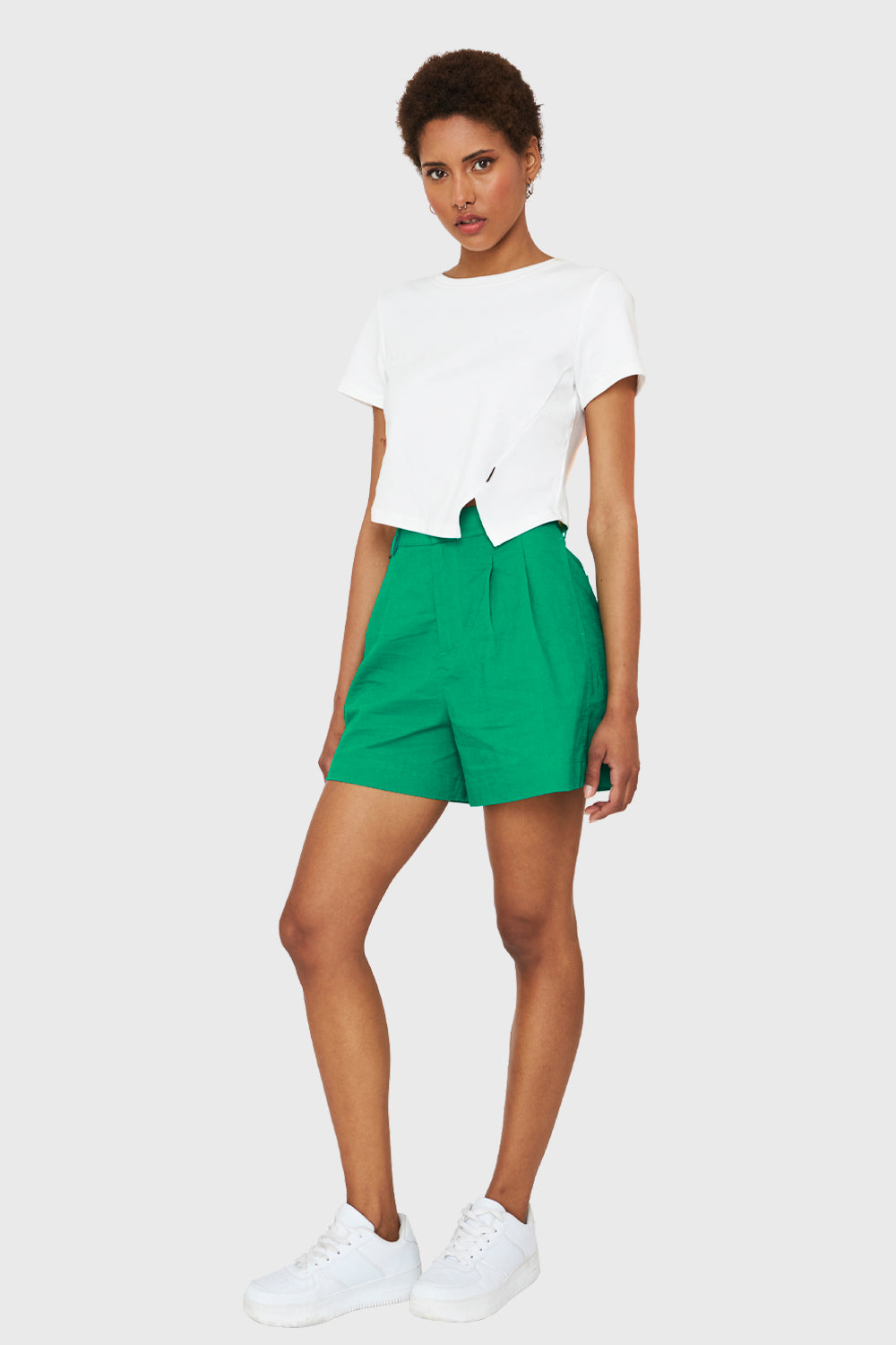 Características: Short tiro alto. Cierre y botón de ajuste. Pretina elasticada en la espalda y normal por delante. Presillas en la pretina. 4 bolsillos funcionales.