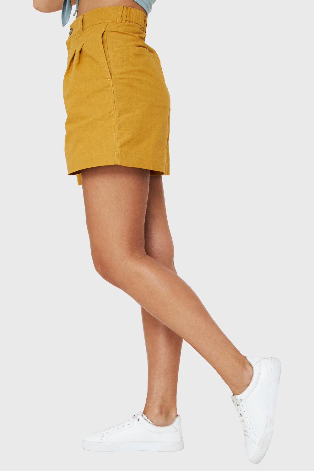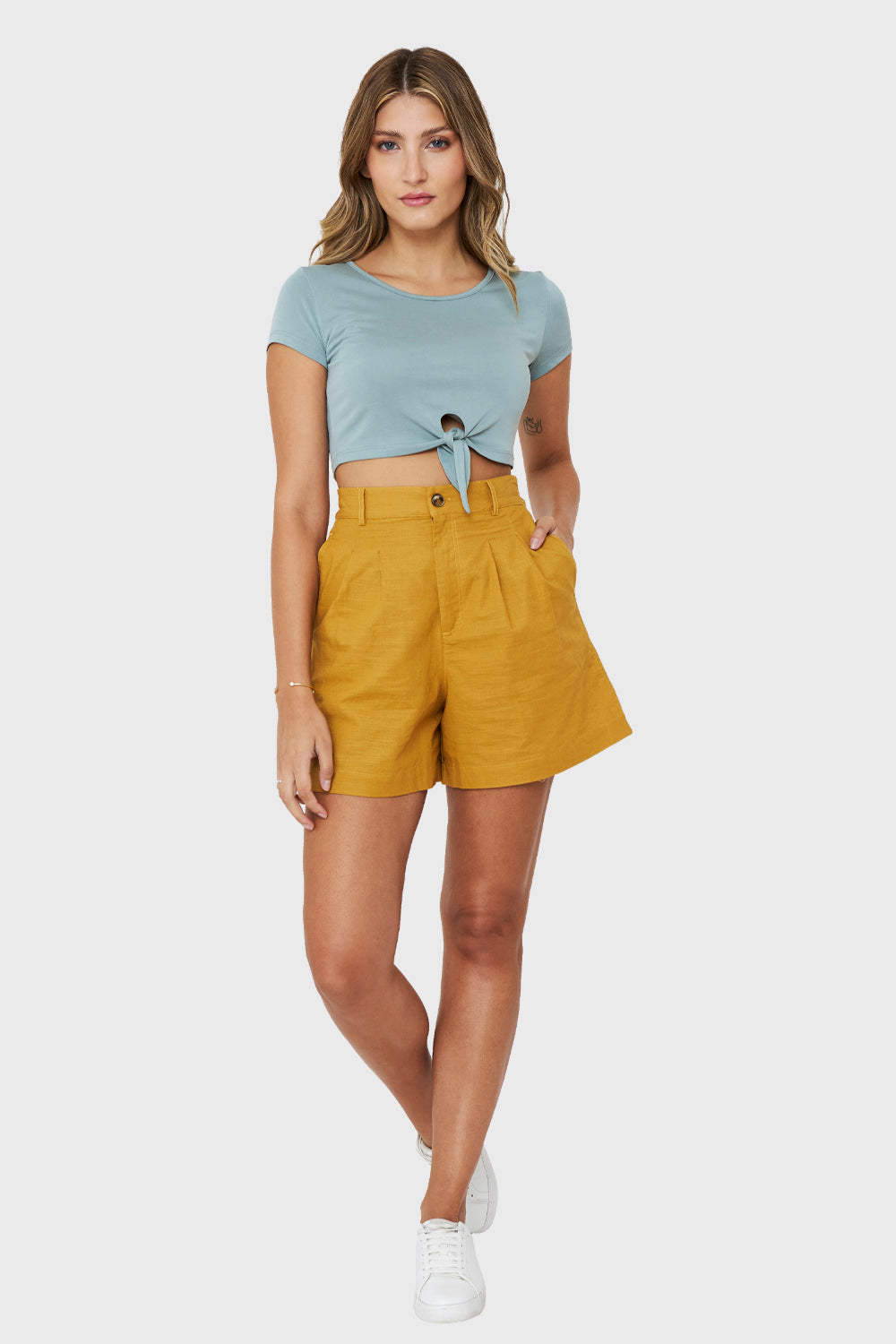 Características: Short tiro alto. Cierre y botón de ajuste. Pretina elasticada en la espalda y normal por delante. Presillas en la pretina. 4 bolsillos funcionales.