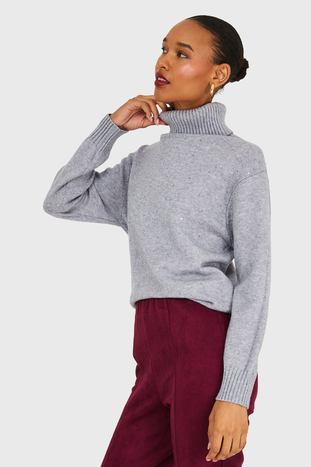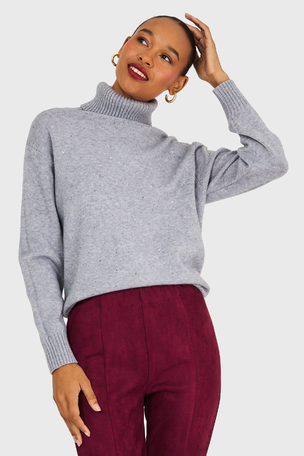 Características: Sweater cuello beatle con strass en la parte frontal. Pretina en puños, basta y cuello.
