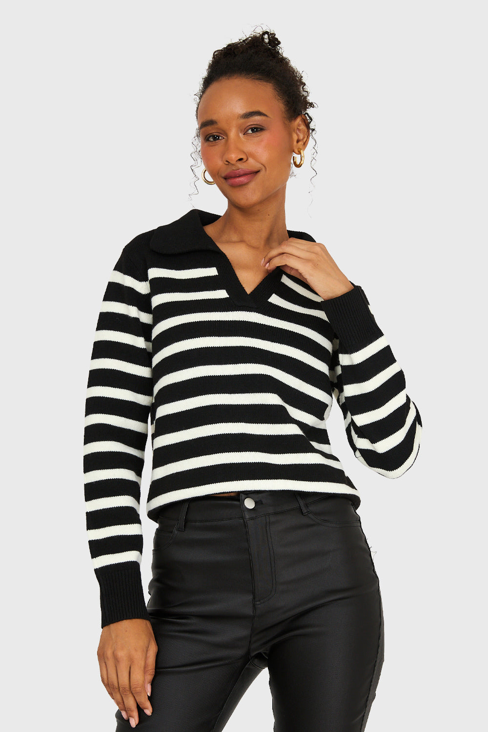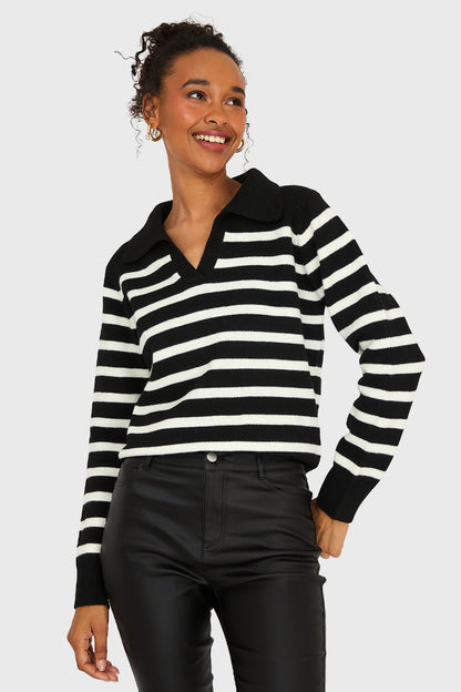 Características: Sweater diseño a rayas. Cuello polo con escote en V. Pretina en puños y basta.