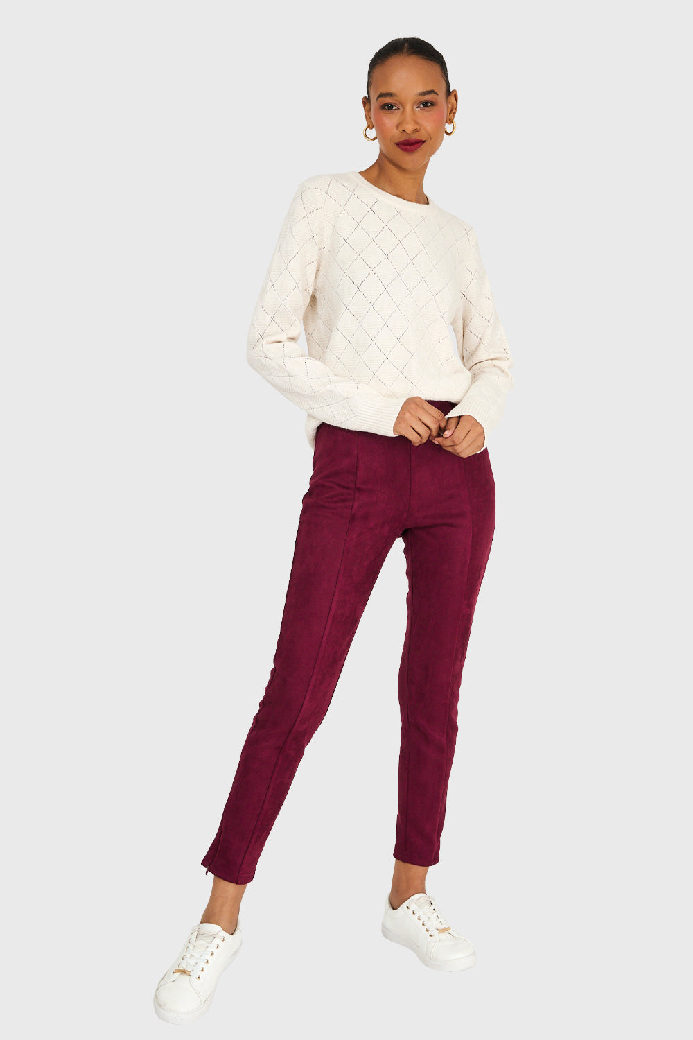 Características: Sweater de punto con diseño de rombo. Pretina en cuello, puños y basta.
