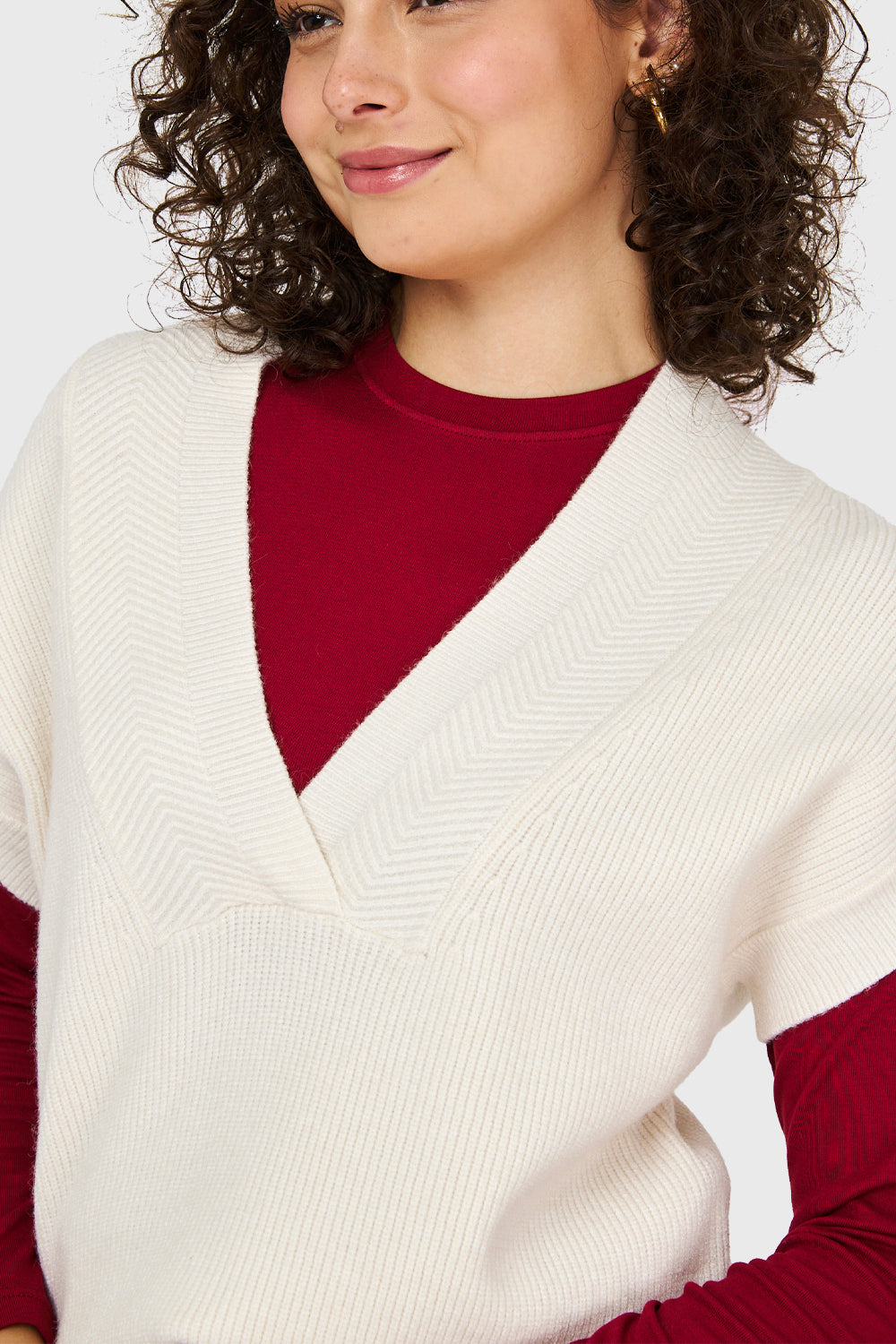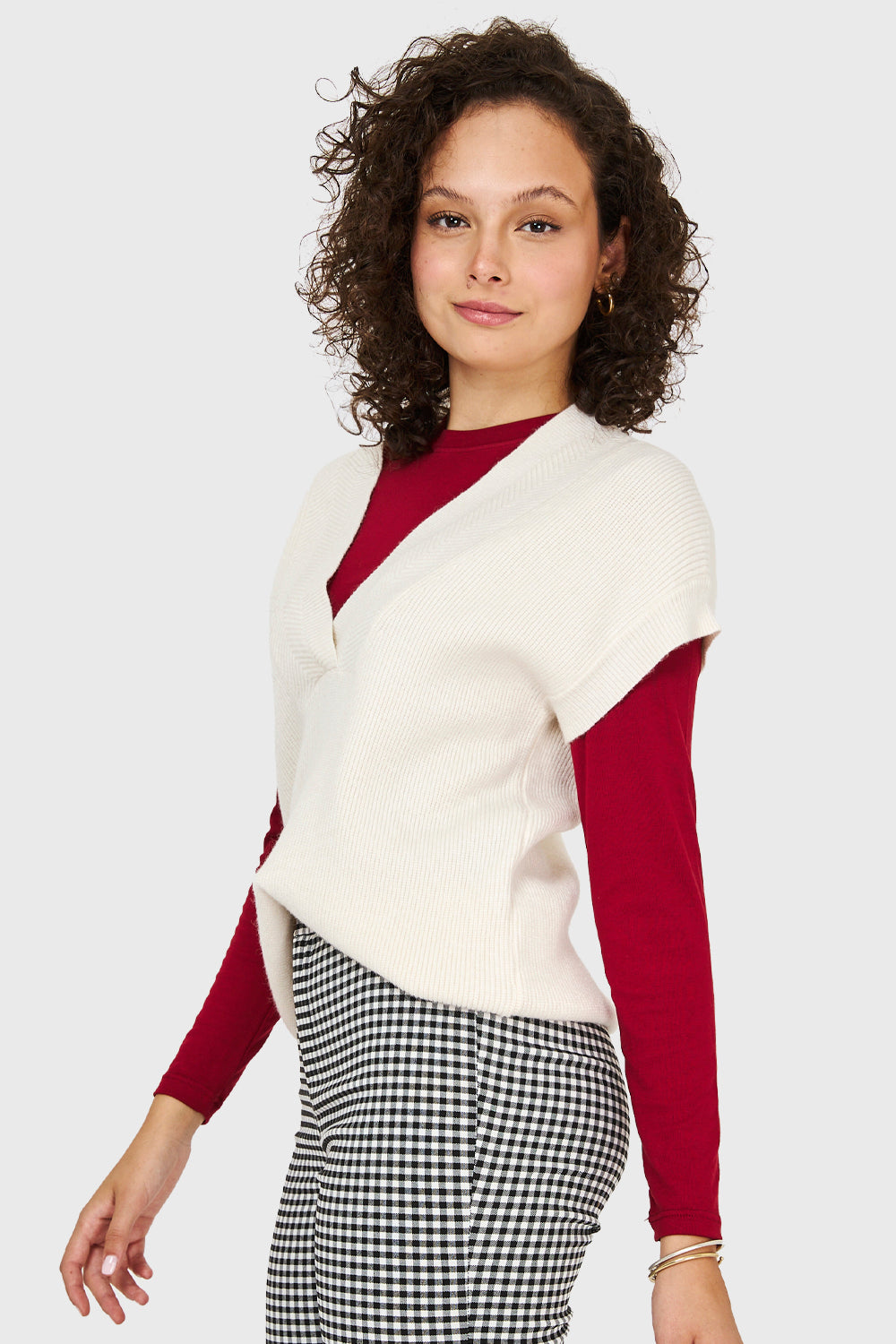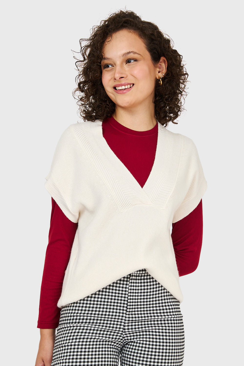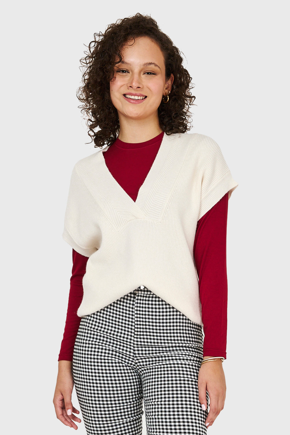 Características: Sweater manga corta. Escote en V profundo. Pretina en cuello, puños y basta. Tejido acanalado.