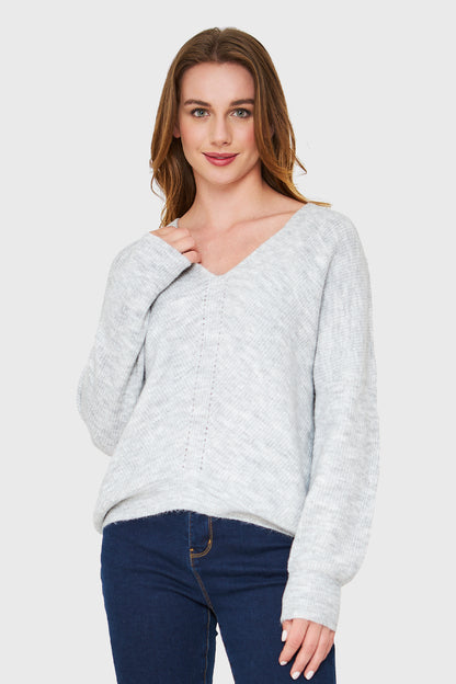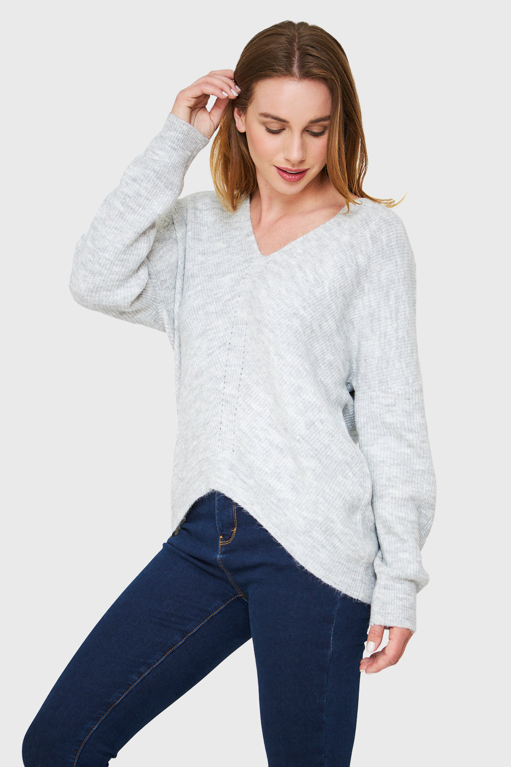 Características: Sweater manga larga holgado. Escote en V. Pretina en basta y puños. Basta delantera redonda y más corta que basta de espalda.