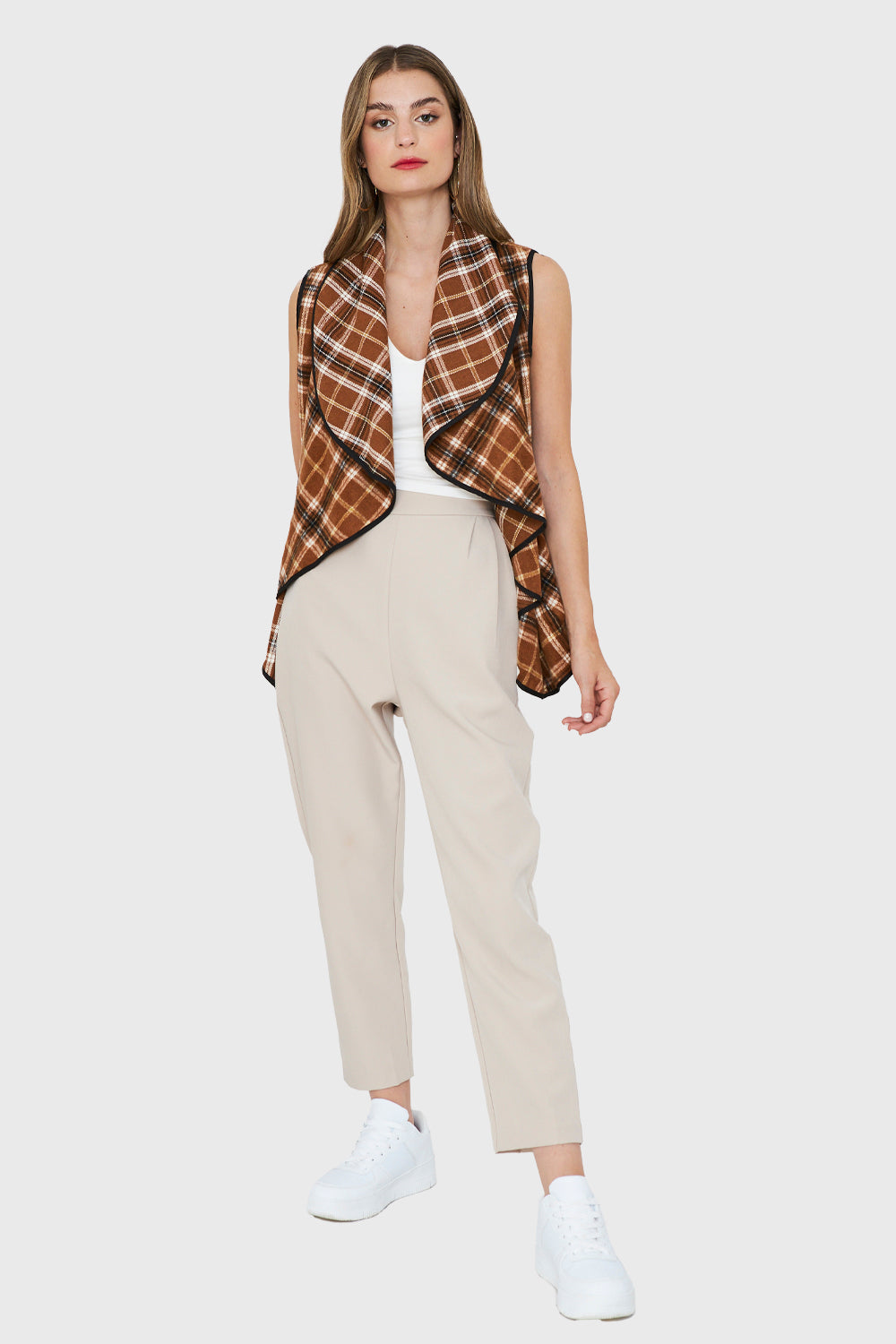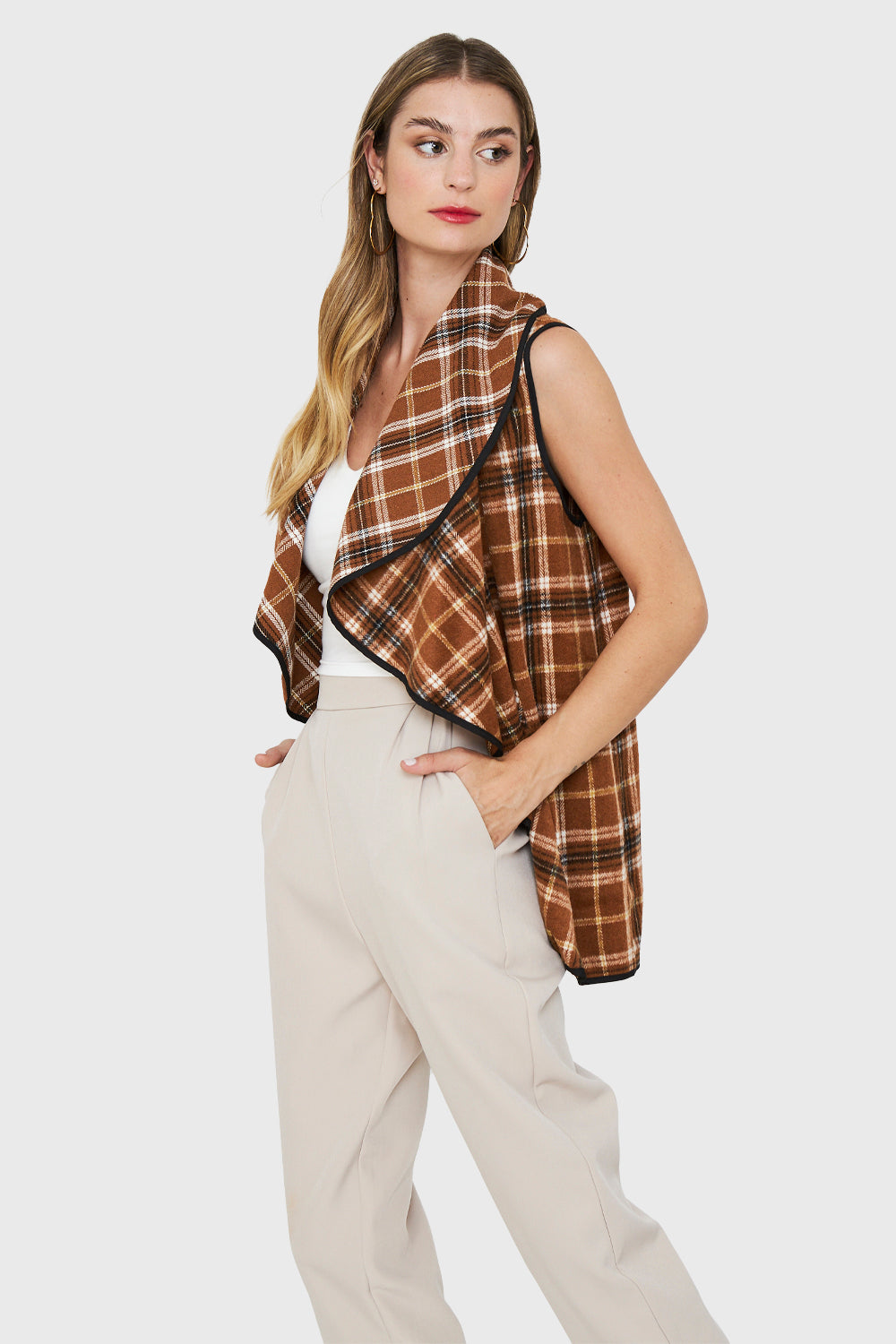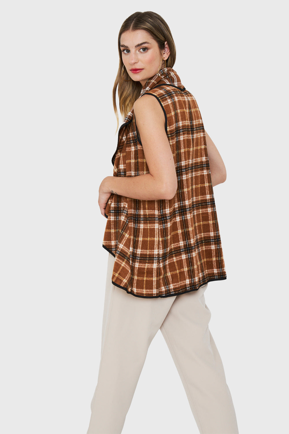 Características: Tapado si mangas con estampado escoces. Escote en V con caída en vuelos. Posee bolsillos.