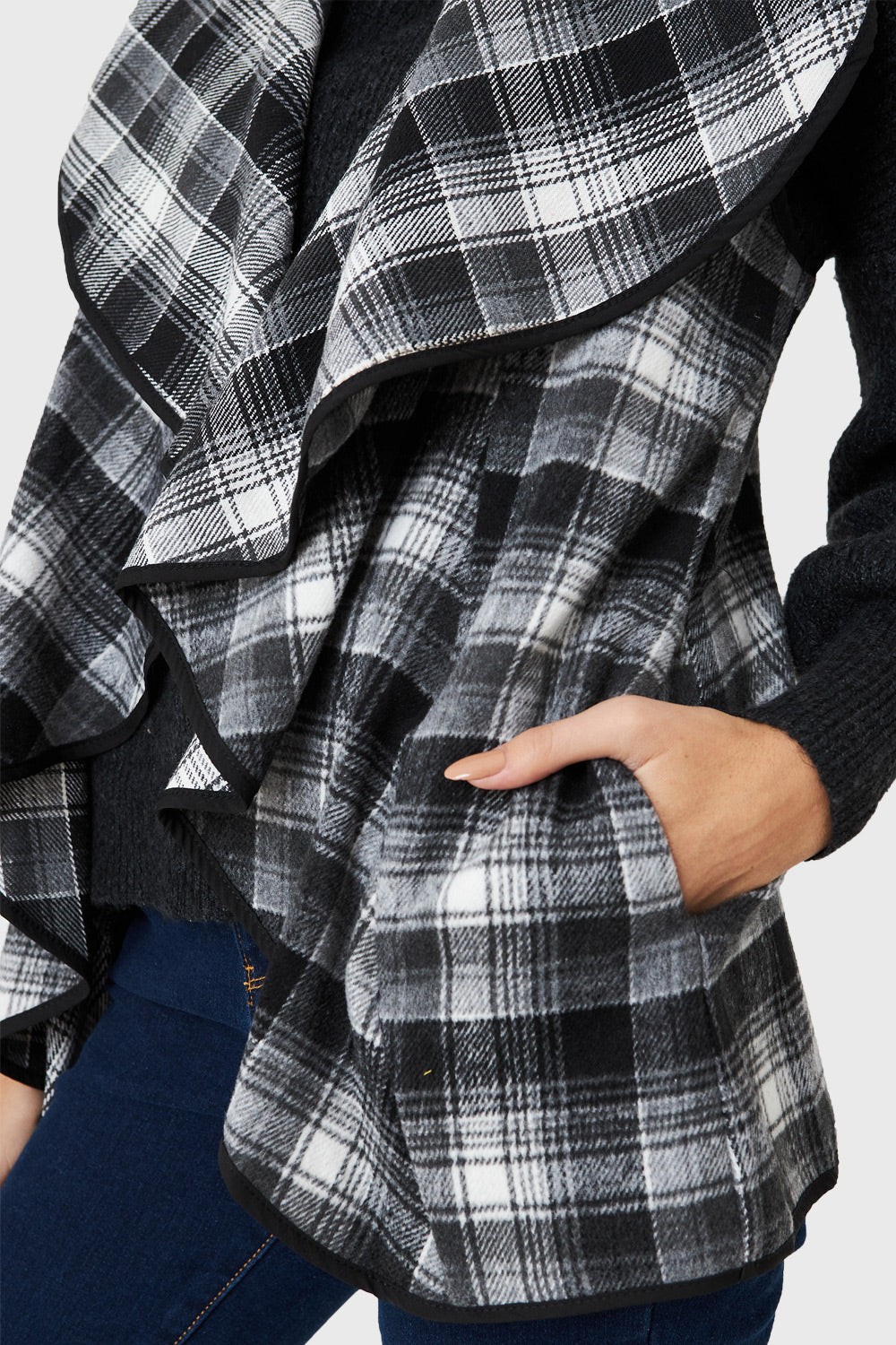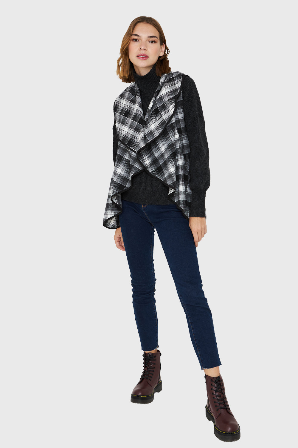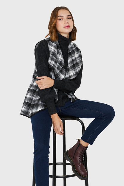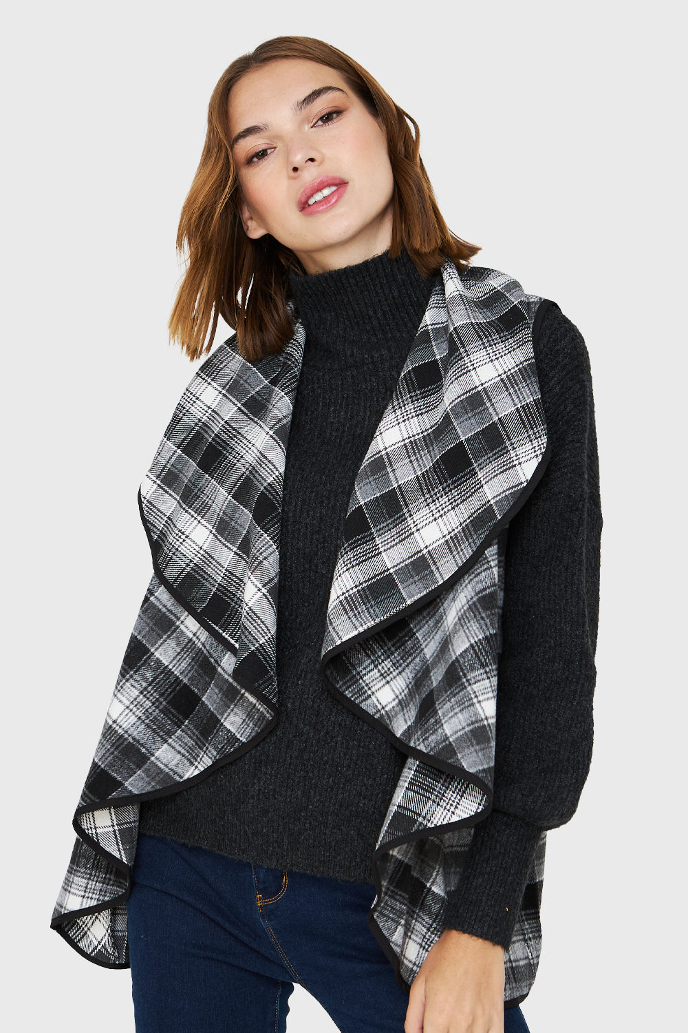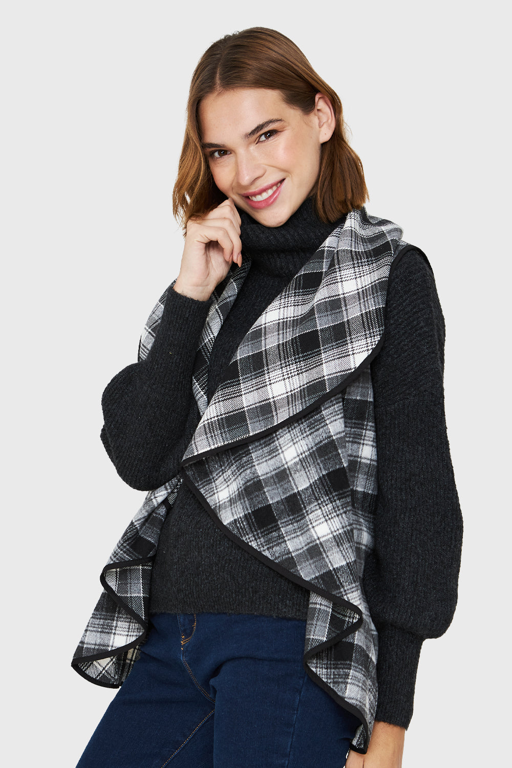 Características: Tapado si mangas con estampado escoces. Escote en V con caída en vuelos. Posee bolsillos.