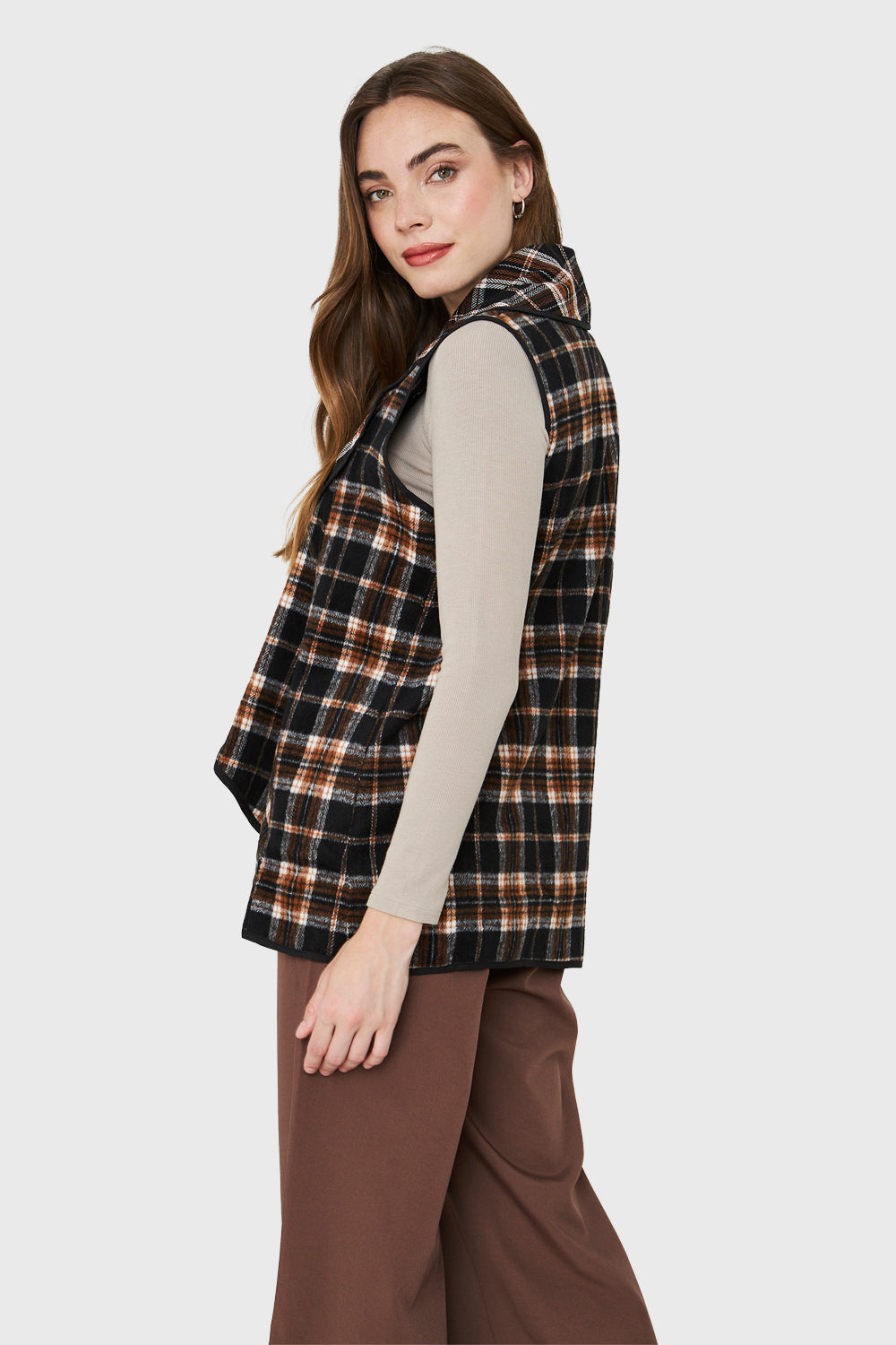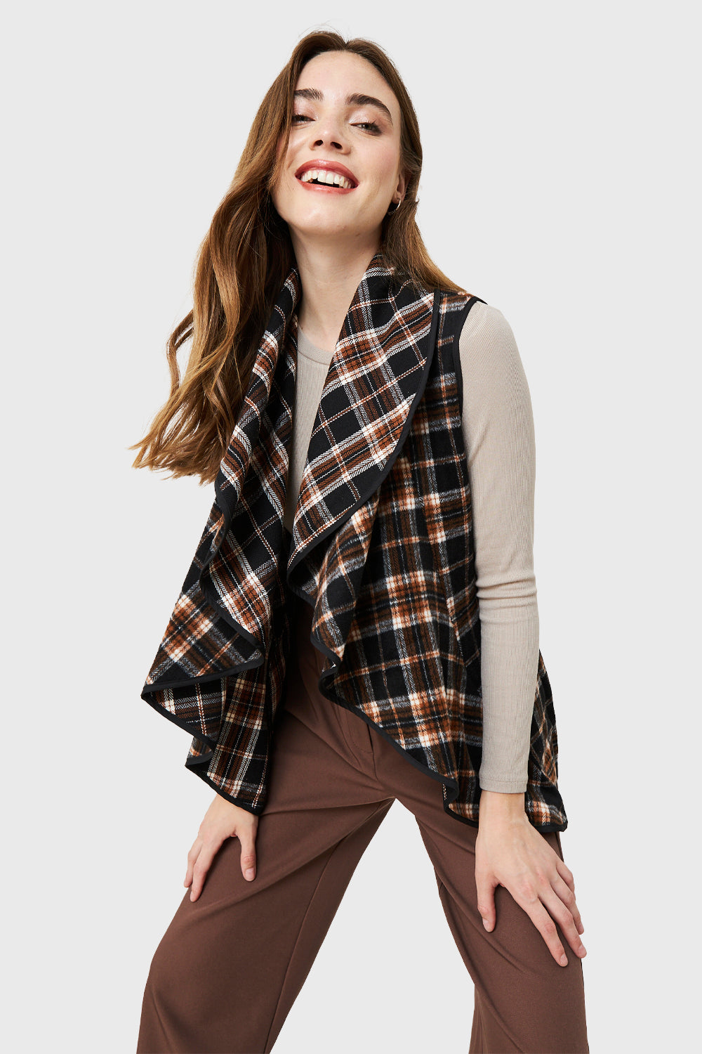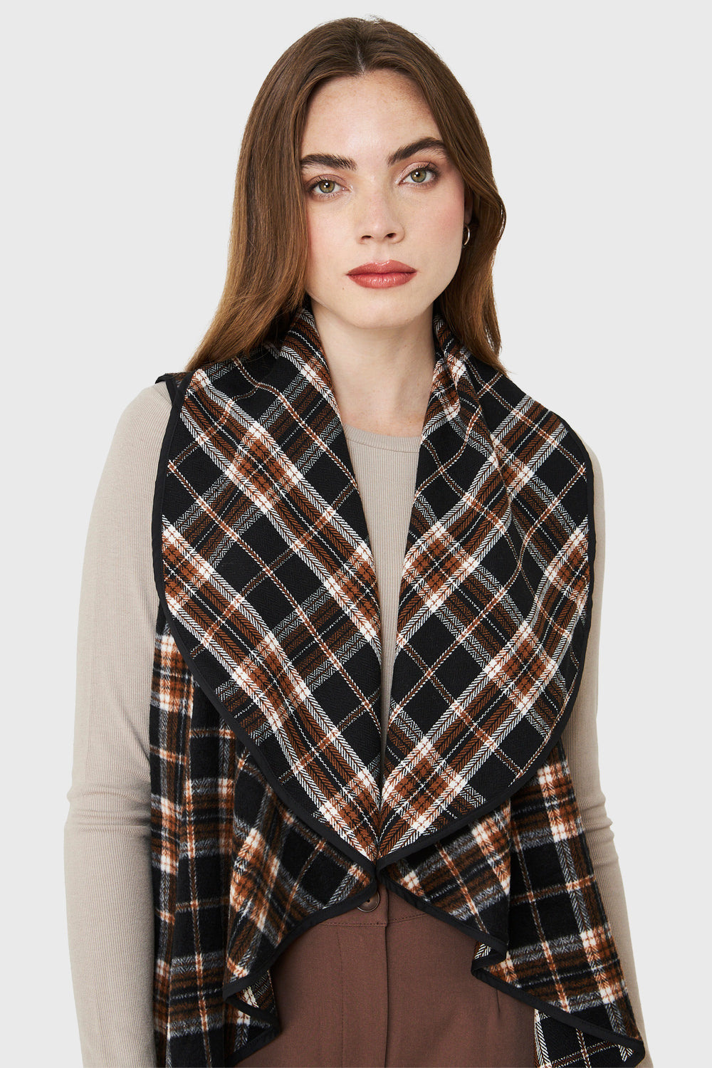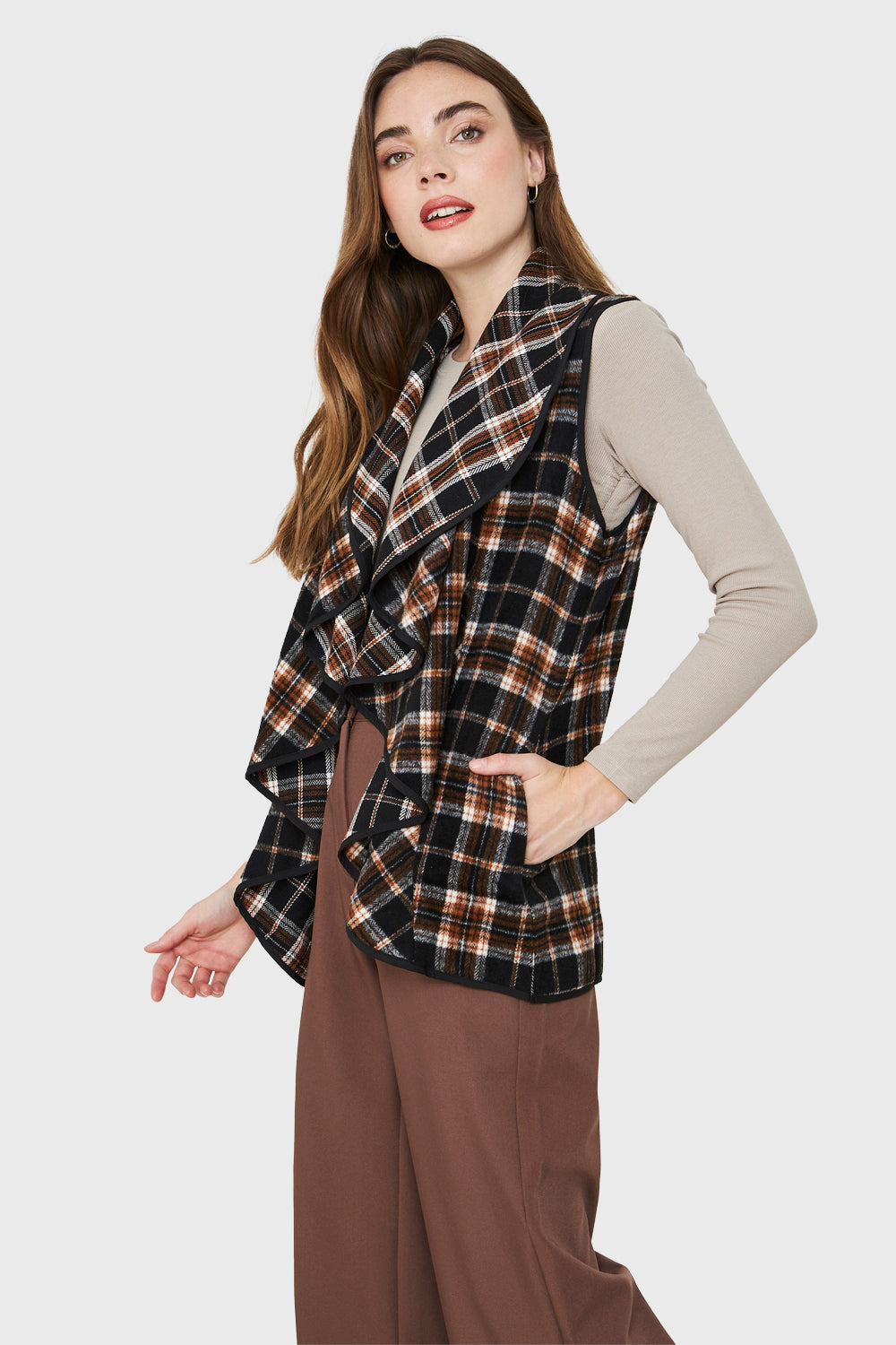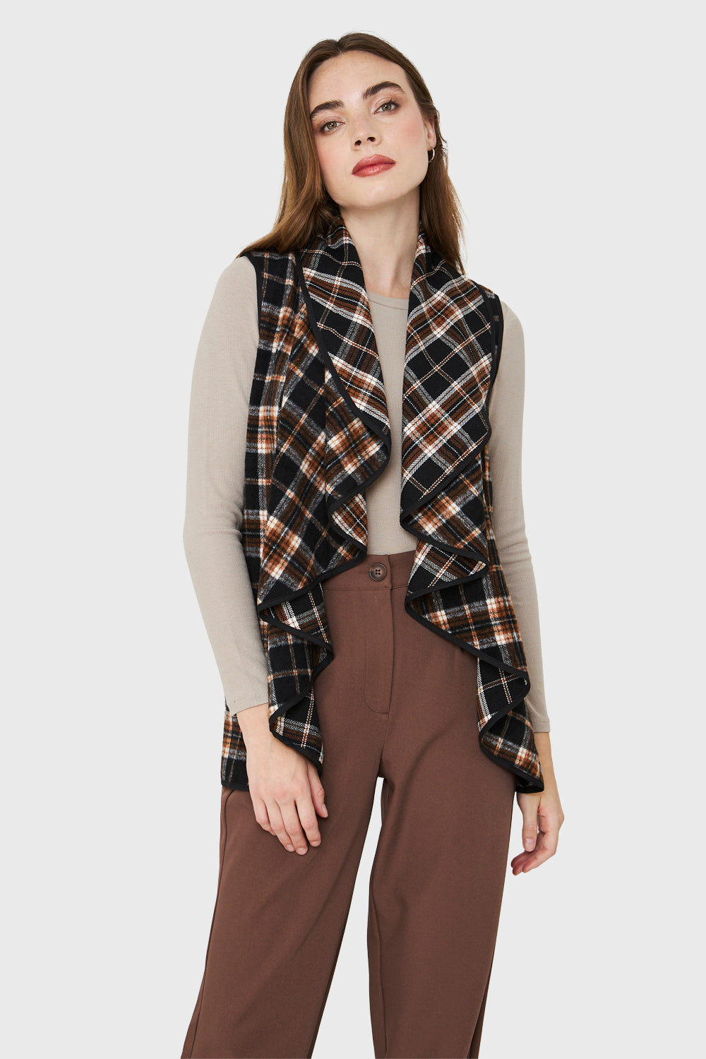 Características: Tapado si mangas con estampado escoces. Escote en V con caída en vuelos. Posee bolsillos.