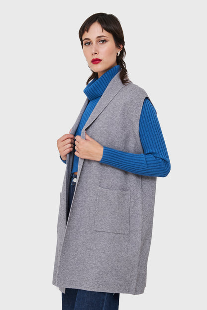 Características: Tapado tipo tejido sin mangas con bolsillos laterales funcionales y solapa larga.