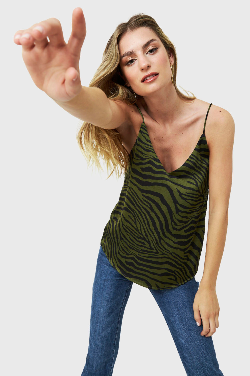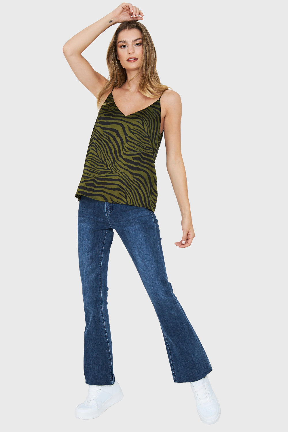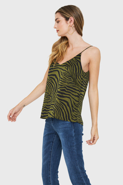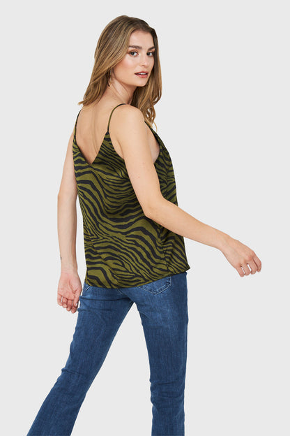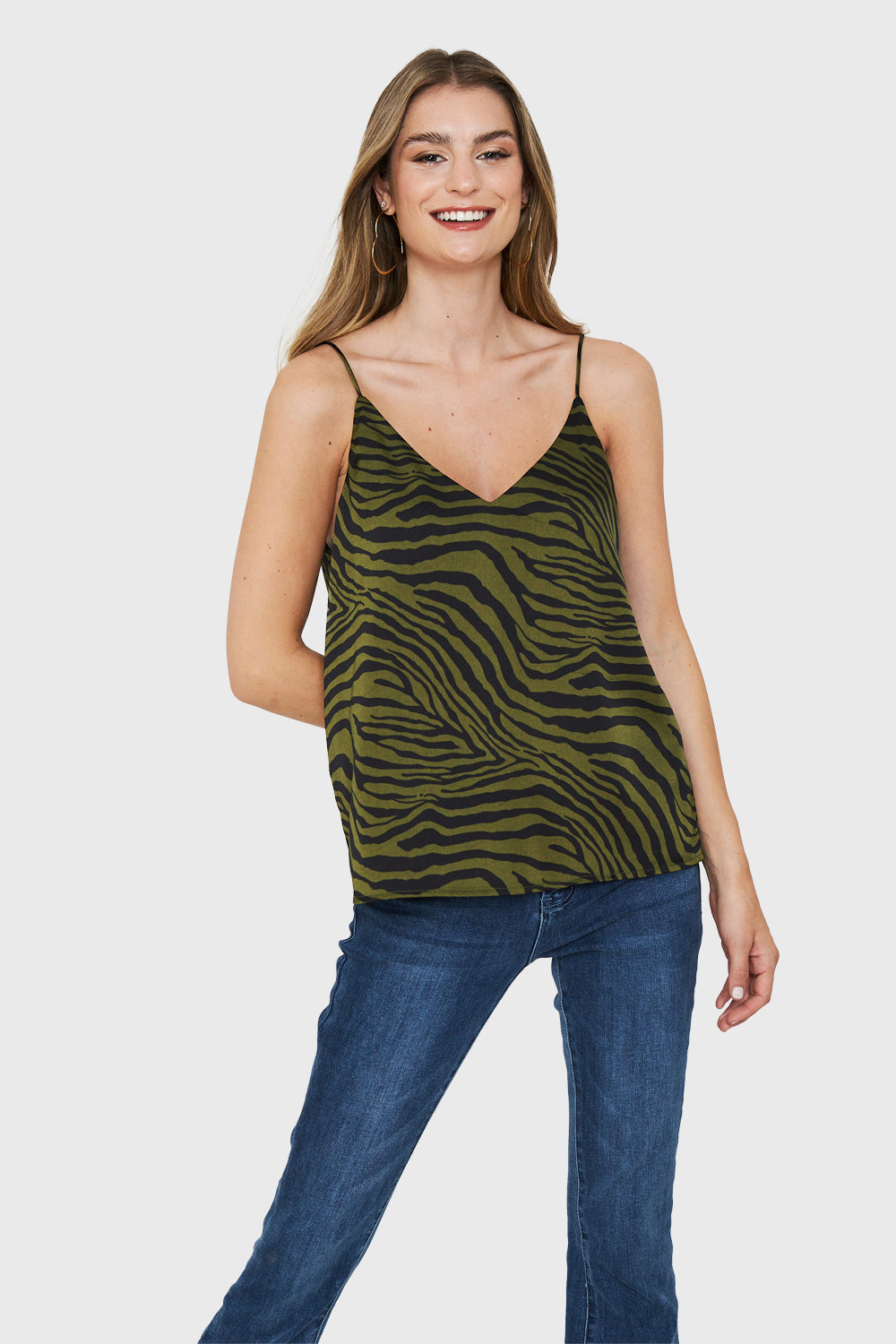 Características: Top básico tipo satín, estampado de cebra. Escote en V. Posee forro en el busto.
