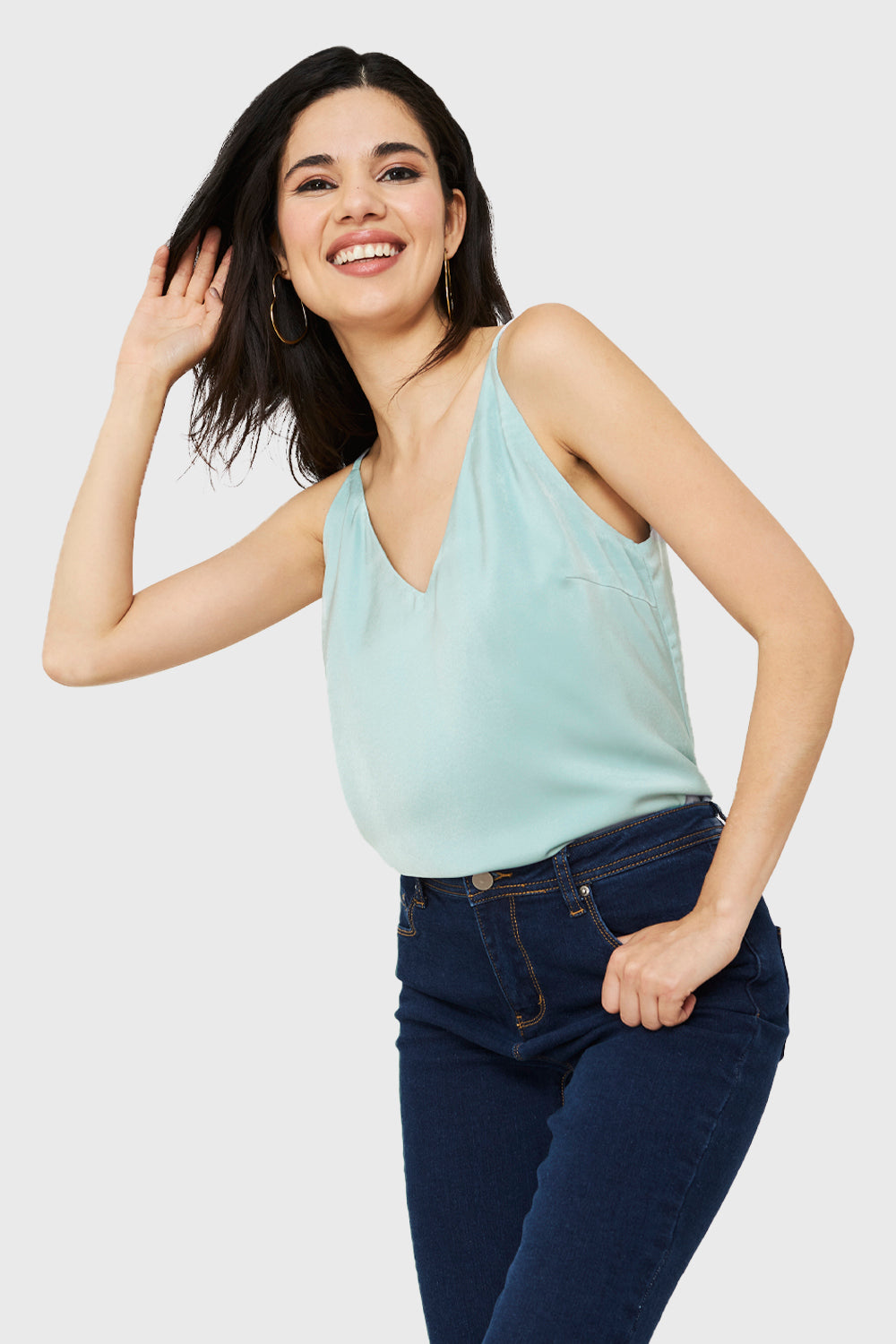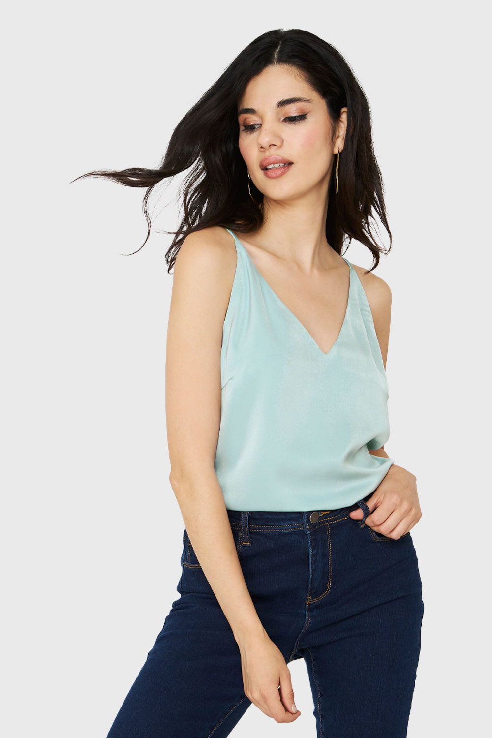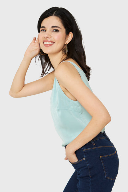 Características: Top básico tipo satín. Escote en V.