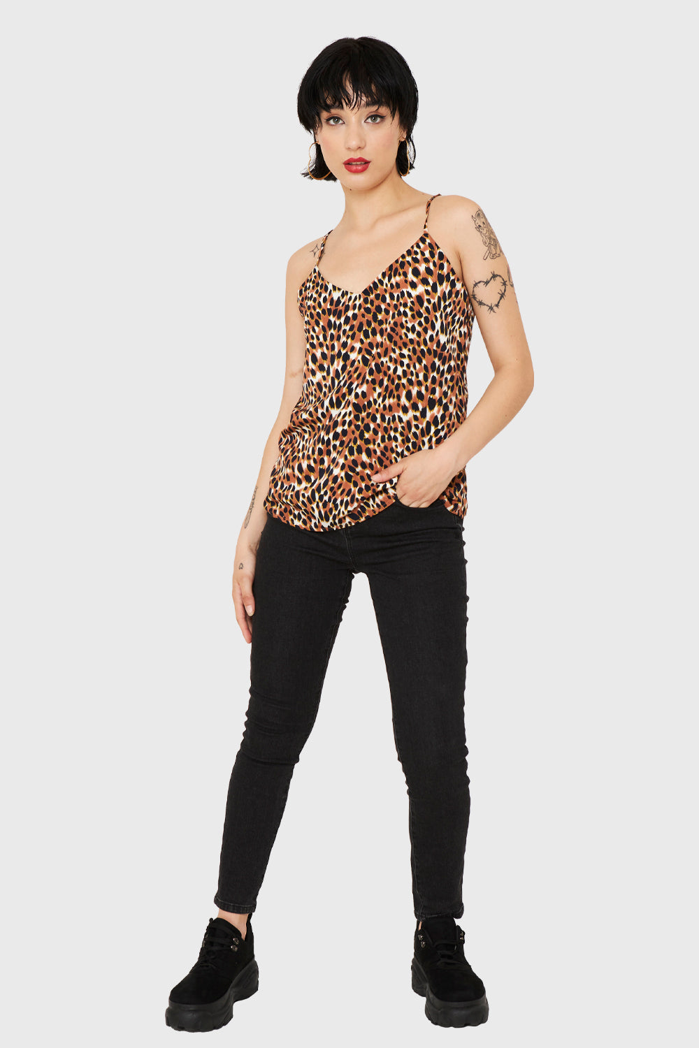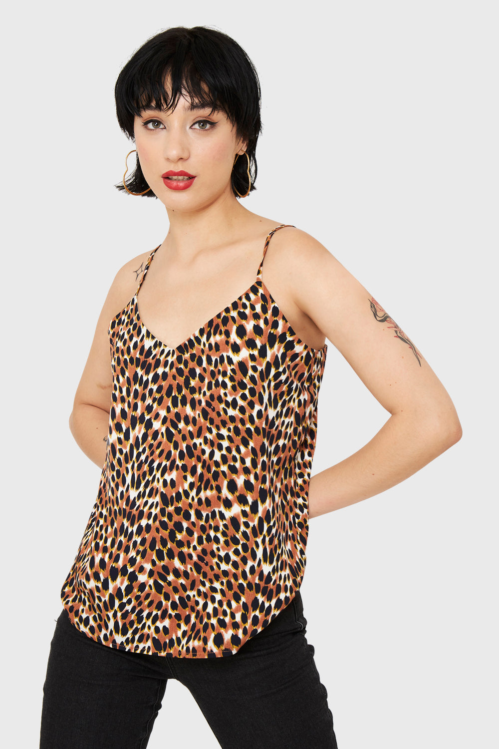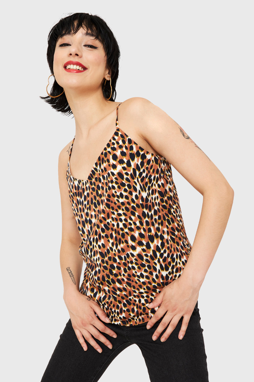 Características: Top estampado leopardo escote V, con abilo ajustable y forro.