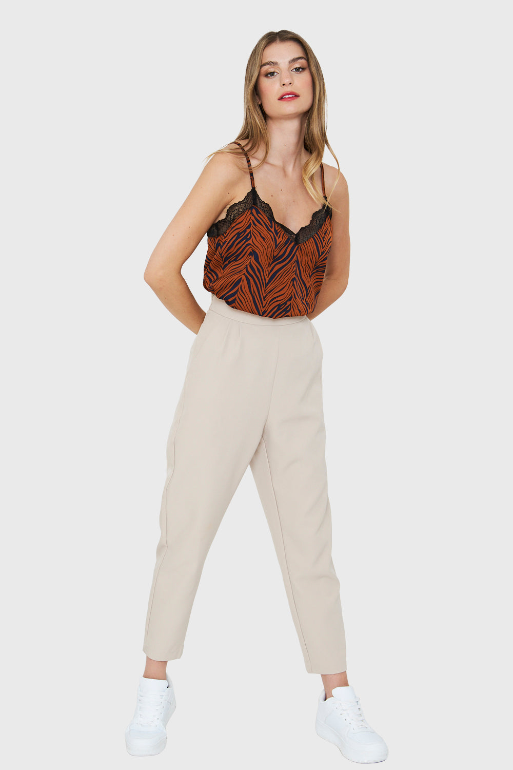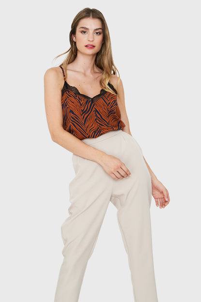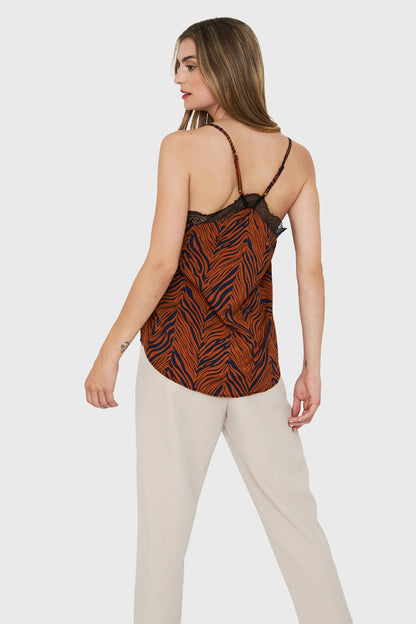 Características: Top corte recto con pabilos ajustables. Print de cebra. Detalle de encaje en la parte del escote.