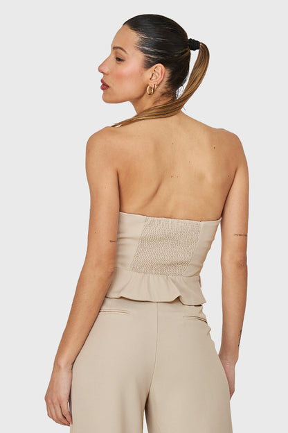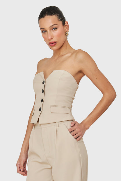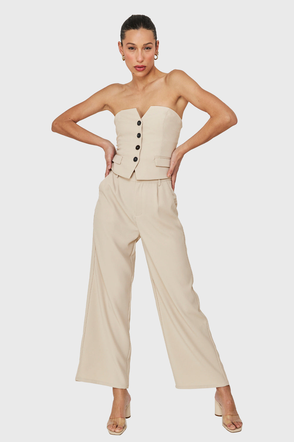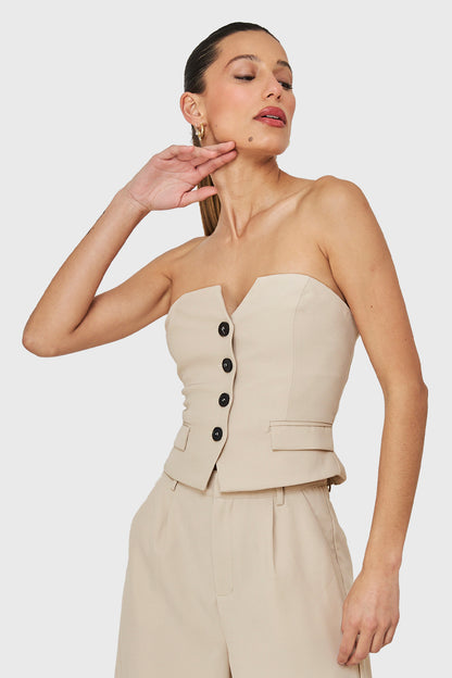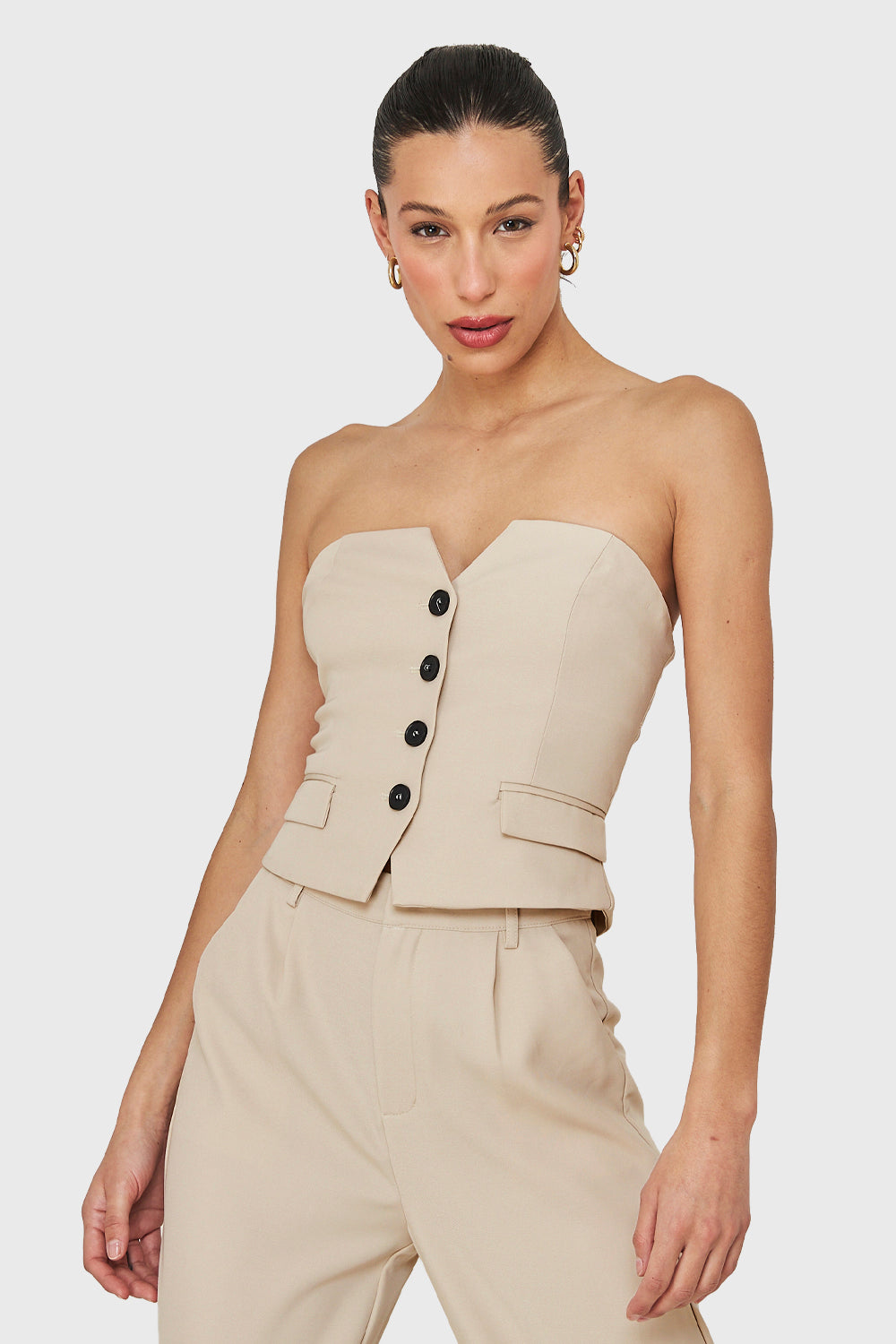 Características: Top Strapless con botones funcionales y bolsillos decorativos tipo sastre en el delantero. Espalda elasticada. Hace match con el pantalón N04120.
