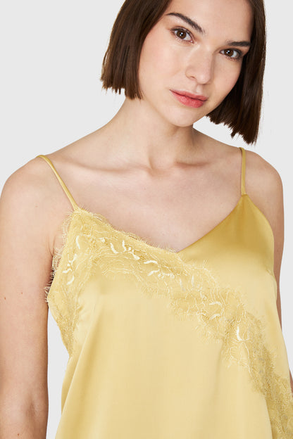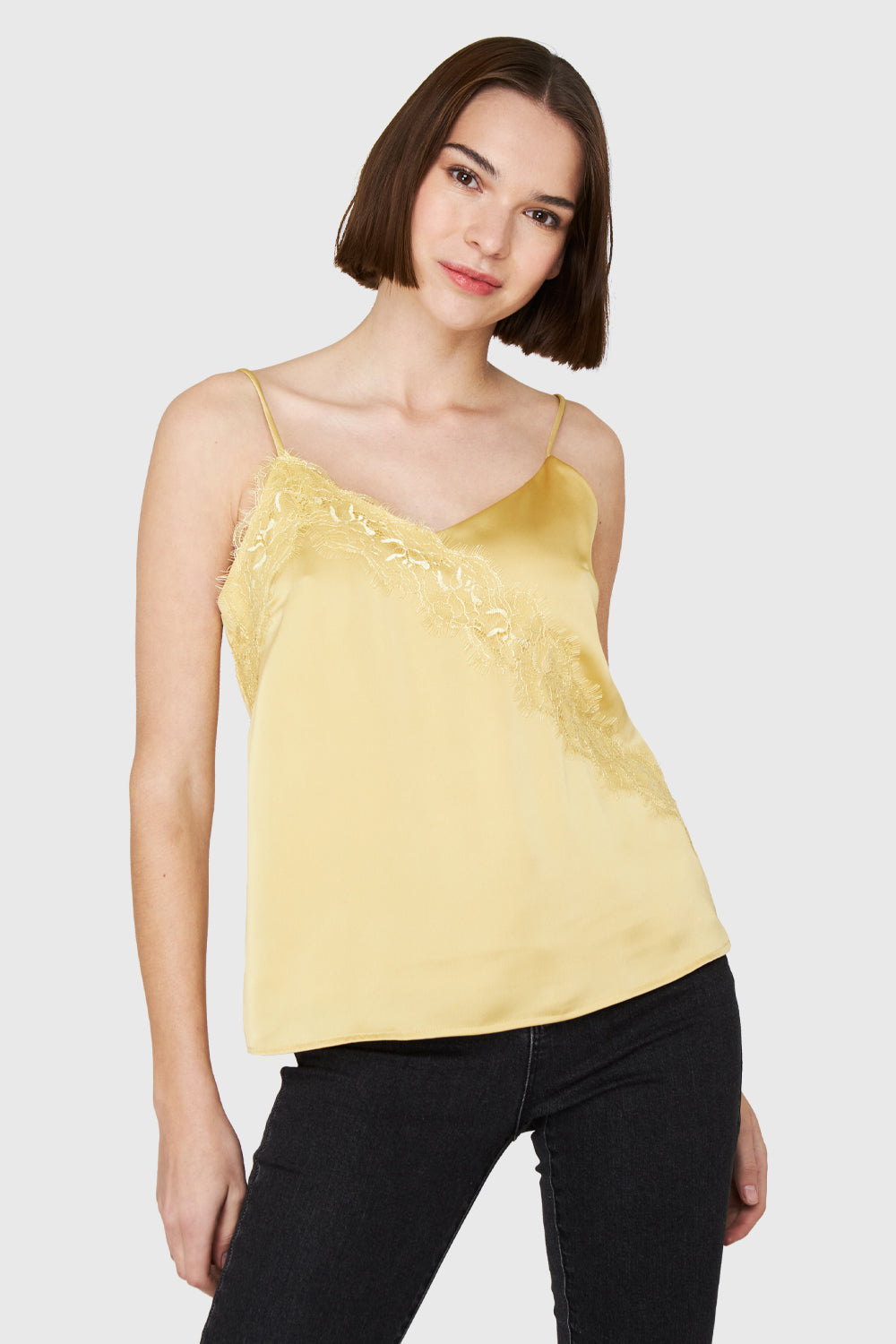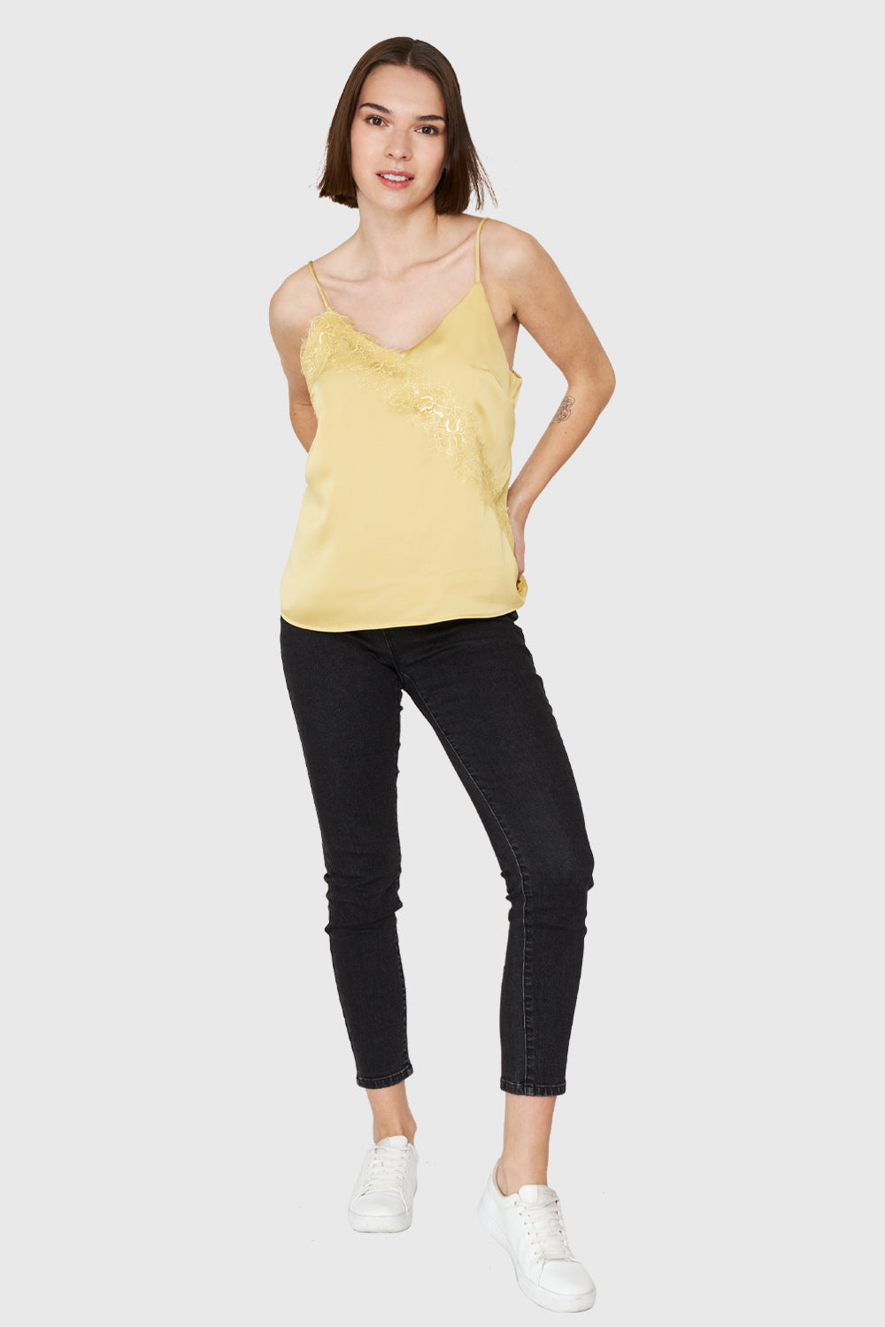 Características: Top básico tela tipo satín. Encaje en un lado del busto llegando hacia el lado contrario formando un efecto cruzado. Tirantes tipo pabilo ajustables. Escote en V. Posee forro.