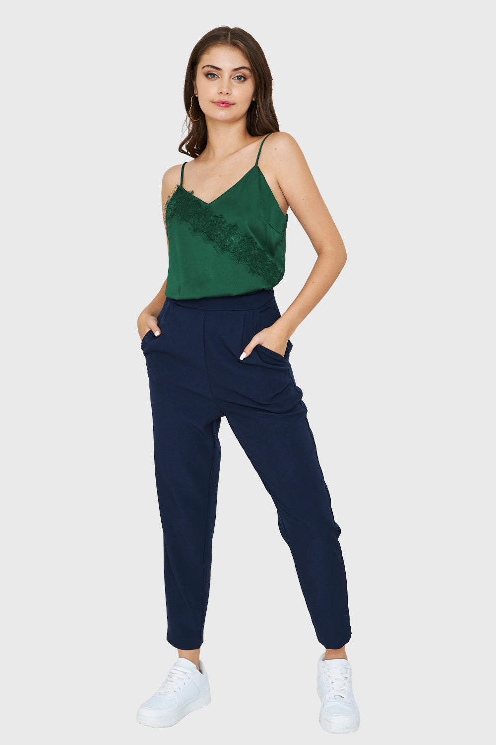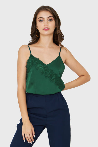 Características: Top básico tela tipo satín. Encaje en un lado del busto llegando hacia el lado contrario formando un efecto cruzado. Tirantes tipo pabilo ajustables. Escote en V. Posee forro.