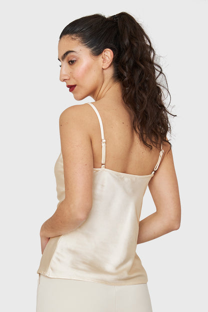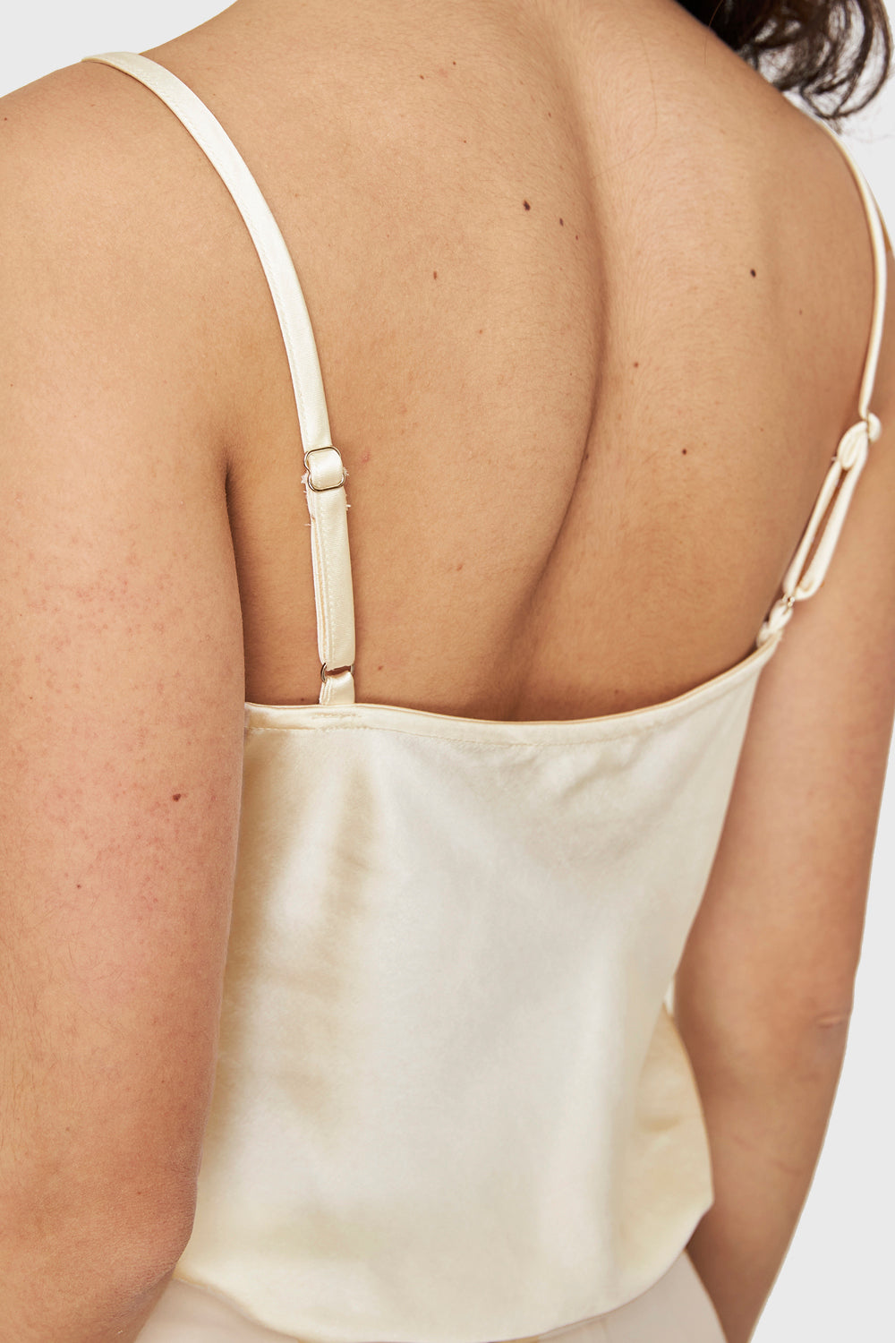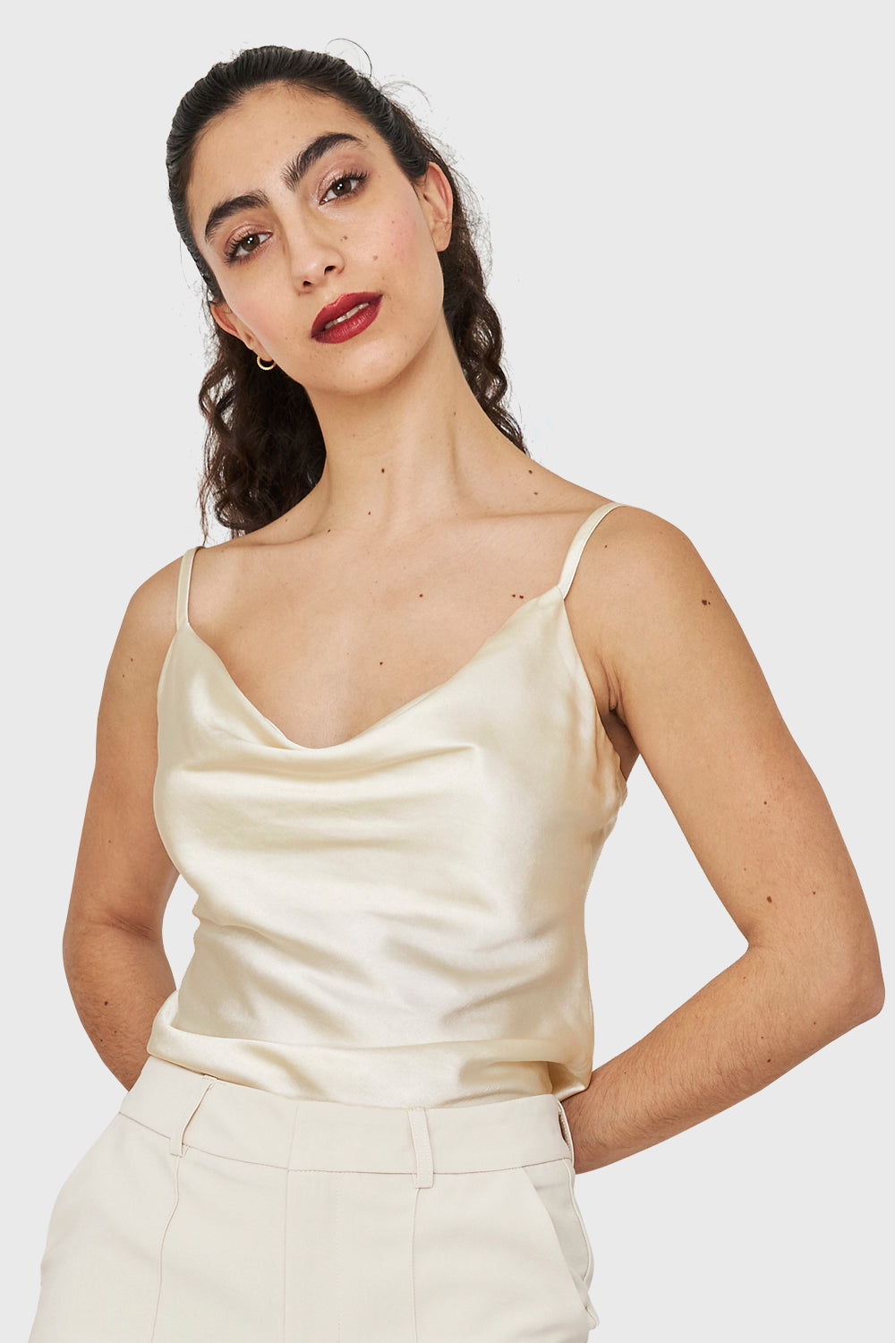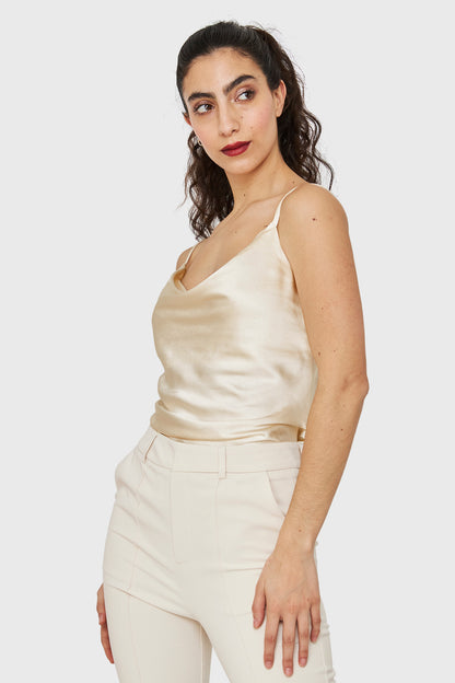 Características: Top tipo satín escote drapeado con pabilo ajustable. Ceñido en la cintura.