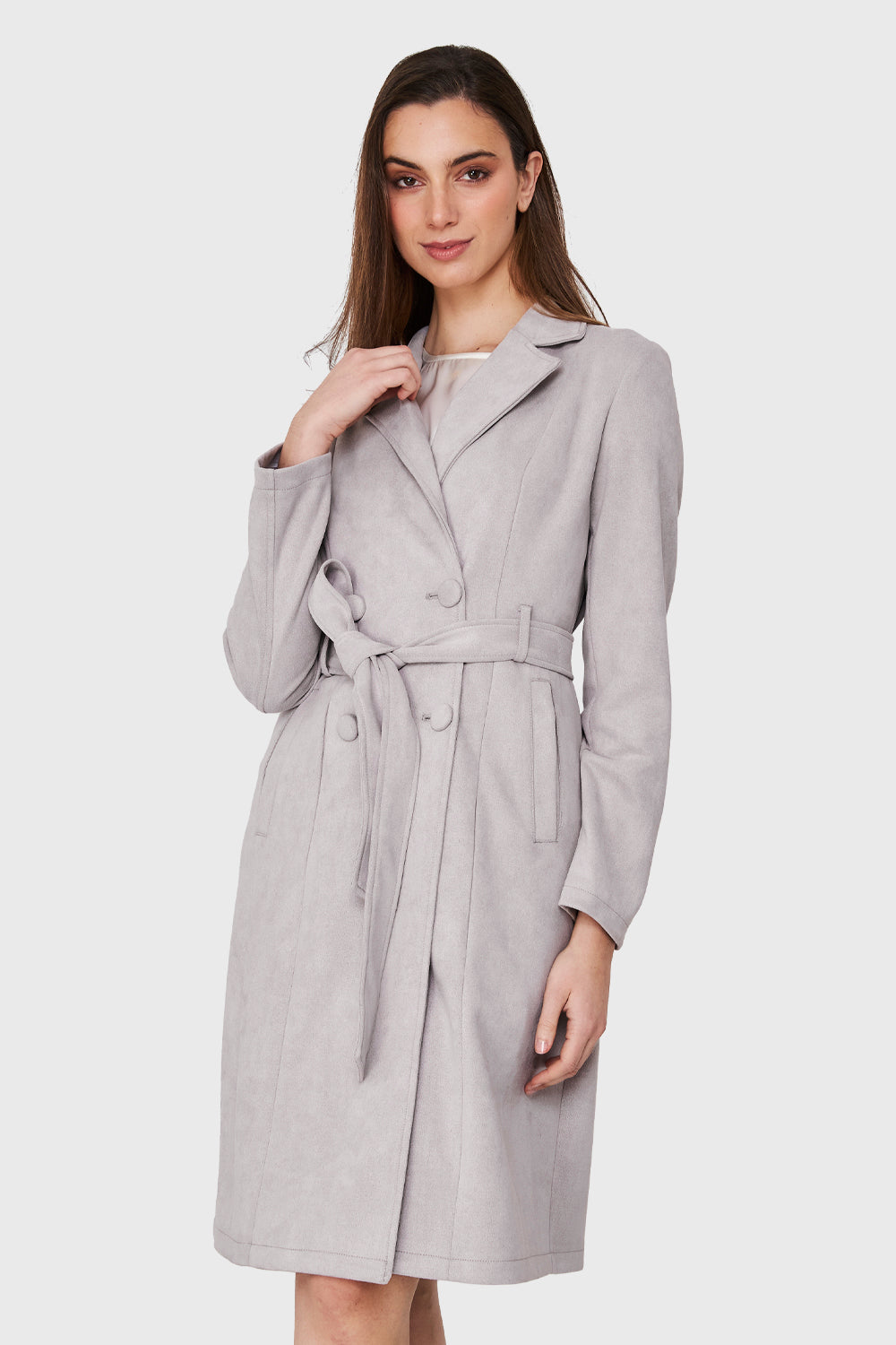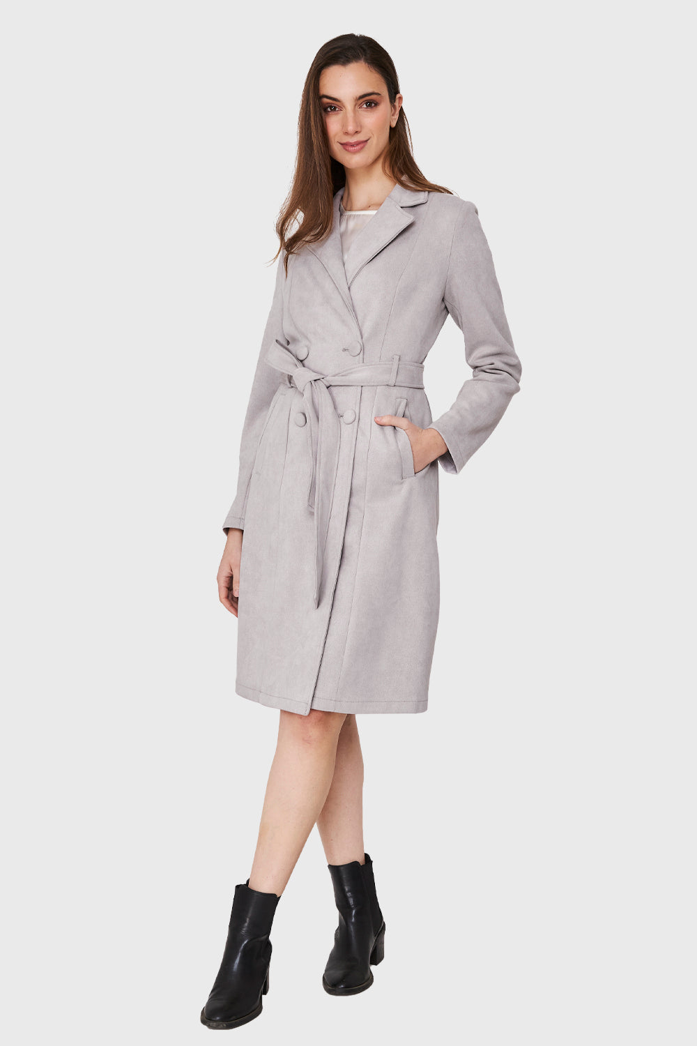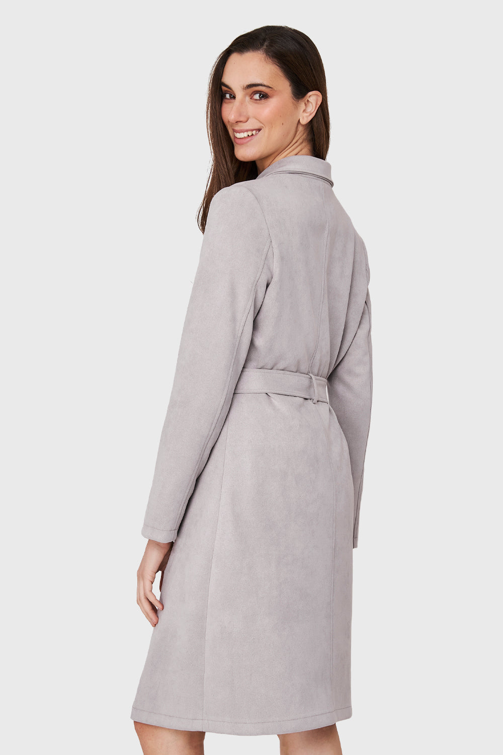 Características: Trench tipo gamuza con lazo para regular. Bolsillos funcionales, botón interno de ajuste y botones externos para cerrar. Sin forro.