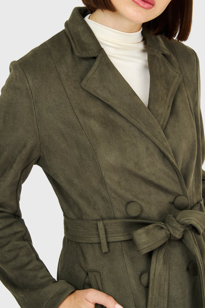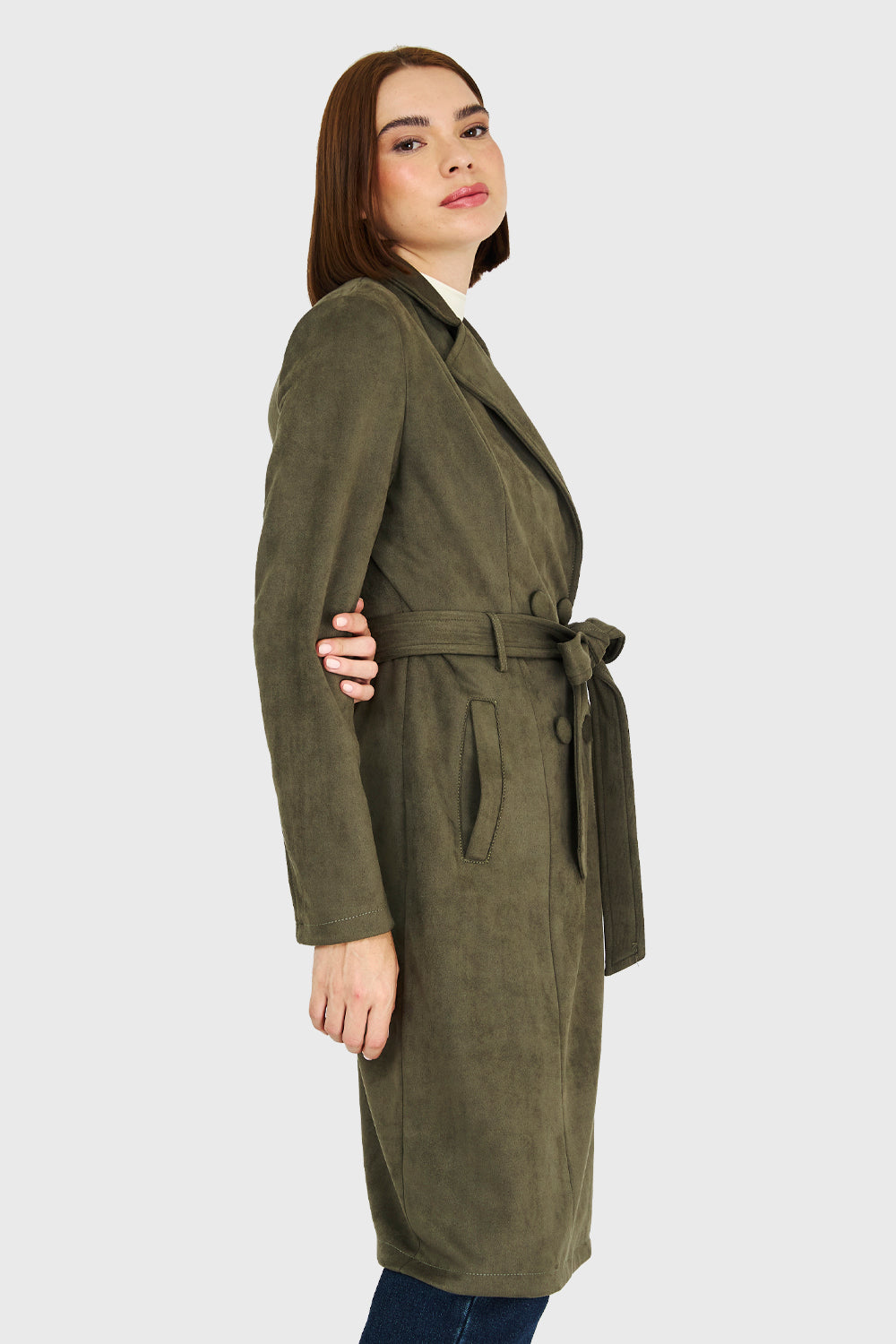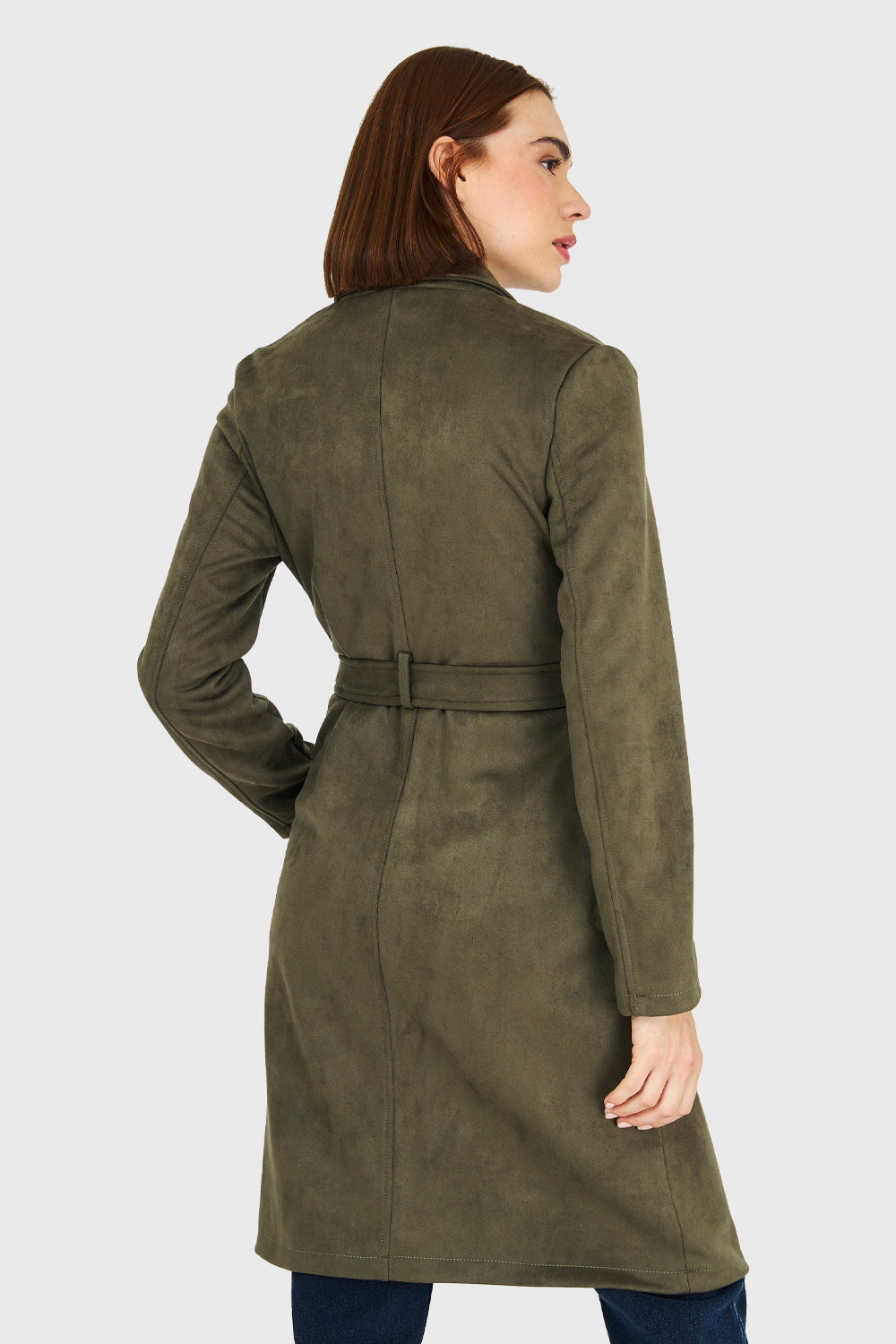 Características: Trench tipo gamuza con lazo para regular. Bolsillos funcionales, botón interno de ajuste y botones externos para cerrar. Sin forro.