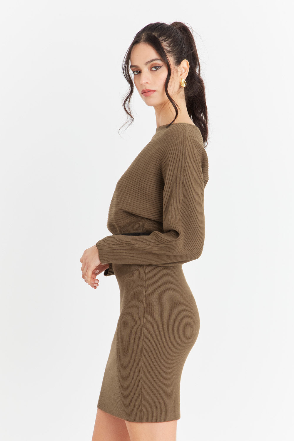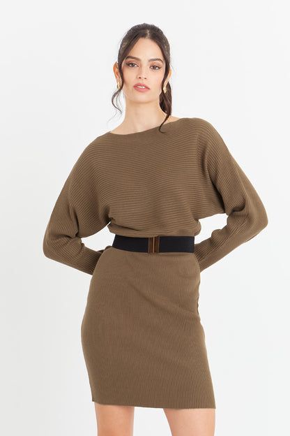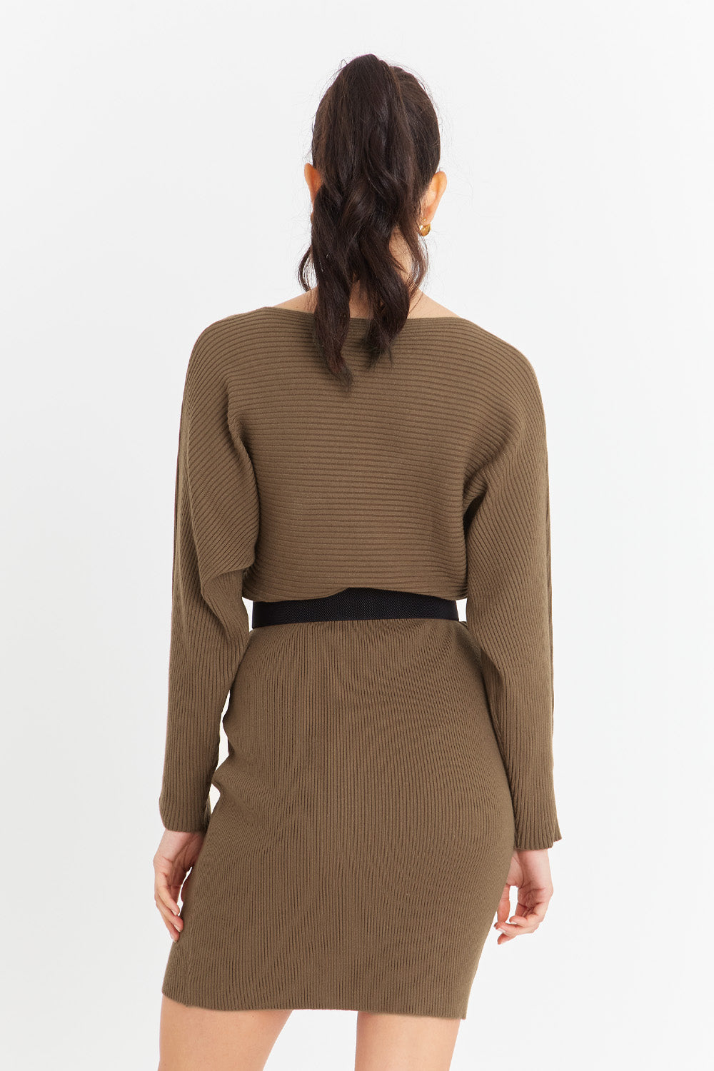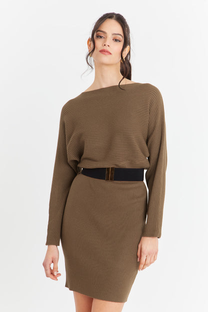 Características: Vestido midi ajustado y elasticado. Mangas Largas. Tejido acanalado. Cuello redondo y detalle de cinturón del color del vestido.