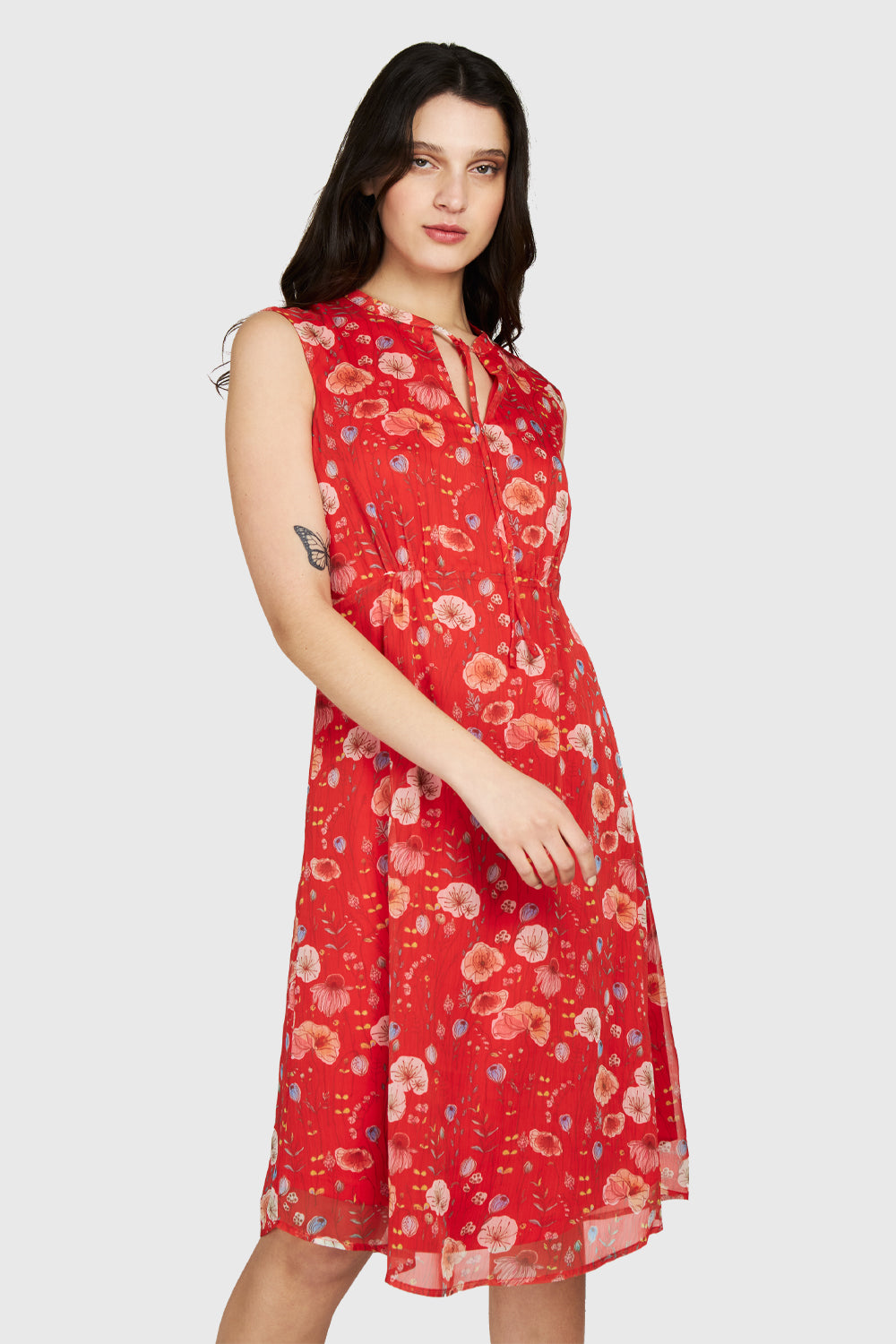 Características: Vestido midi sin manga estampado floral amapolas. Cuello mao con lazo de ajuste. Cierre invisible al costado. Posee forro.