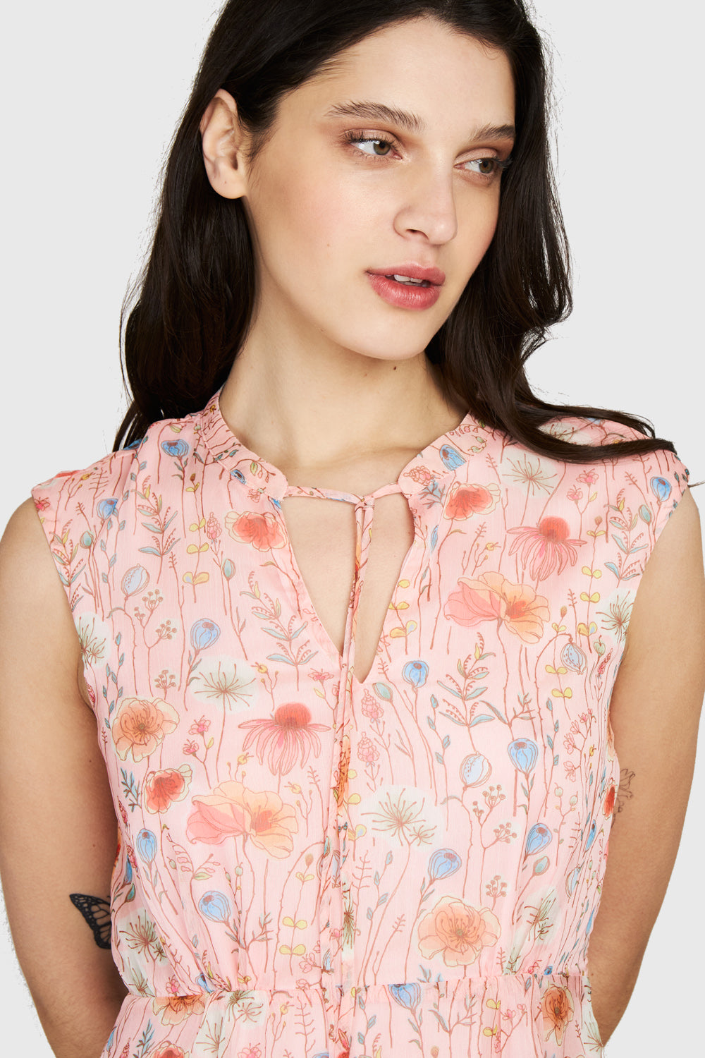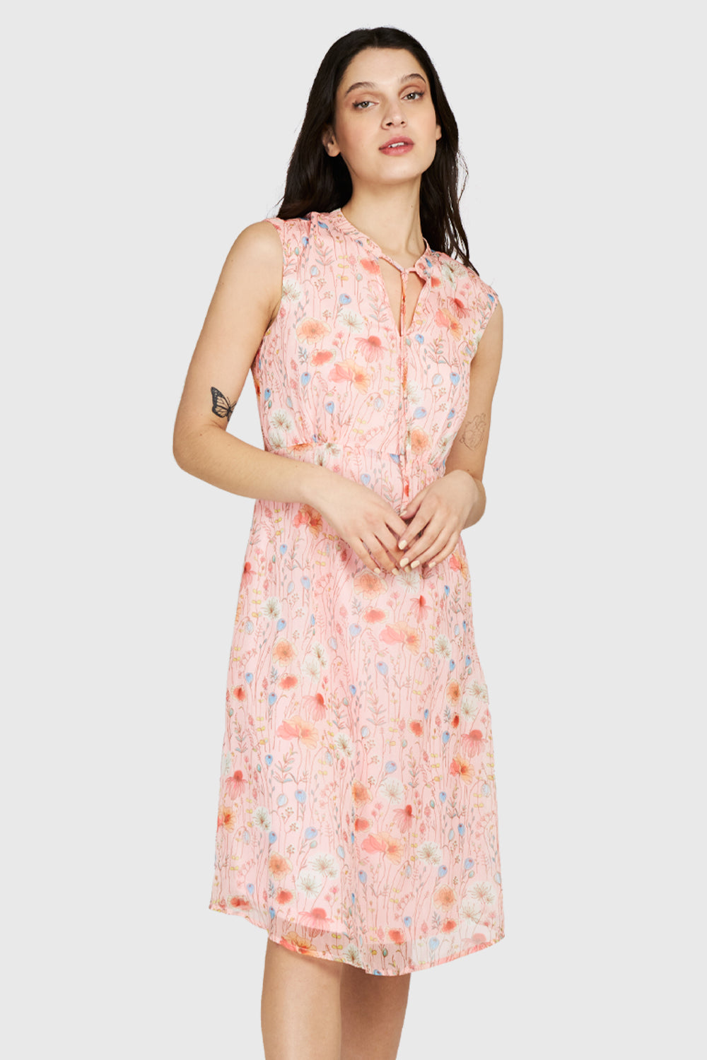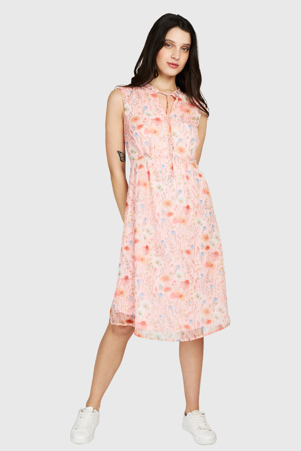 Características: Vestido midi sin manga estampado floral amapolas. Cuello mao con lazo de ajuste. Cierre invisible al costado. Posee forro.
