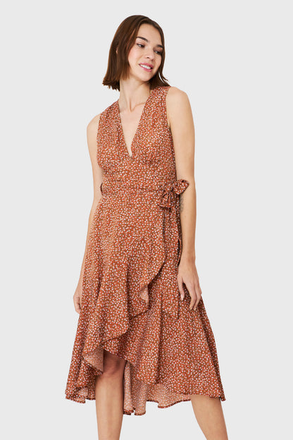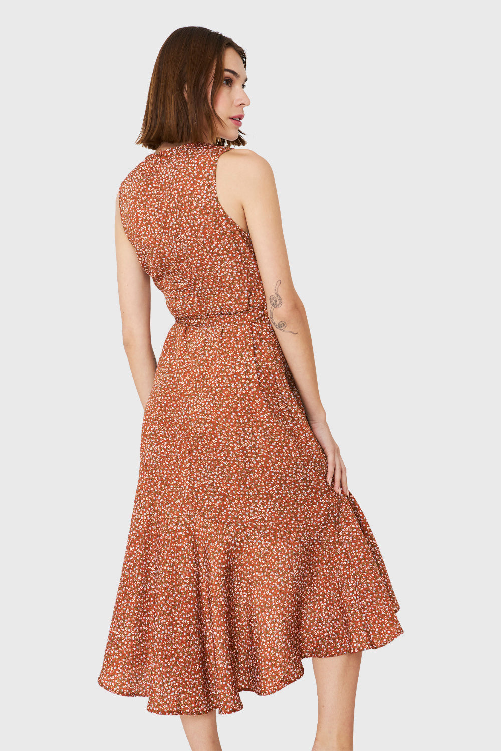 Características: Vestido asimétrico estampado ditsy floral, con cuello V y cinta ajustable para la cintura. Posee cierre en espalda y efecto vaporoso en la parte baja del vestido.