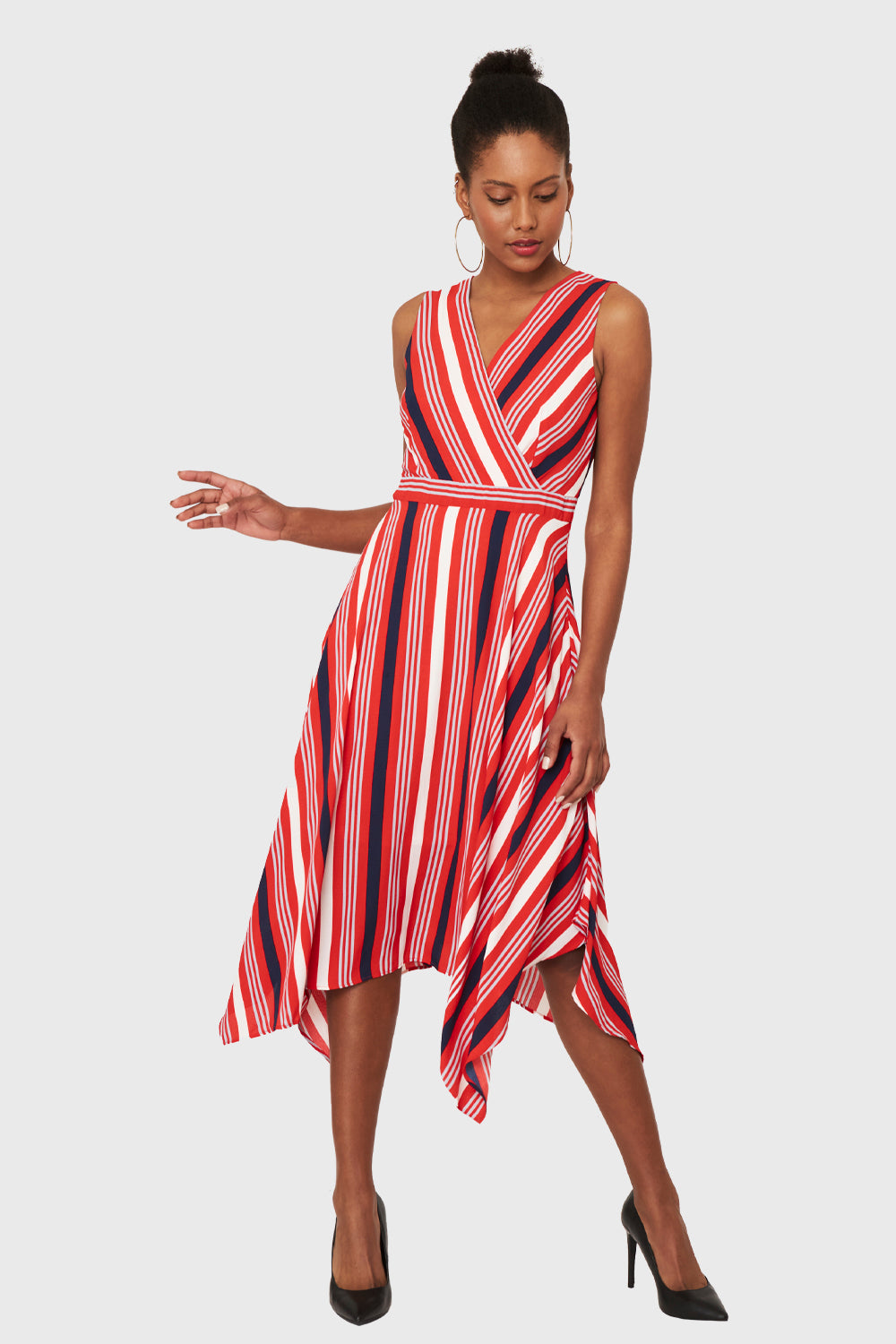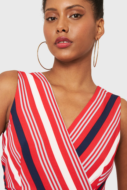 Características: estido midi con largo asimétrico. Print de rayas. Sin mangas y escote cruzado. Cierre invisible en espalda y dos broches de ajuste en la parte del cuello. Posee forro.