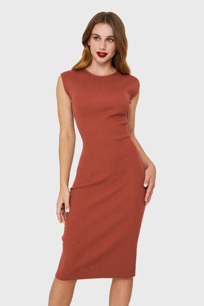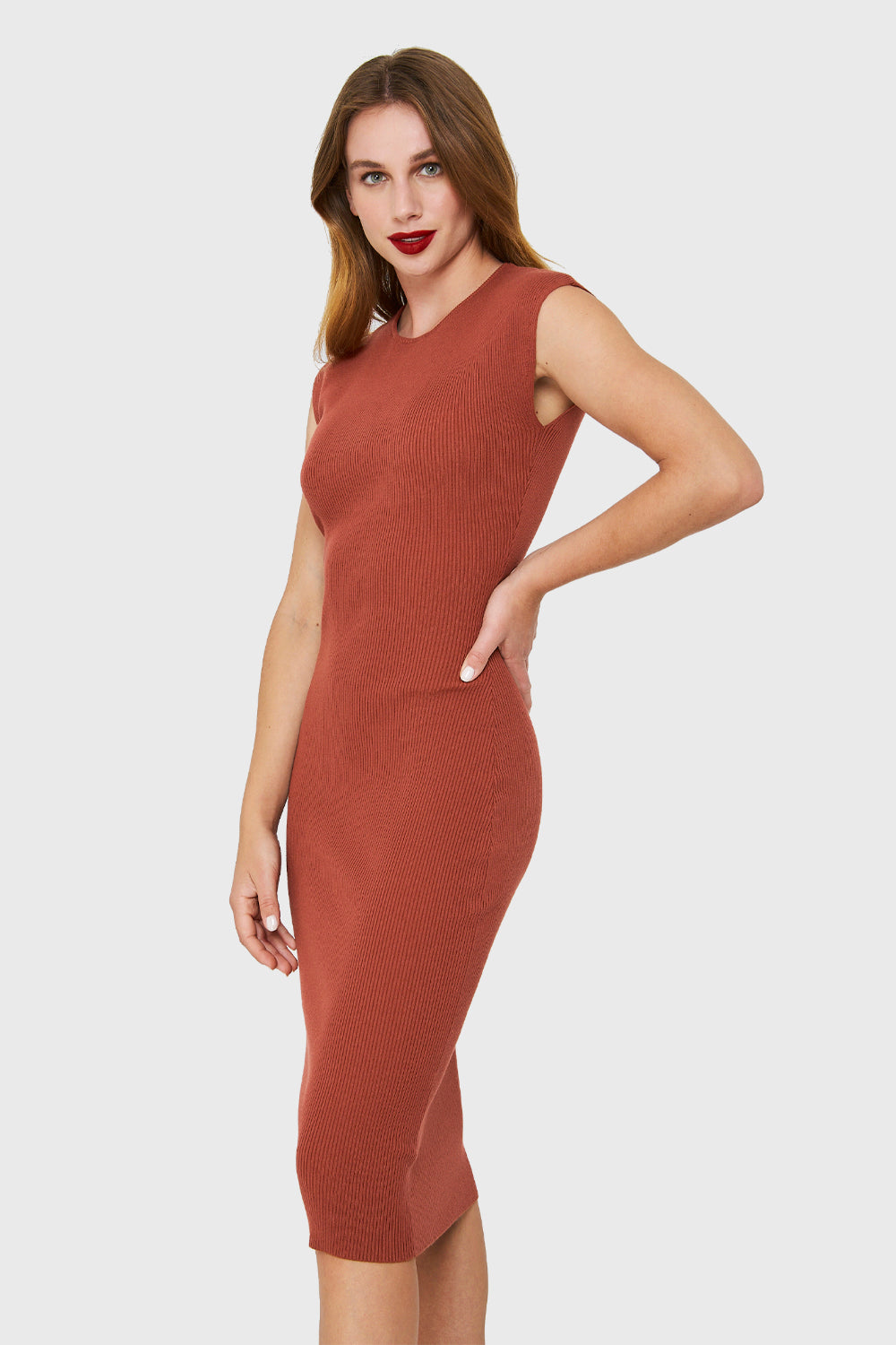 Características: Vestido midi ajustado y elasticado. Sin mangas. Tejido acanalado. Cuello redondo, no posee forro.