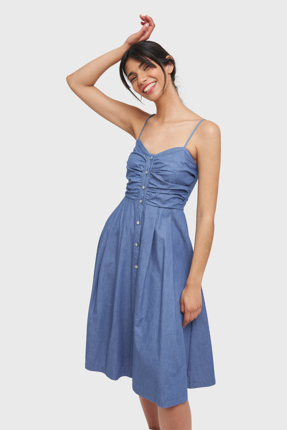 Características: Vestido midi escote corazón tipo denim con botones metalizados delanteros de ajuste. Busto con drapeado. Tirante pabilo ajustables y elastico en espalda.