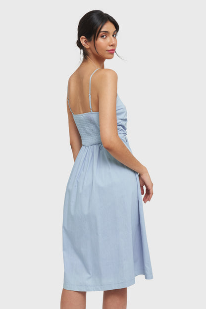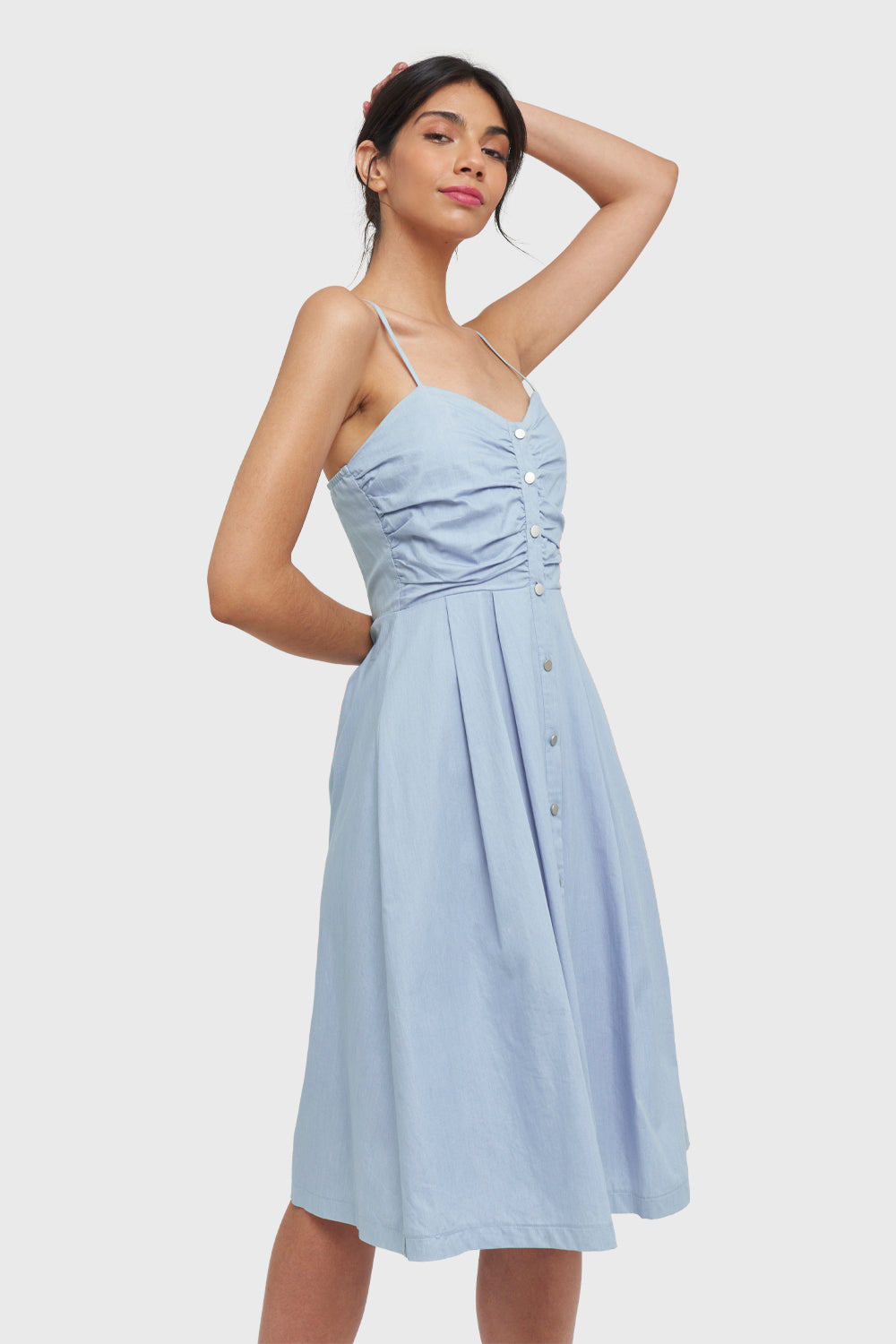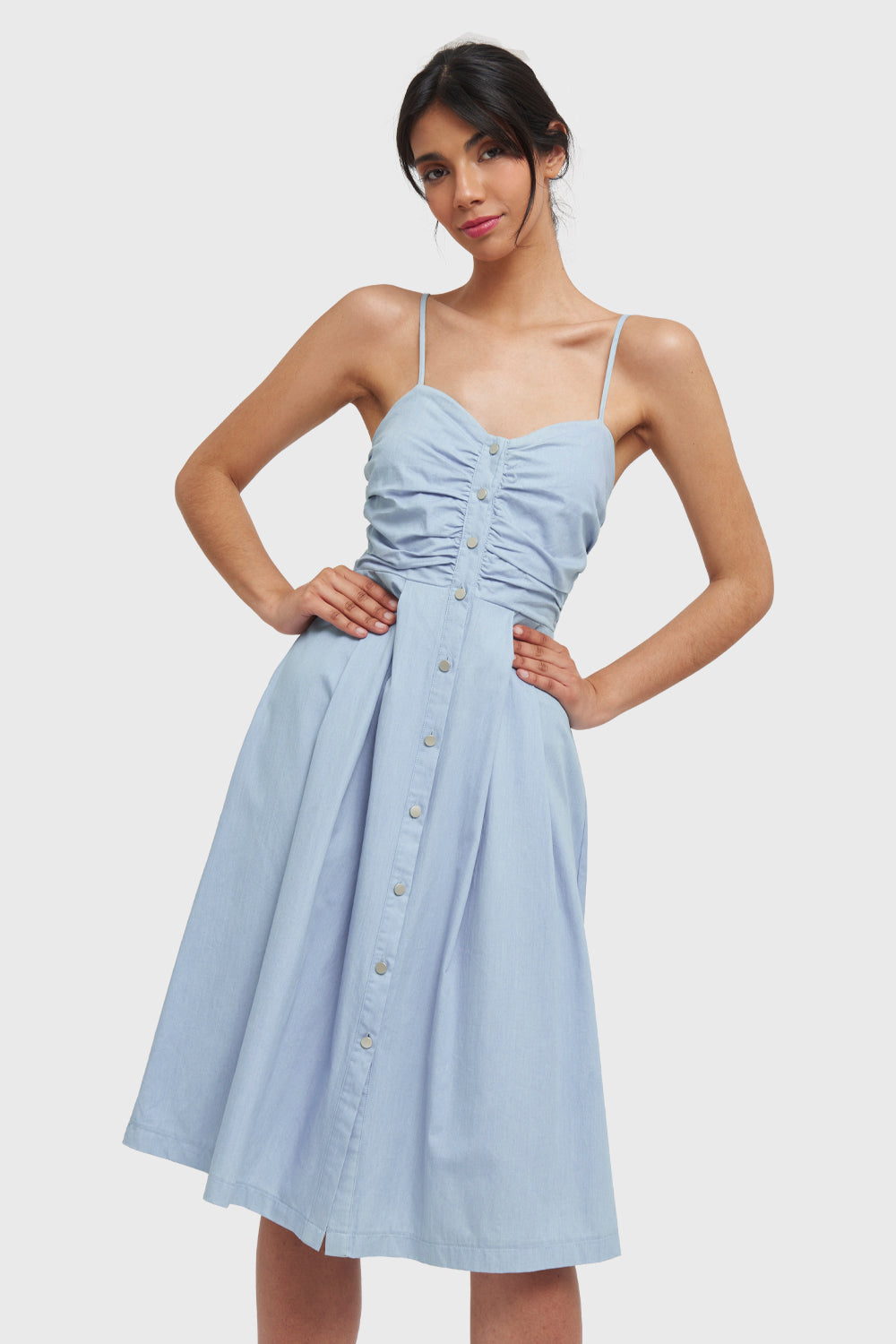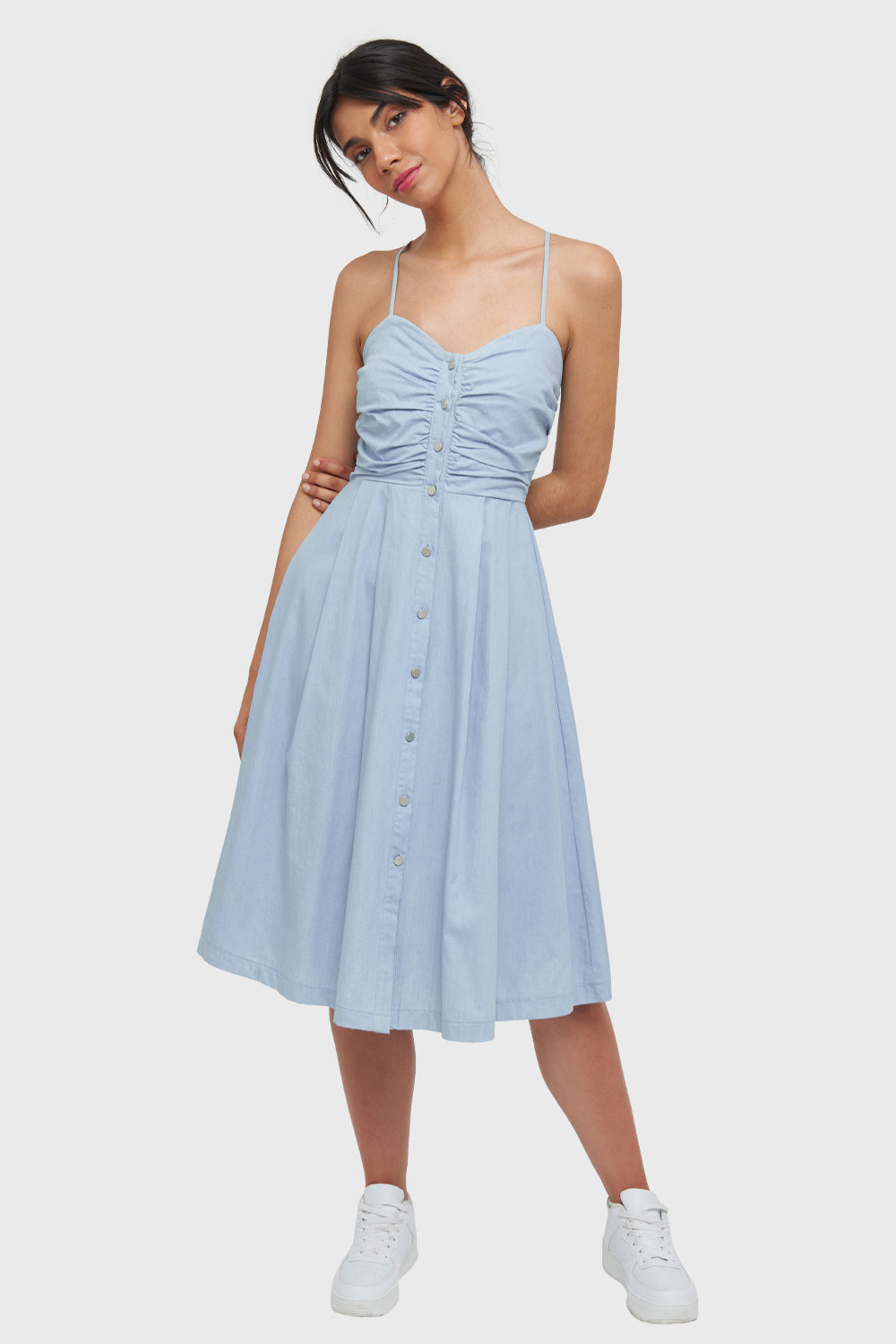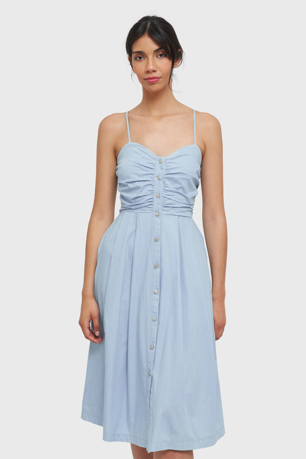 Características: Vestido midi escote corazón tipo denim con botones metalizados delanteros de ajuste. Busto con drapeado. Tirante pabilo ajustables y elastico en espalda.