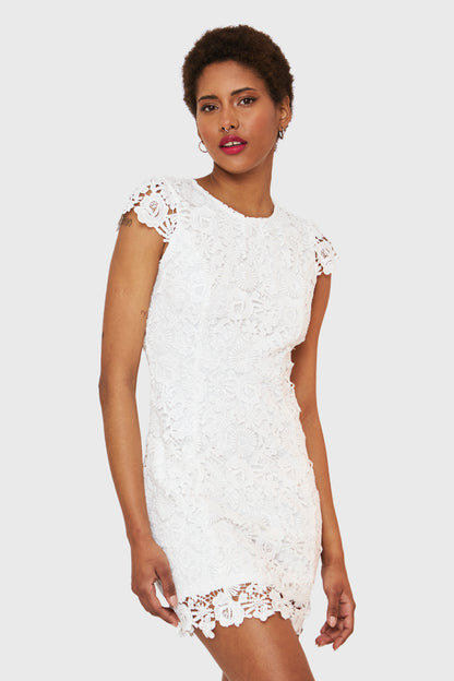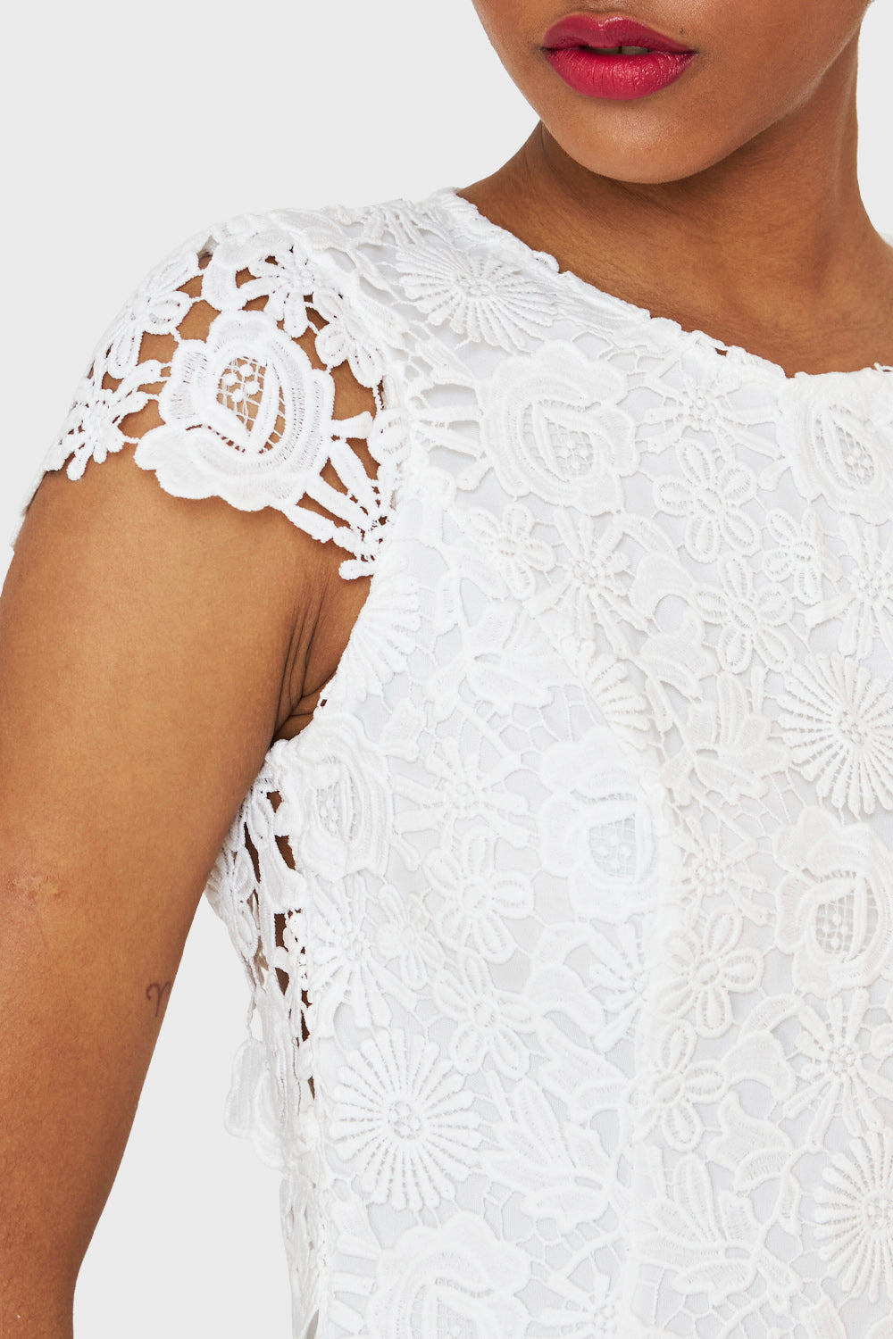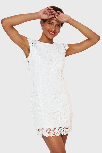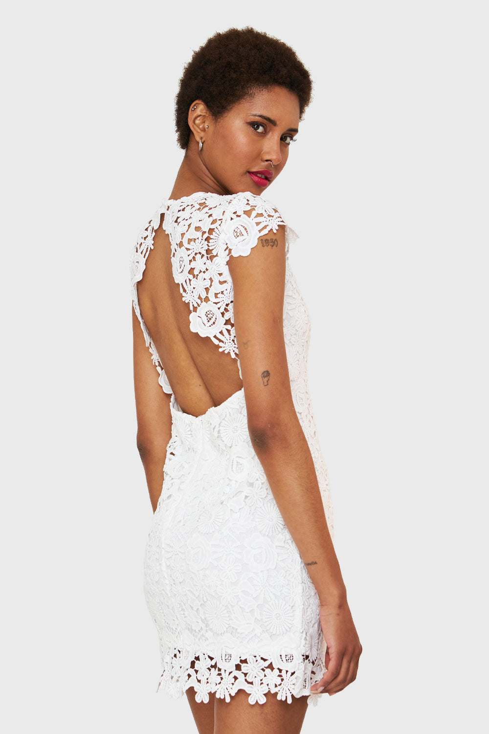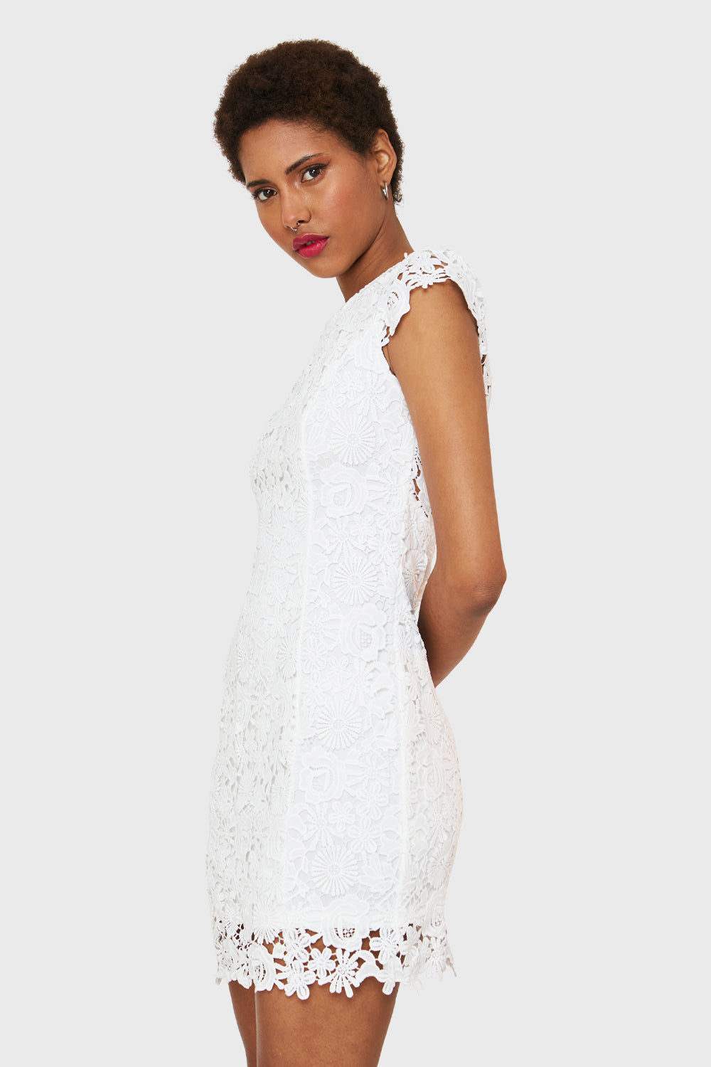 Características: Vestido calado floral tipo broderie con forro y abertura en espalda. Posee cierre invisible en la parte posterior y botón de ajuste en cuello.