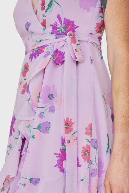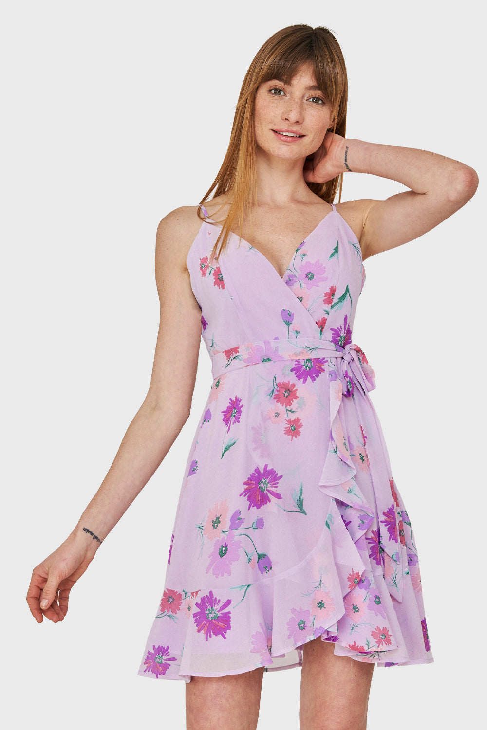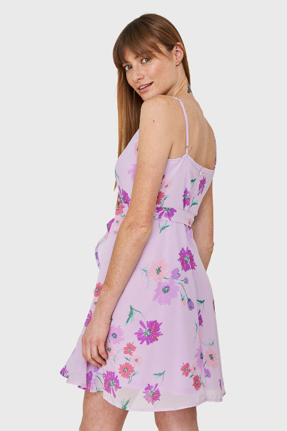 Características: Vestido corto estampado flores con lazo de ajuste y cierre invisible en espalda. Posee forro y tirantes ajustables. Vuelo que rodea el faldón.