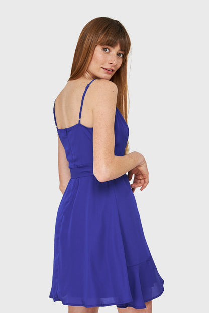 Características: Vestido corto con escote cruzado. Faldon con corte tulipán y volantes. Lazo en cintura y cierre invisible en la espalda. Posee forro