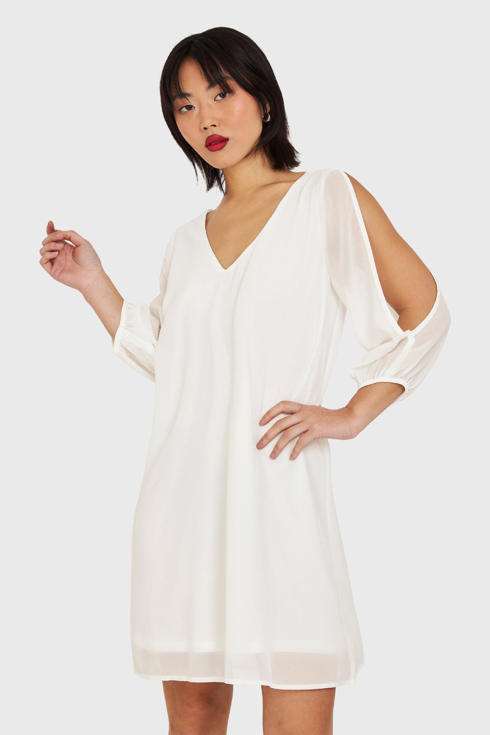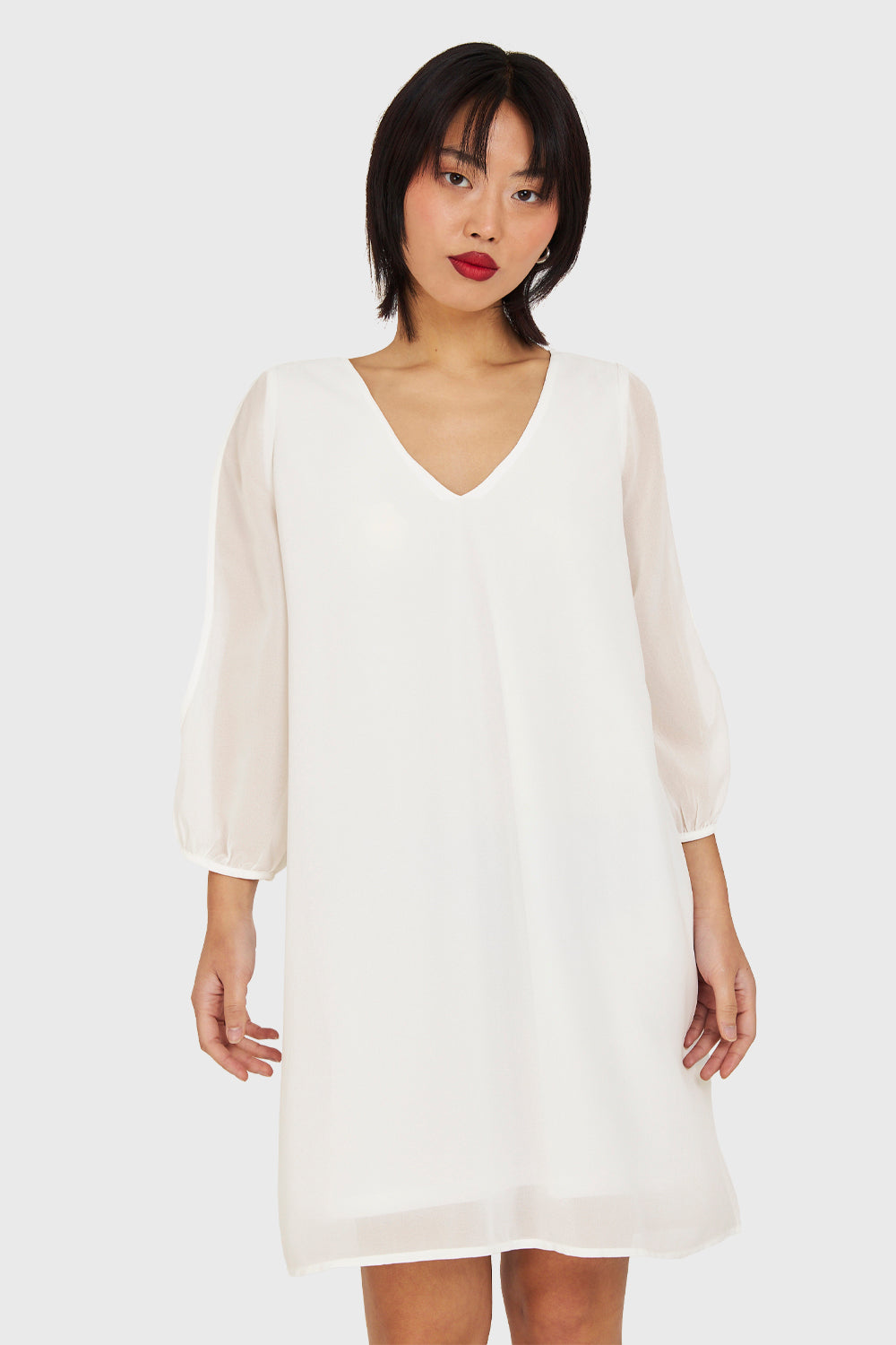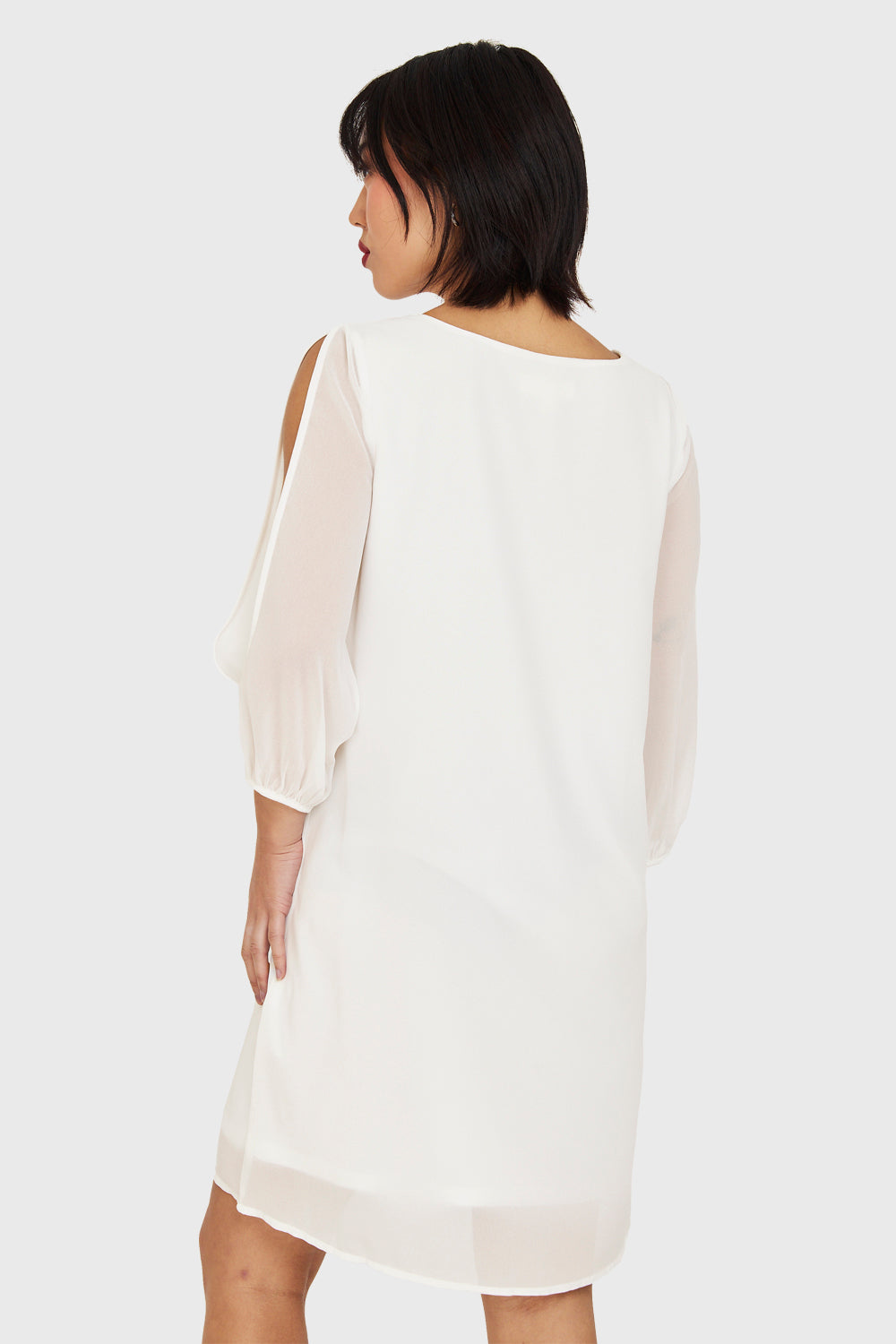 Características: Vestido corte recto con mangas 3/4 transparentes y cut out en estas. Posee forro.