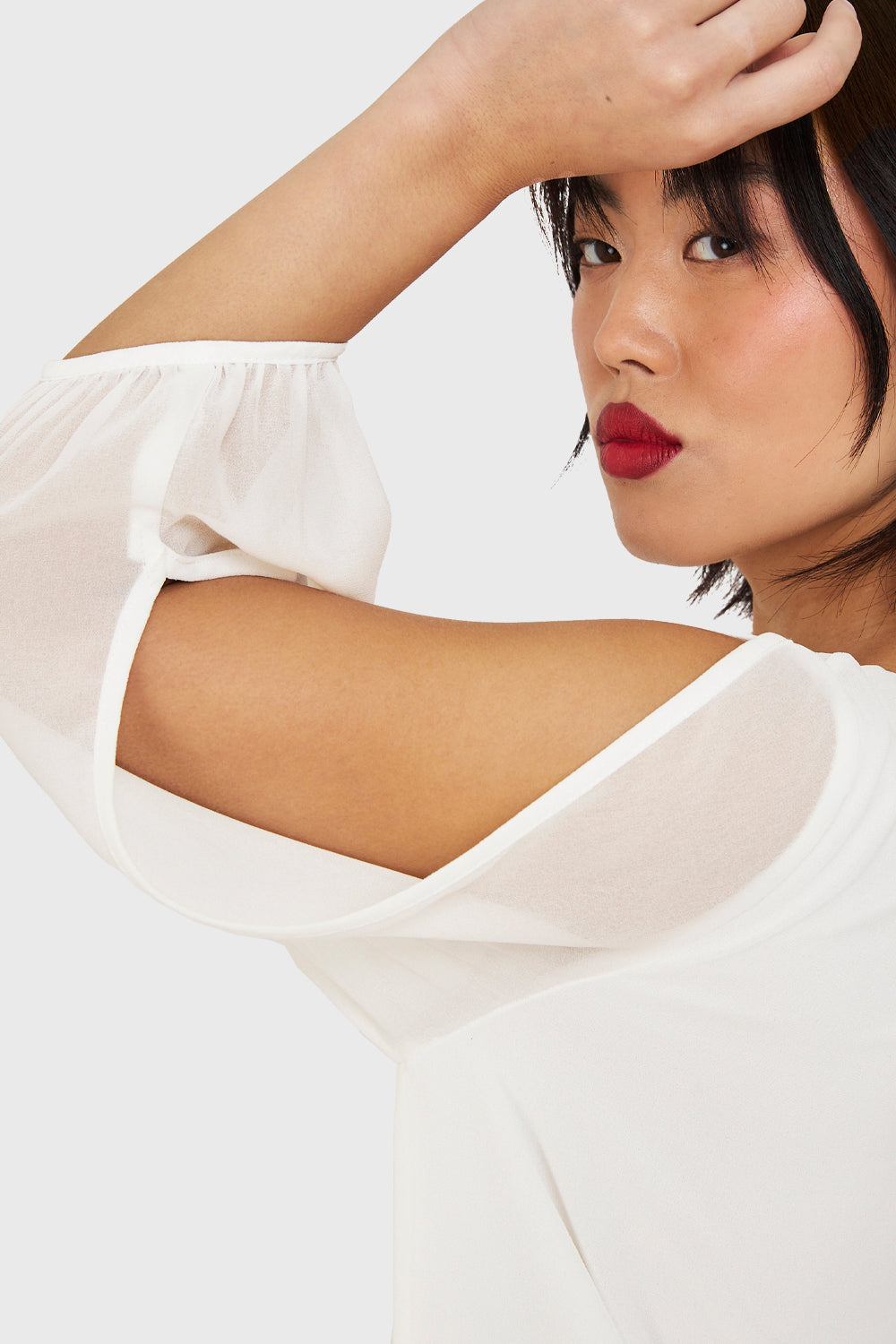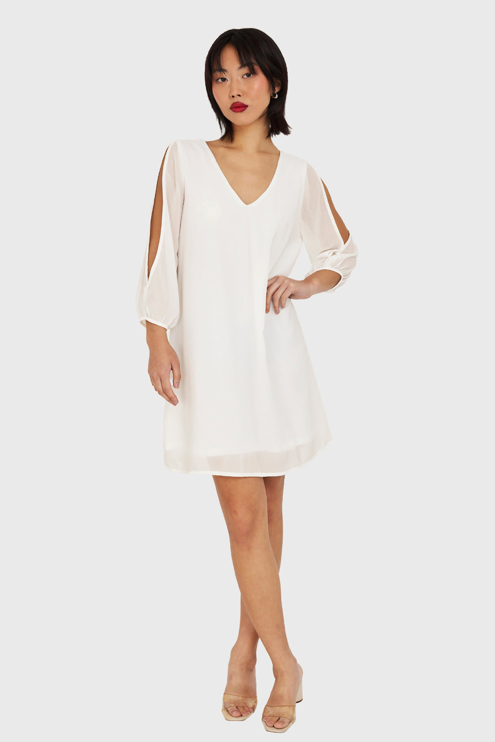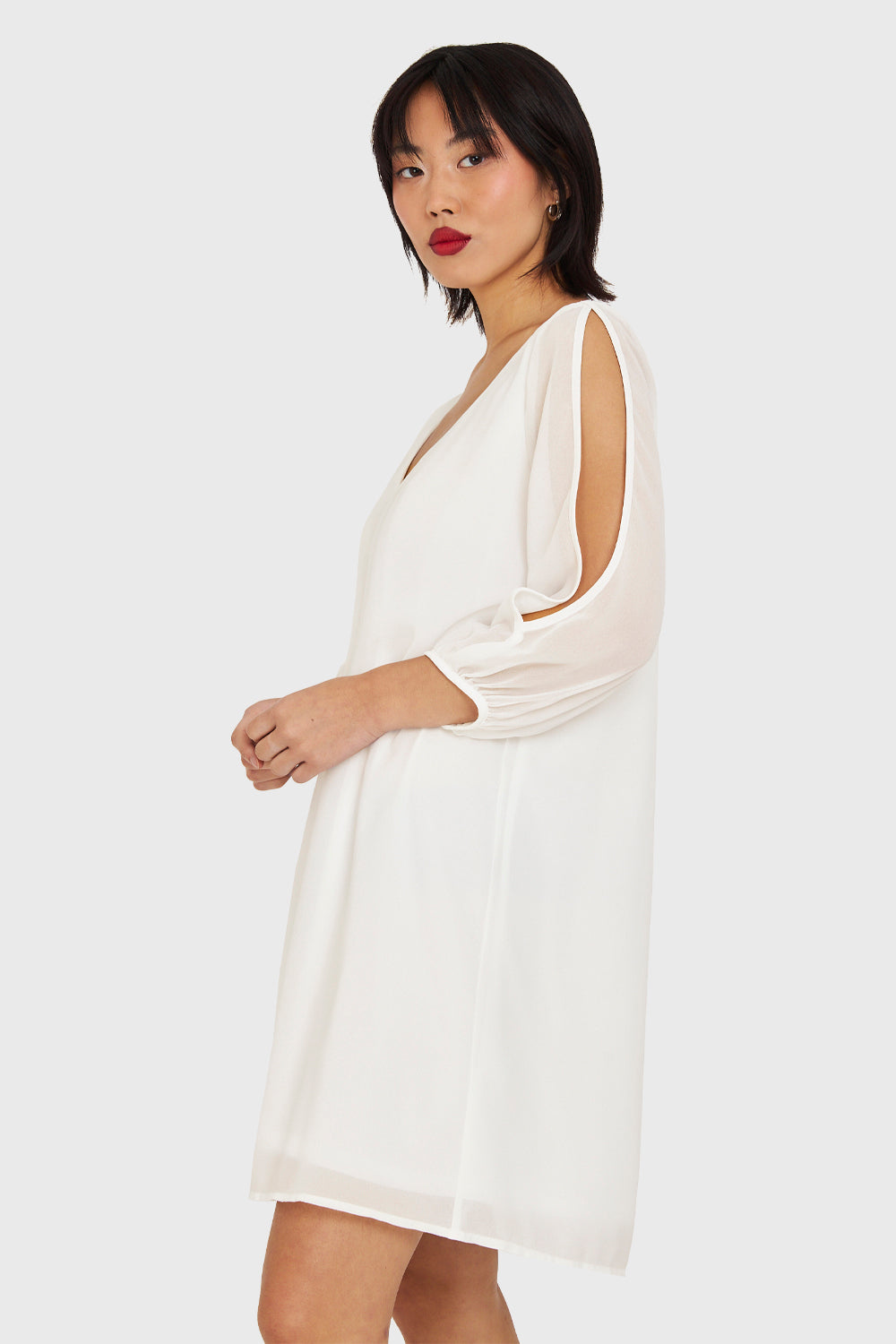 Características: Vestido corte recto con mangas 3/4 transparentes y cut out en estas. Posee forro.