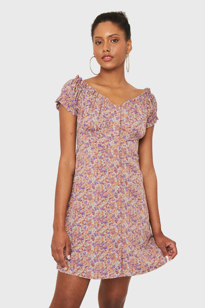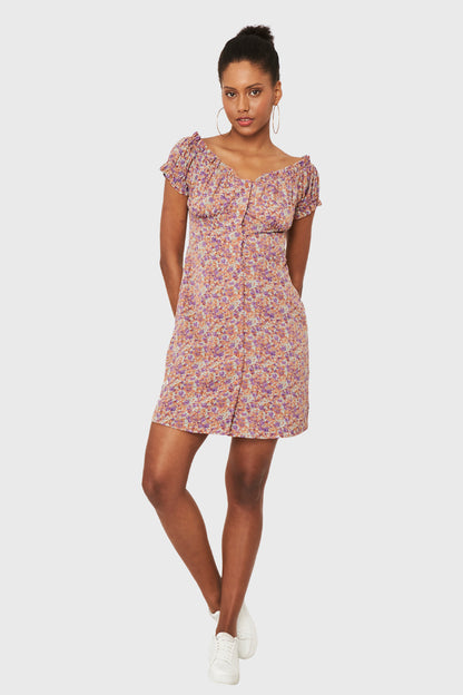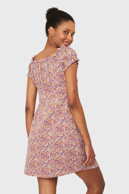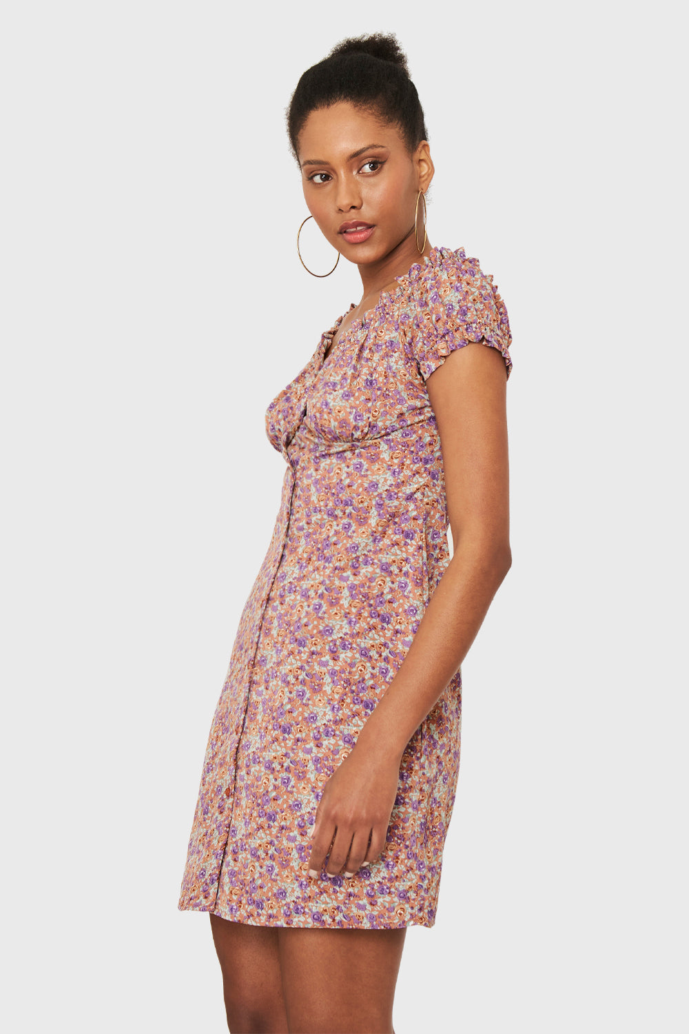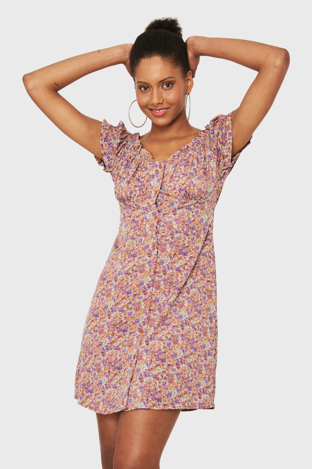 Características: Vestido corto con botones de ajuste print floral. Elástico por todo el escote y espalda. Manga corta con elástico en puño.