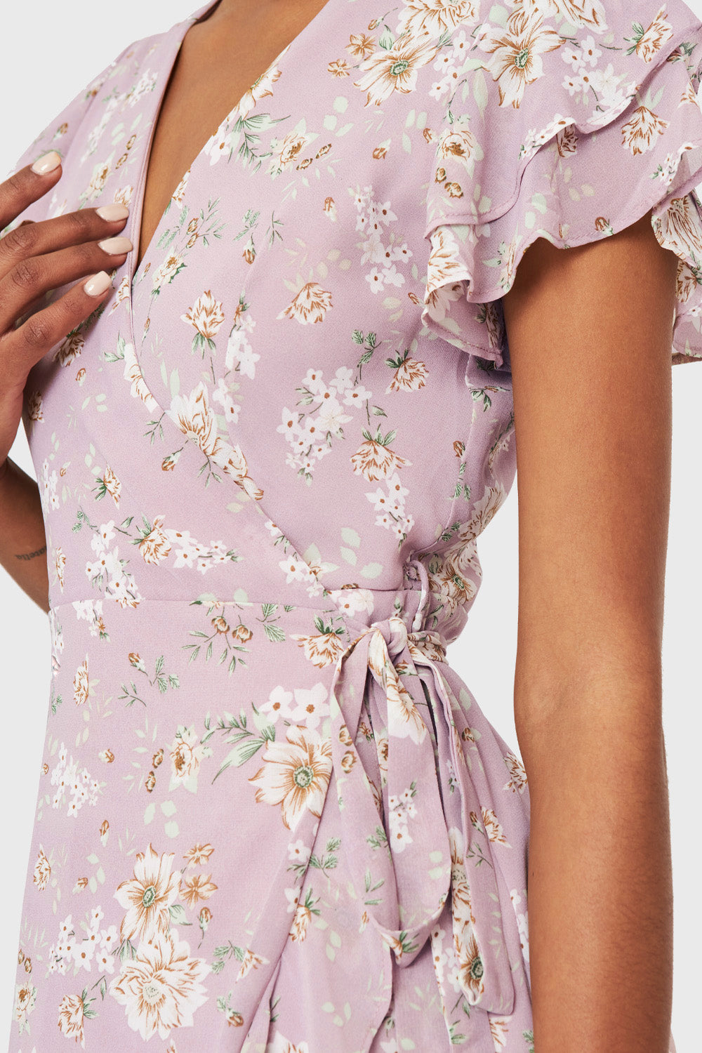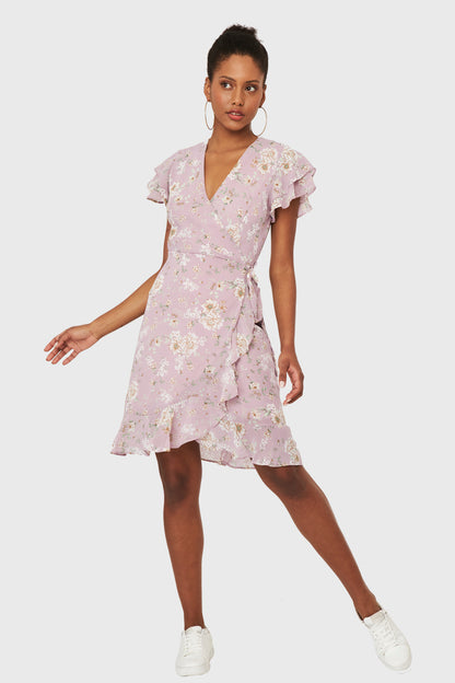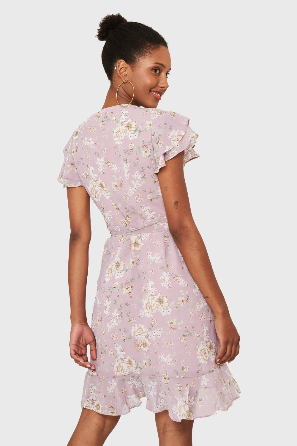 Características: Vestido corto envolvente con estampado floral. Escote en V. Manga corta con terminación de vuelos. Lazo de cierre y ajuste en la cintura. Posee forro.