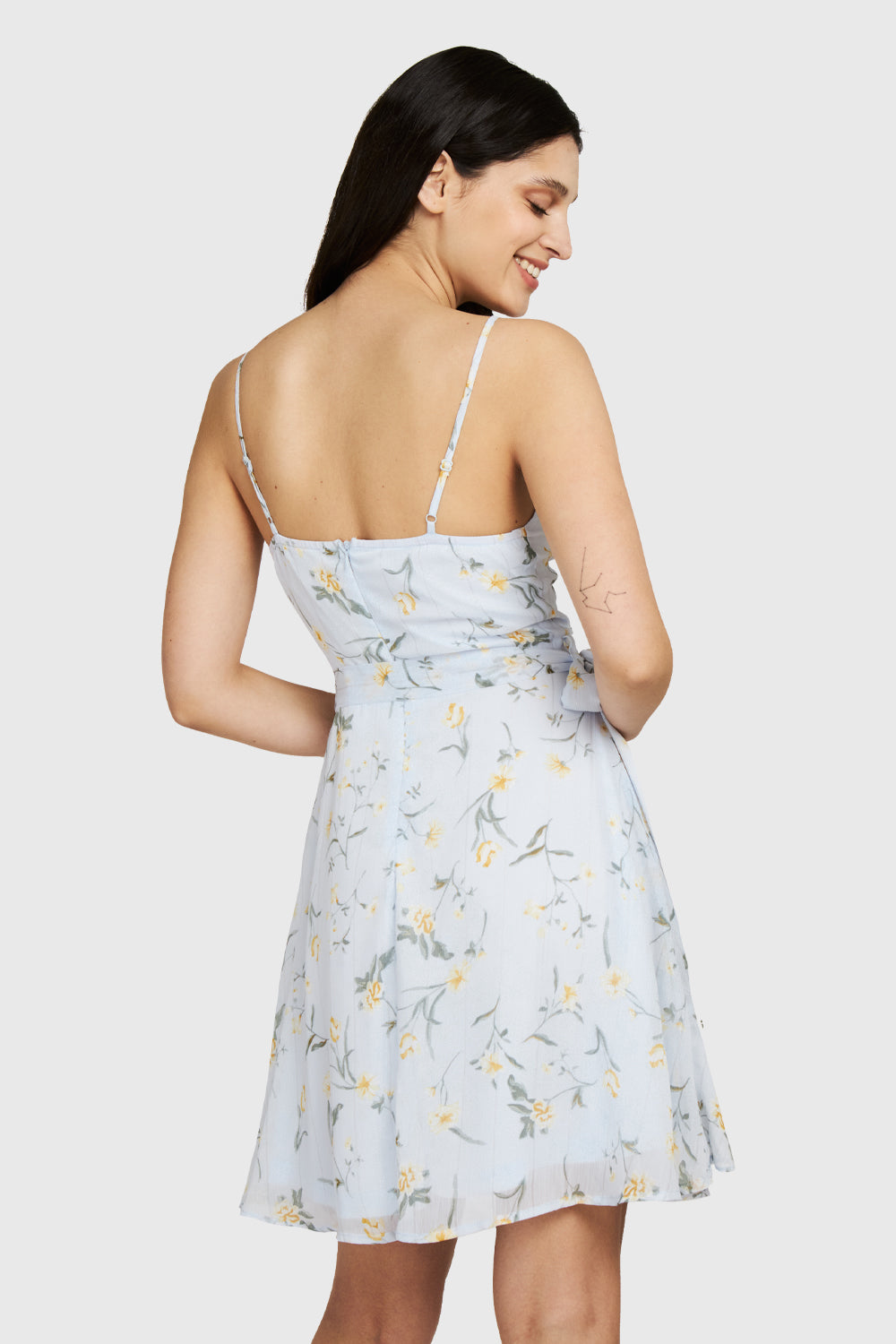 Características: Vestido corto con tirantes estilo pabilo ajustables print floral. Cierre invisible en espalda. Presillas en la cintura para el lazo de ajuste. Faldón con vuelos que da un efecto cruzado. Posee forro.