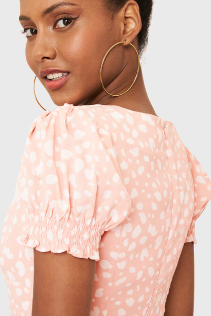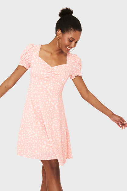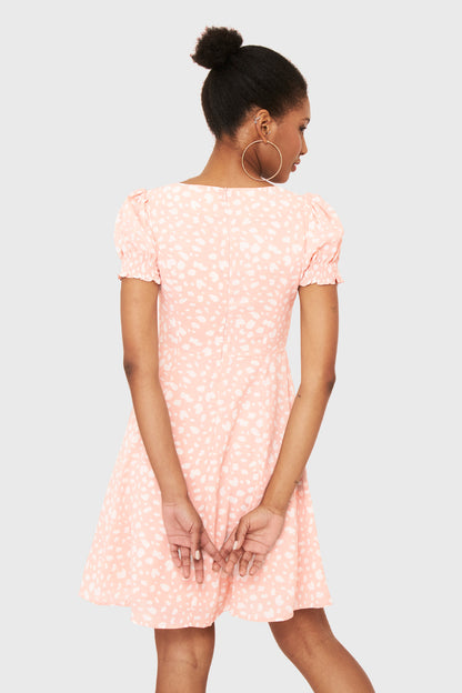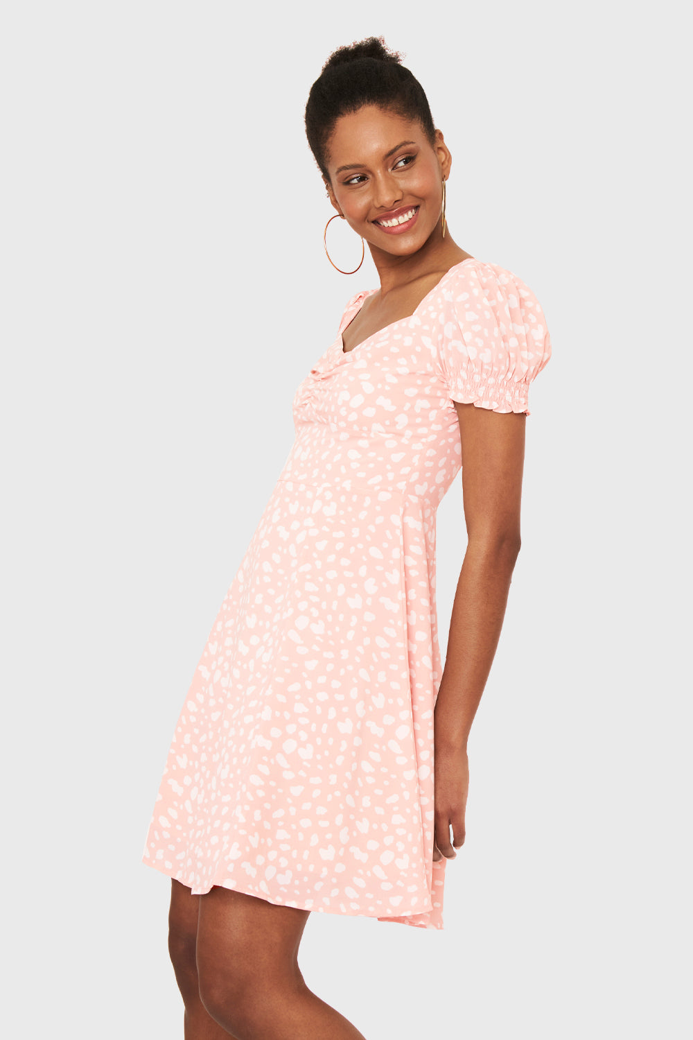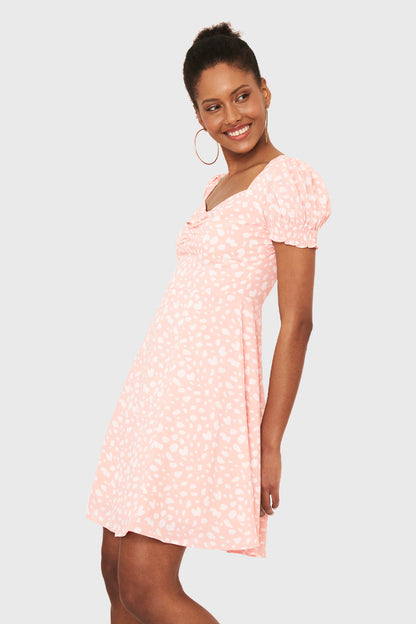 Características: Vestido corto, manga corta estilo Julieta. Estampado estilo dálmata. Recogido decorativo en busto. Escote tipo corazón. Cierre invisible en espalda. Posee forro.