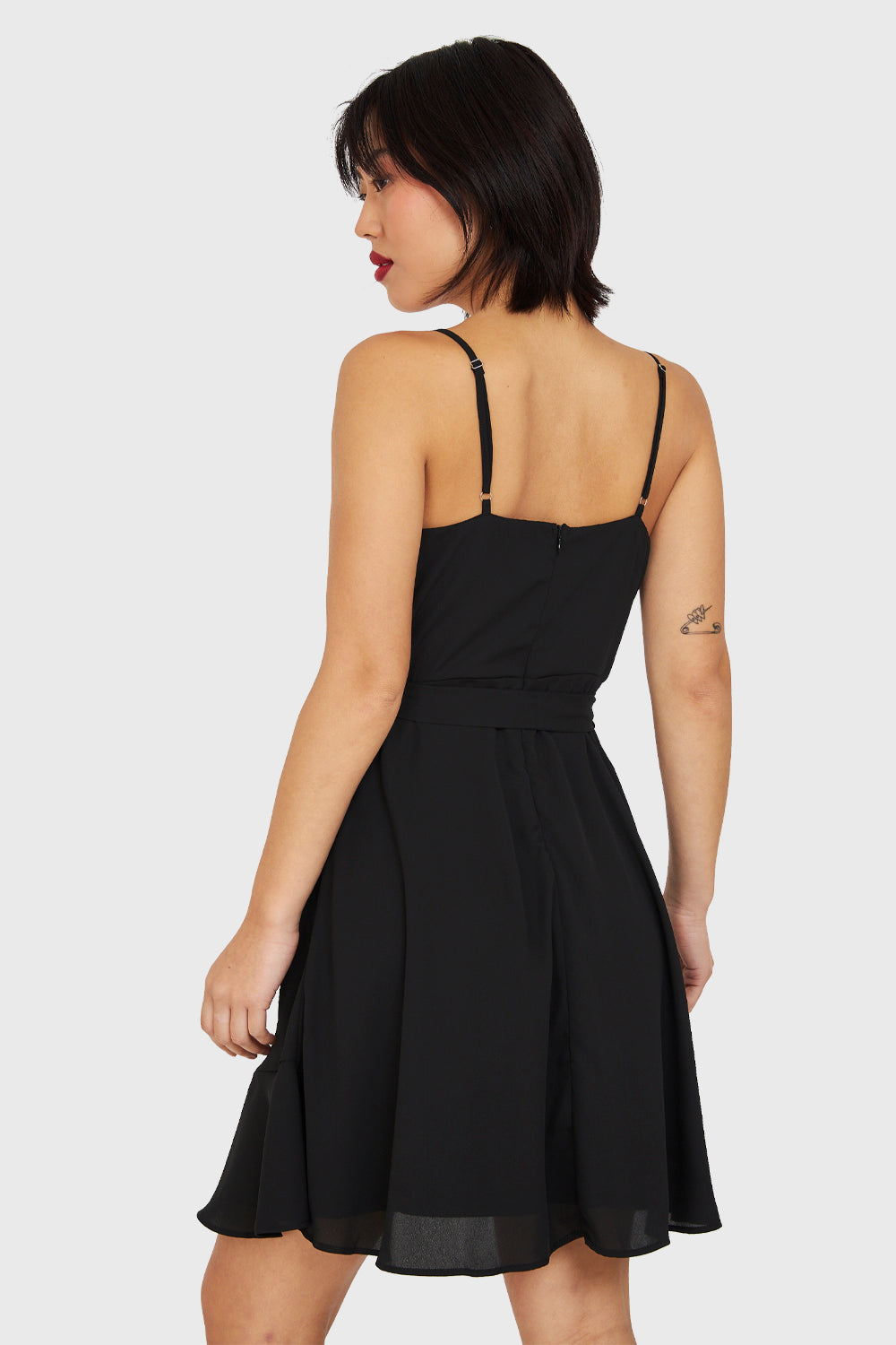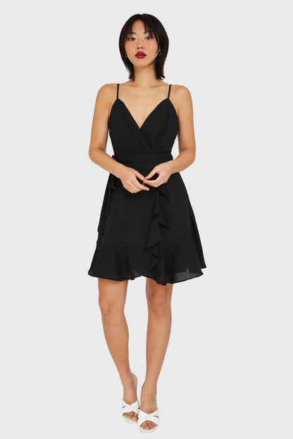 Características: Vestido corto con escote cruzado. Faldon con corte tulipán y volantes. Lazo en cintura y cierre invisible en la espalda. Posee forro