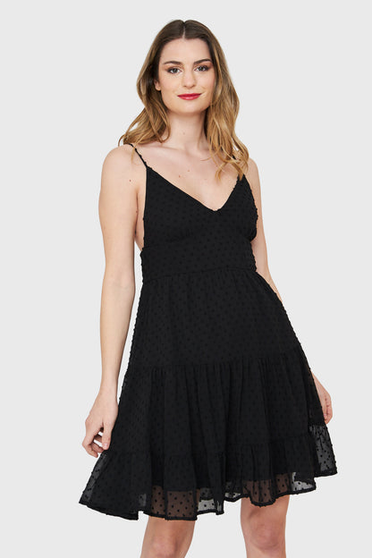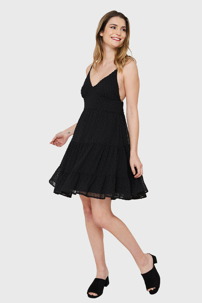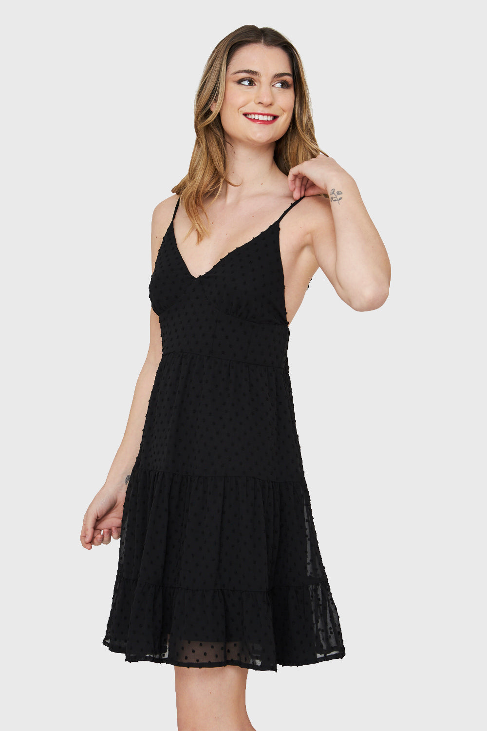 Características: Vestido corto escote V con volantes, corte campana, cierre invisible en espalda, forro y tirantes ajustables.