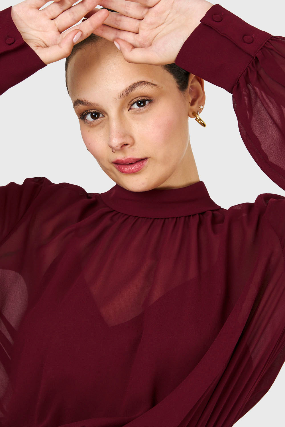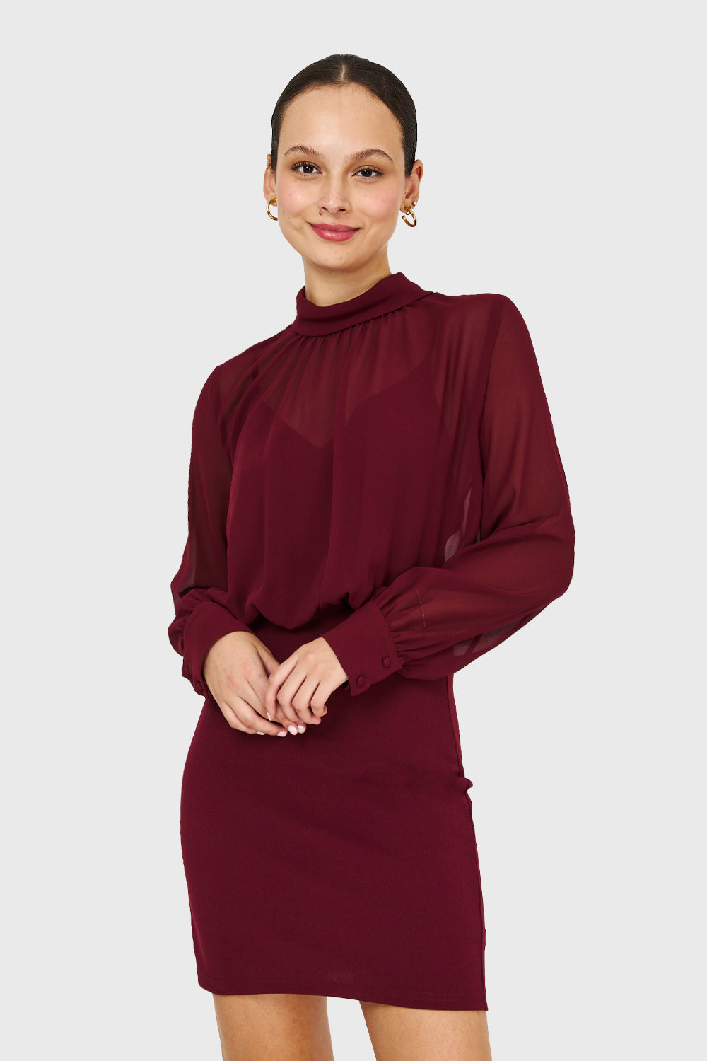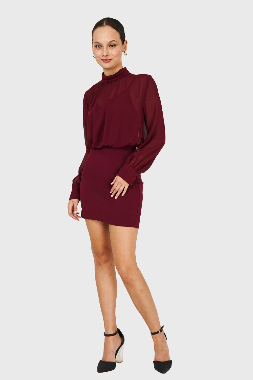 Características: Vestido cuello mock y manga larga. Puños con botones. Parte superior de gasa traslucida. Tiene una polera pabilo interior. Cierre invisible en la espalda y 2 botones de ajuste en el cuello. La falda es elasticada y tiene forro.