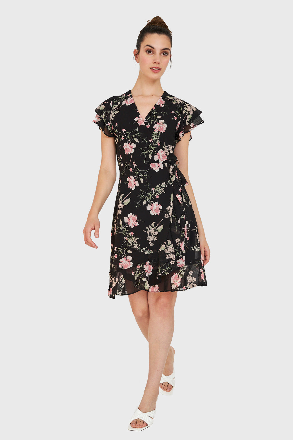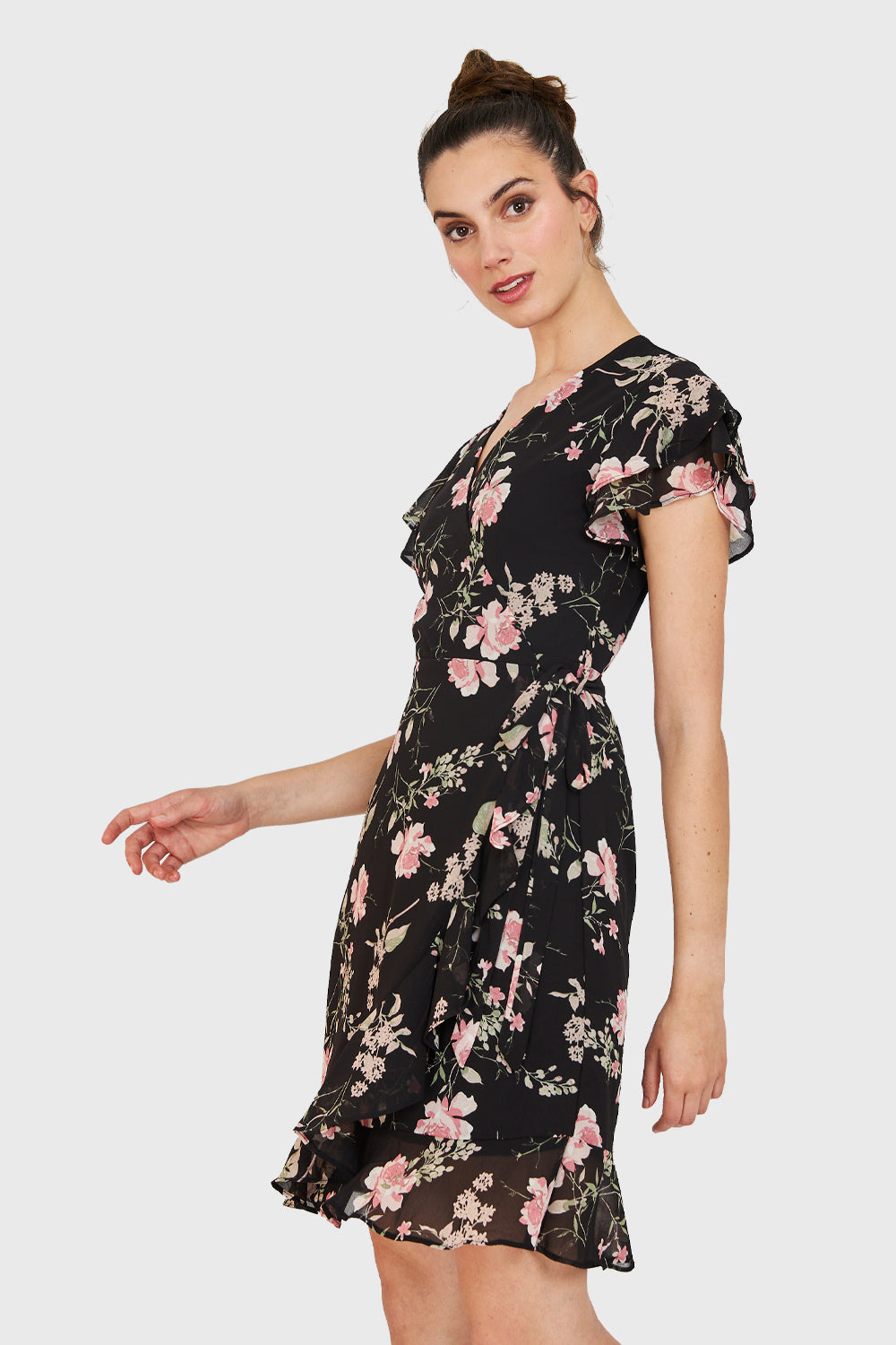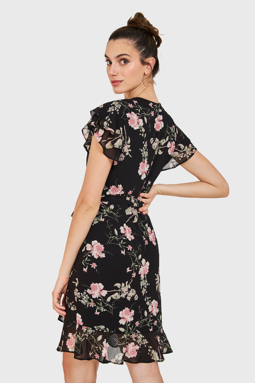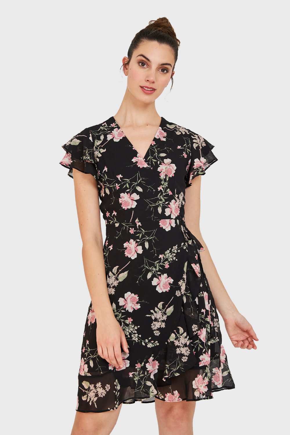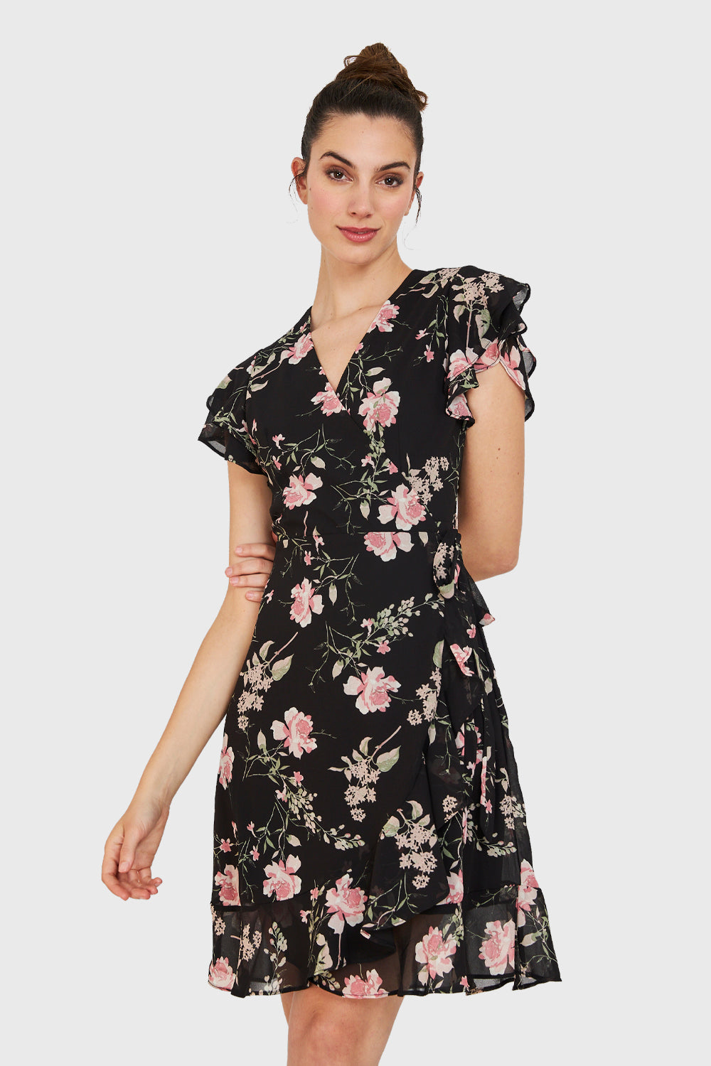 Características: Vestido corto envolvente con estampado floreado. Vuelos en las mangas. Posee un lazo que rodea la cintura y se une con el lazo frontal, formando el efecto de escote cruzado. Tiene forro.