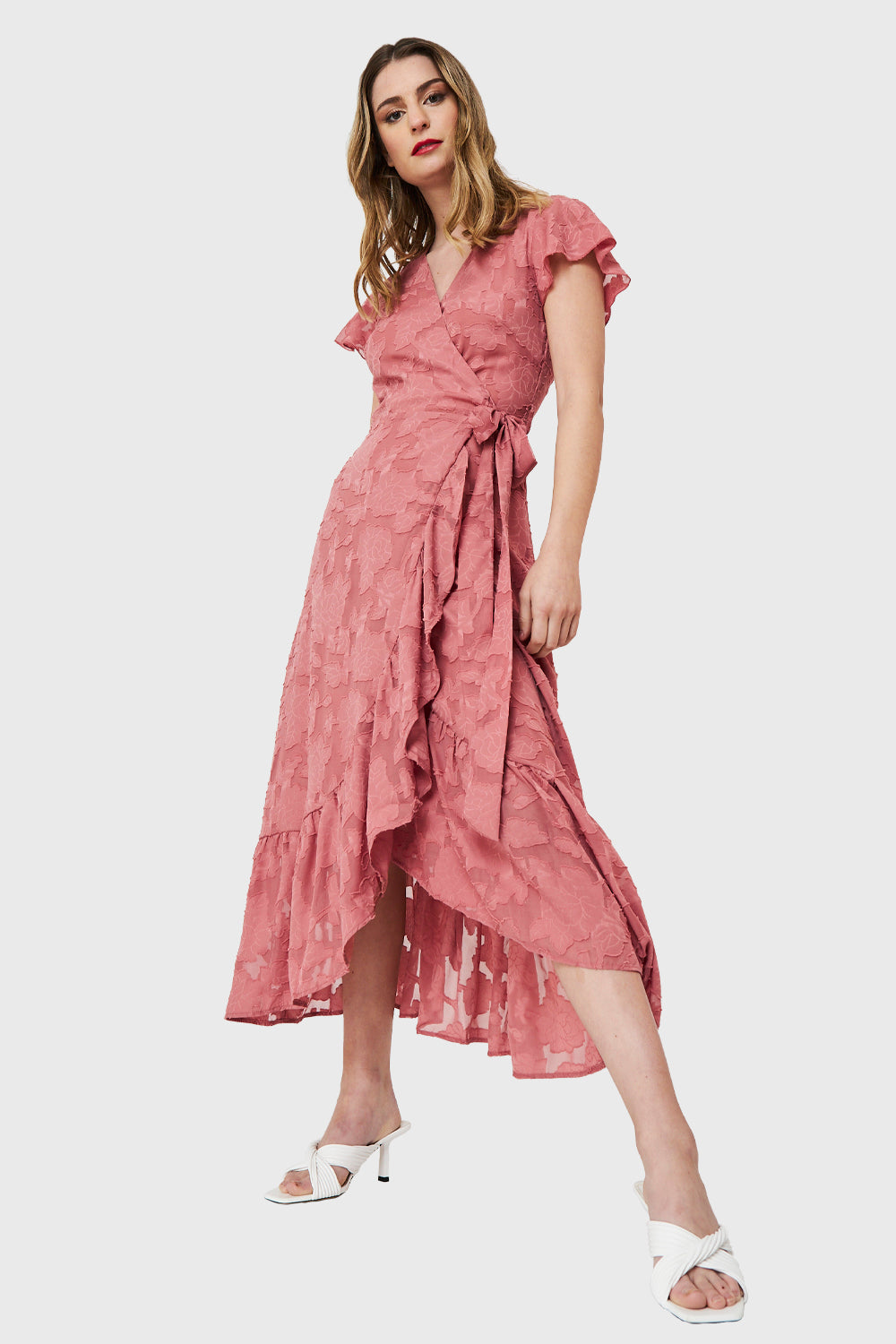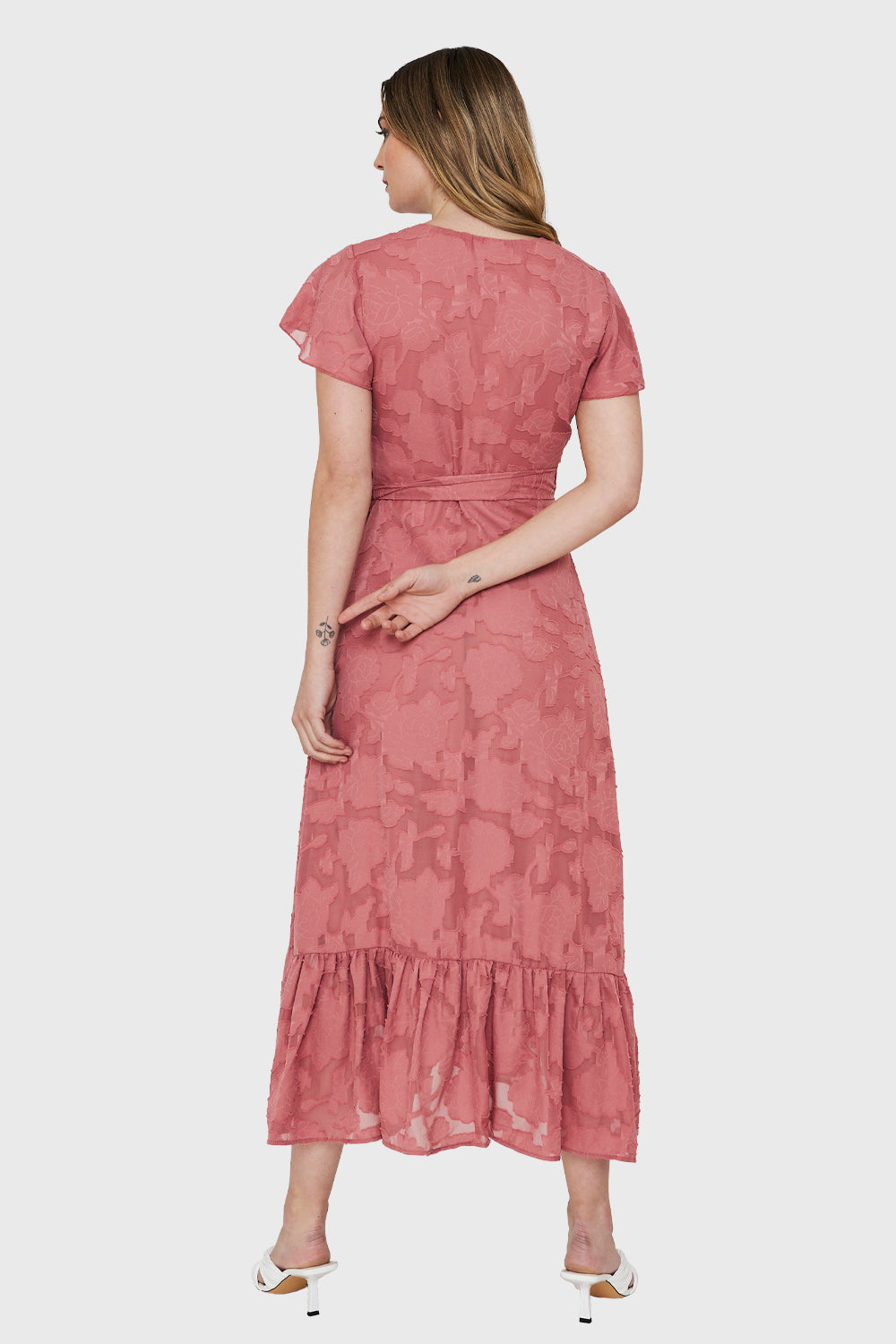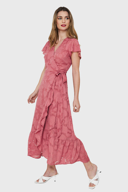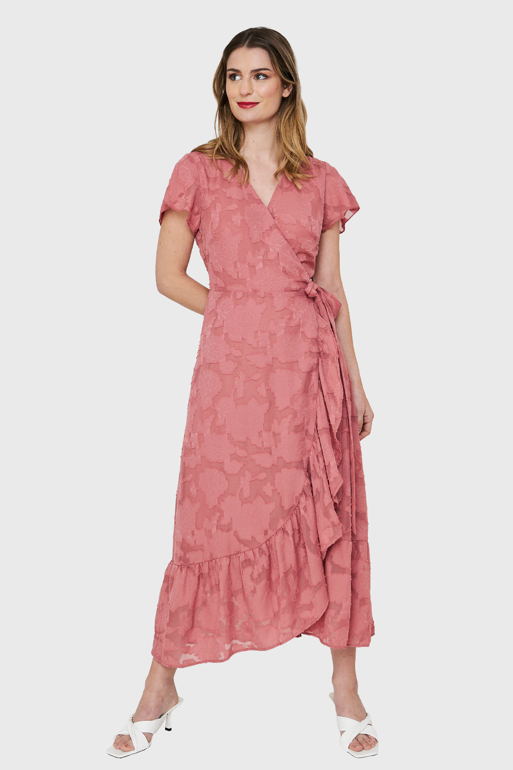 Características: Vestido largo envolvente con tela floral y lazo interior de ajuste. Manga corta con botón de ajuste en busto. Posee vuelo frontal y forro.