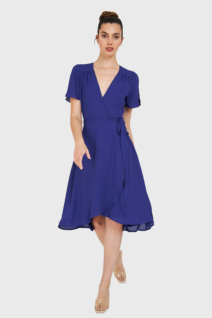 Características: Vestido midi envolvente con lazo de ajuste, posee un agujero para pasar uno de los lazos de forma interna y una presilla para el lazo exterior. Posee forro, escote V profundo y manga corta con abertura.