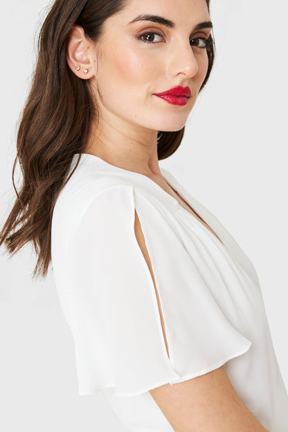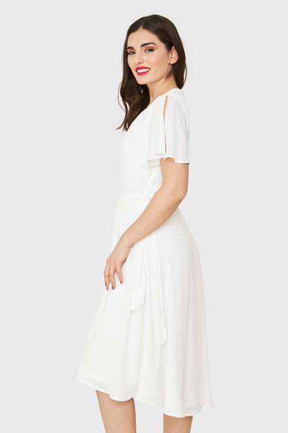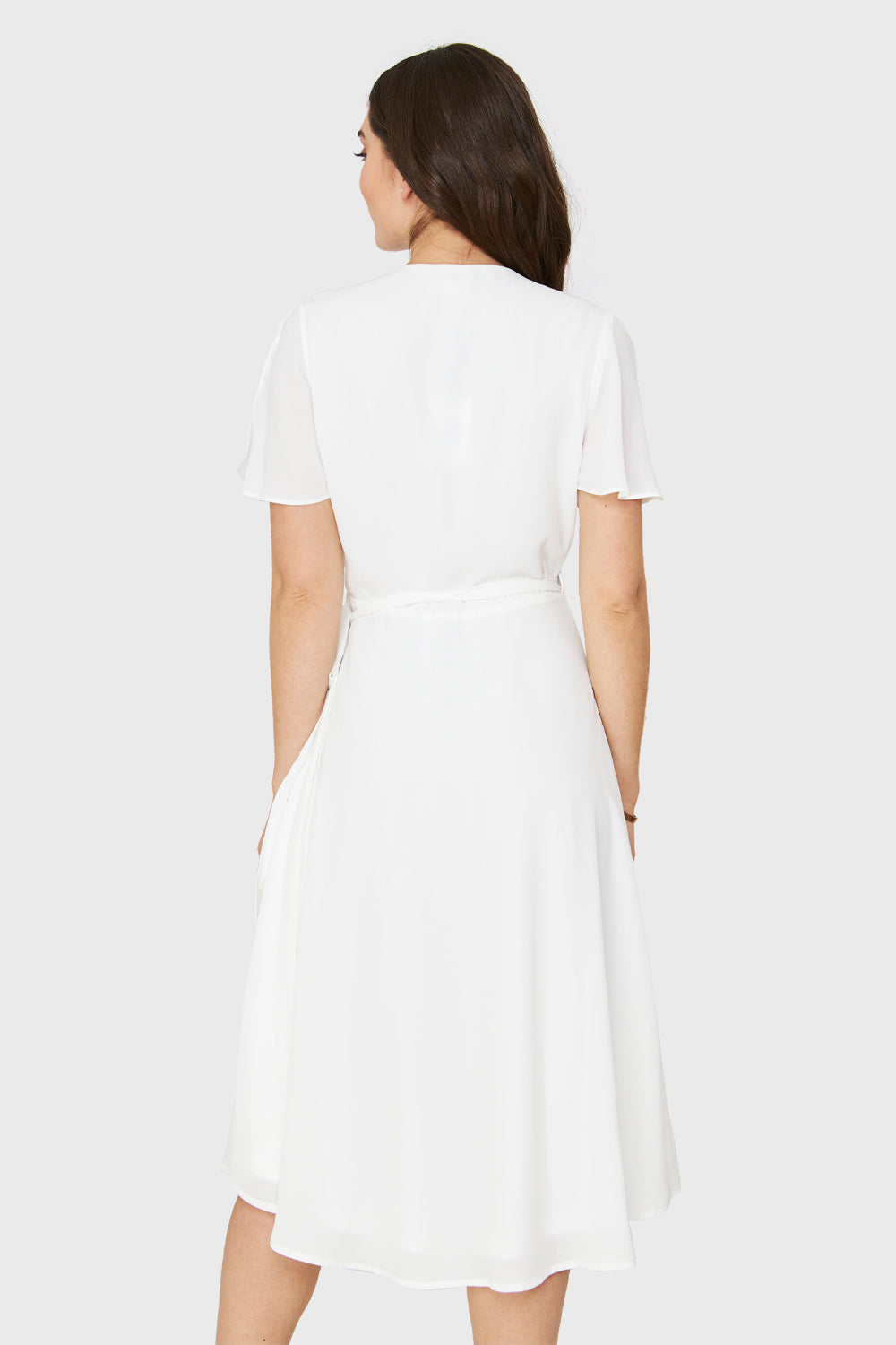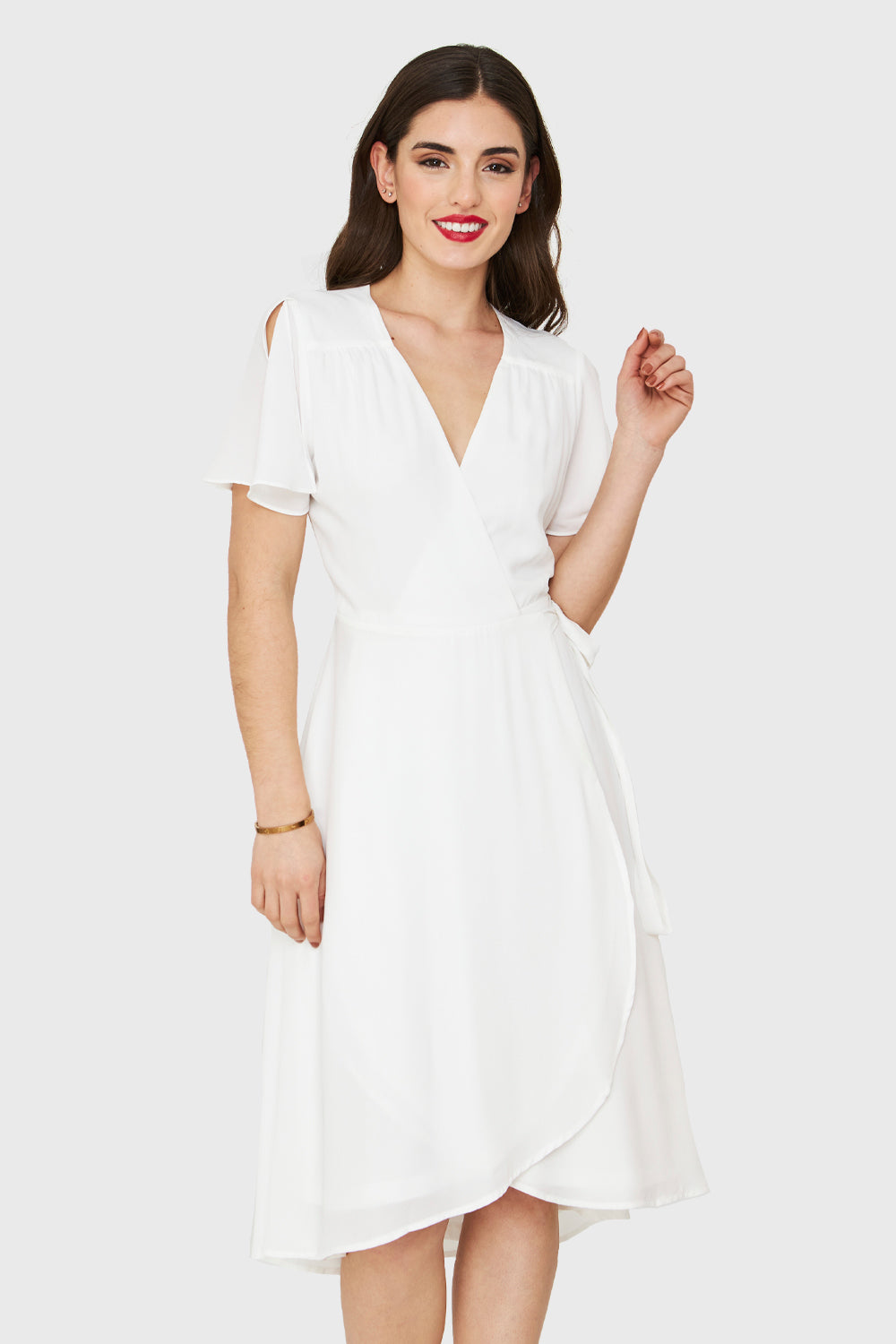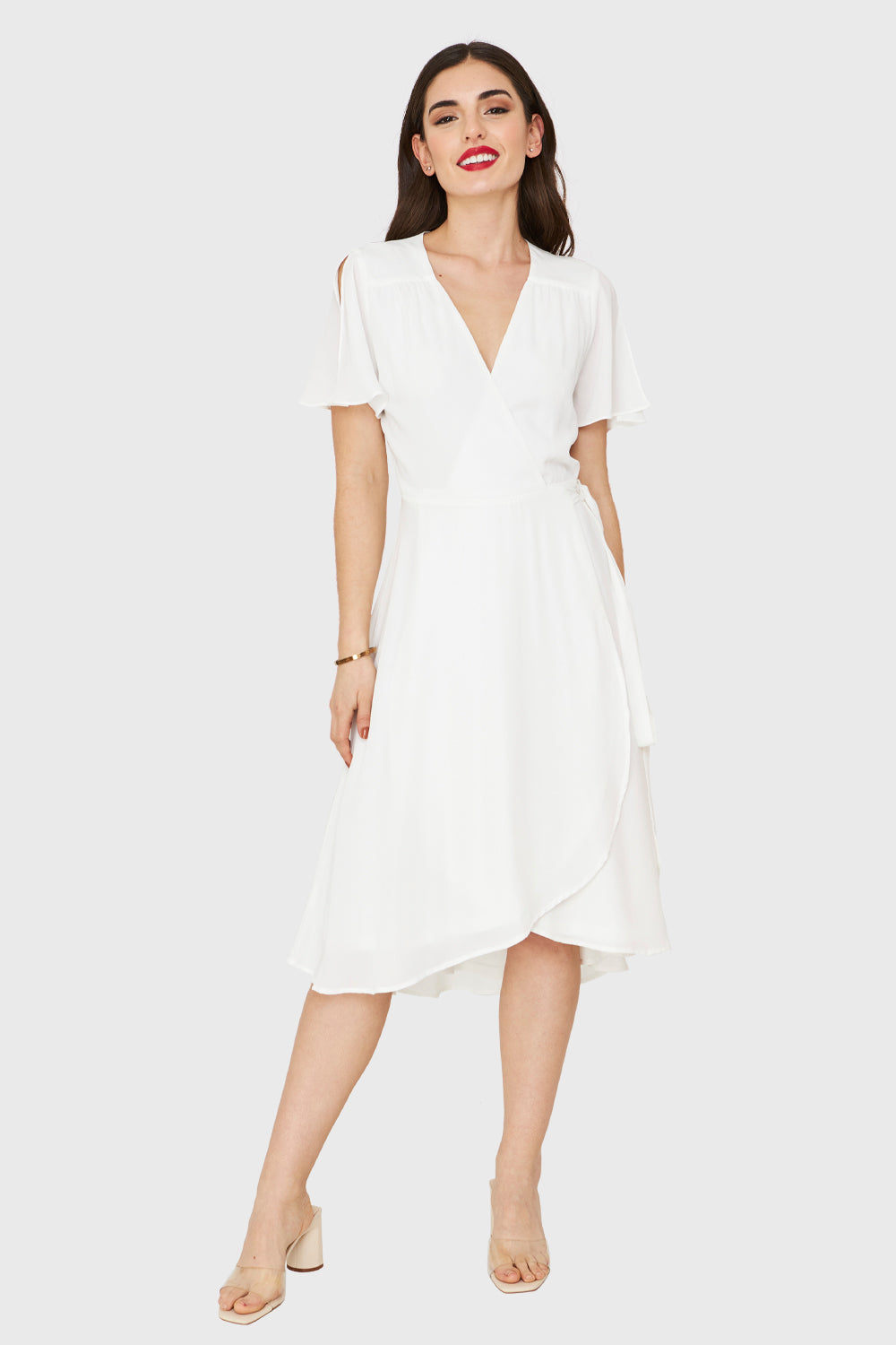 Características: Vestido midi envolvente con lazo de ajuste, posee un agujero para pasar uno de los lazos de forma interna y una presilla para el lazo exterior. Posee forro, escote V profundo y manga corta con abertura.