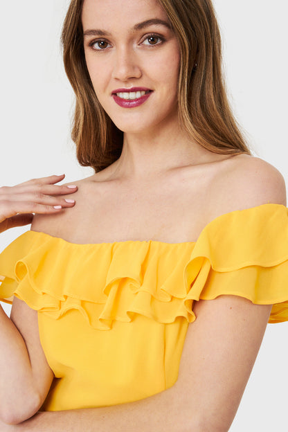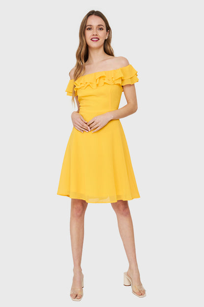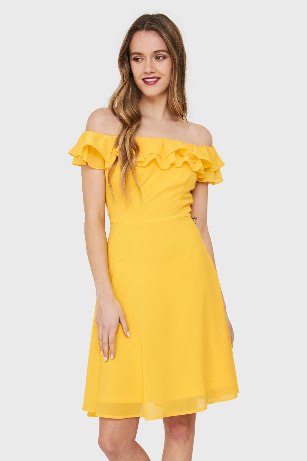Características: Vestido midi escote elasticado con vuelo, cierre invisible en espalda. Posee forro.