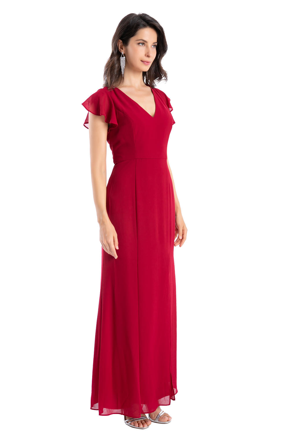 Características: Vestido fiesta con abertura en la pierna. Vuelos en la parte de las mangas. Espalda escote V con lazo de amarre. Cierre invisible en espalda. Posee forro.