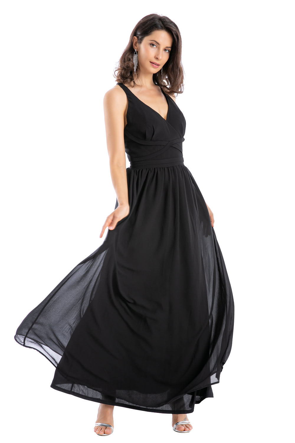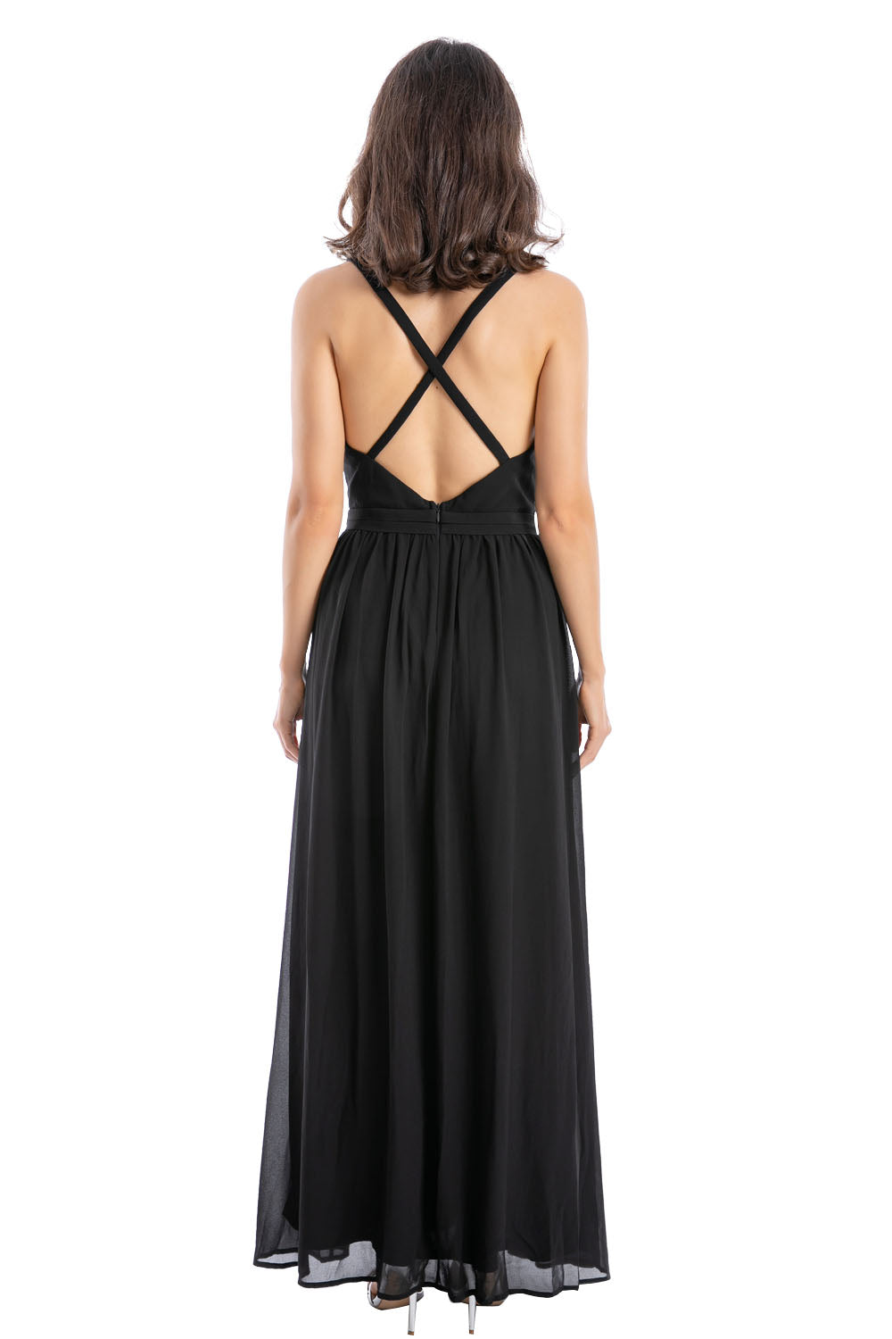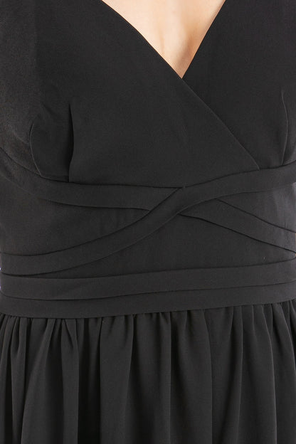 Características: Vestido de fiesta con detalles en la parte abdominal de sesgo. Escote V profundo. Posee relleno de copa. Espalda cruzada descubierta. Cierre invisible en espalda. Posee forro